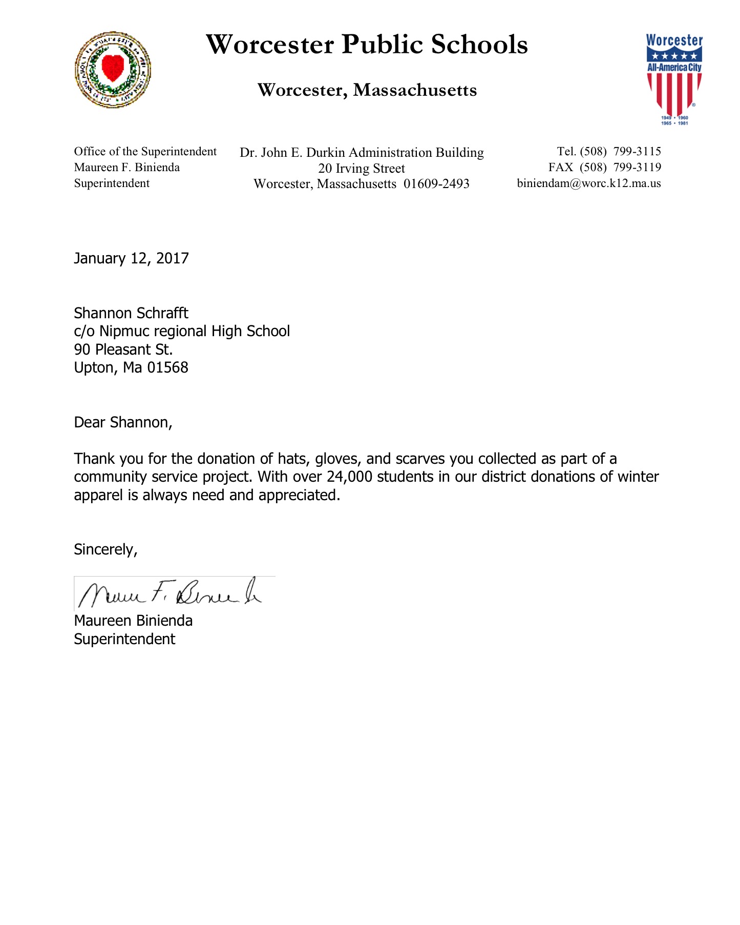 After completing this project, my eyes have been opened to all the less fortunate students and families in our community. It warmed my heart when giving the kids these hats and gloves as I knew they would be putting them to great use this winter. The smiles on their faces when recieving the new apparel were priceless. The administration members of Worcester Public Schools were very thankful for the drive I put together and told me they do not receive donations this large that often so it would really help their community. I am happy to say I created and lead a successful donation that made an impact on the Worcester community.