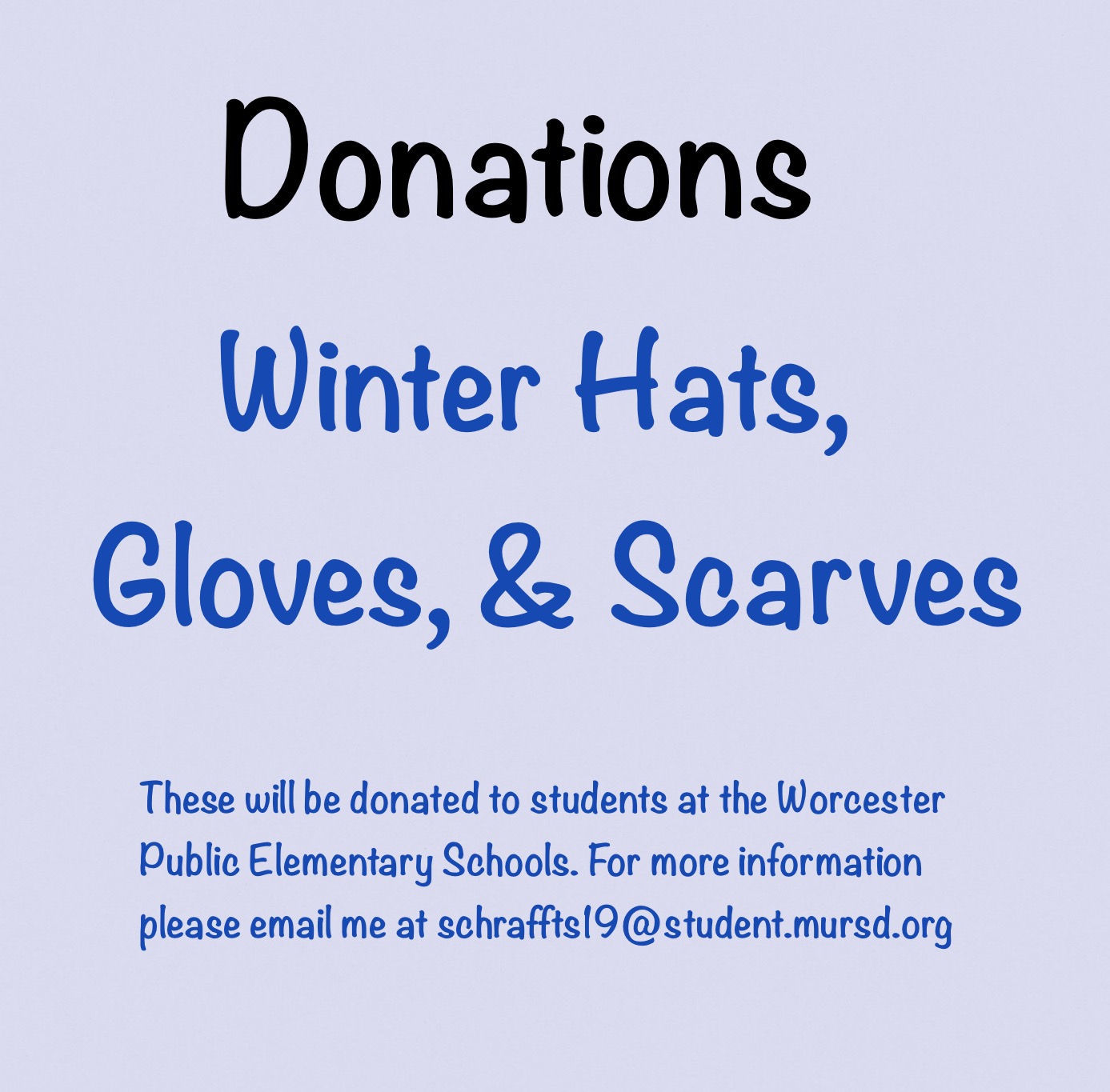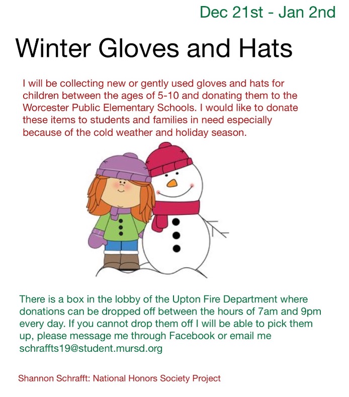 Over the past few weeks I have been collecting new or gently used hats, gloves, and scarves, to donate to Worcester Public Schools. I first came up with this idea when the cold weather started to arrive because I knew some children are less fortunate than others and do not have the winter gear they need. I was looking for places or organizations to donate these items to and I thought, what was better than elementary schools in the city? Some children in Worcester walk to and from school while others have to walk to bus stops. I knew the children of Worcester would definetly use and need some new winter gear for this season. I called the administrative office of Worcester Public Schools and asked if they would like to receive the donations of my hats and glove drive. The woman happily accepted and told me she was very glad I put this together for the kids.