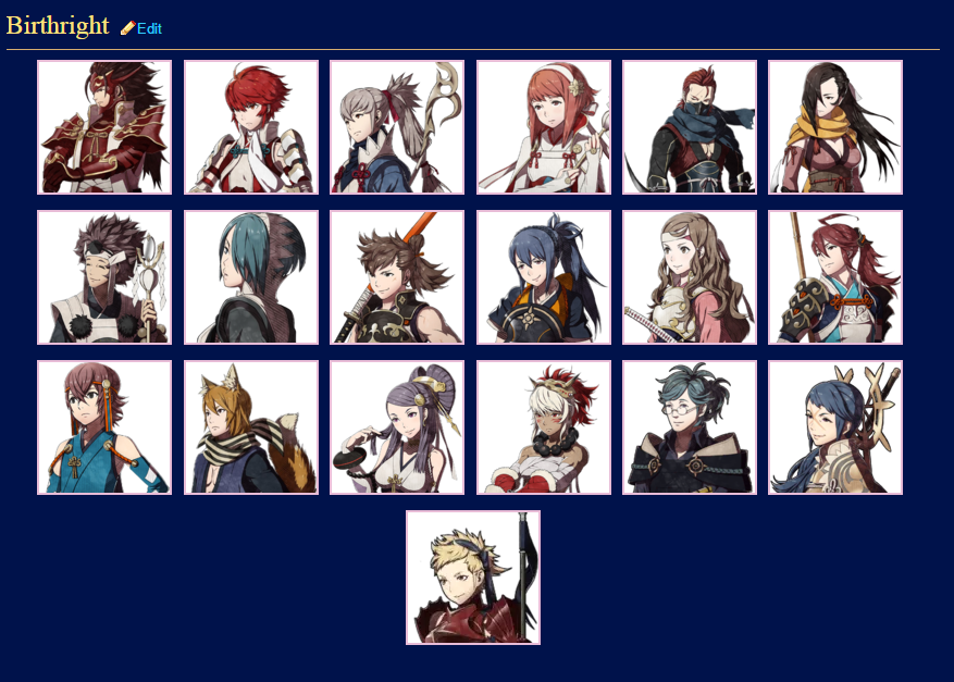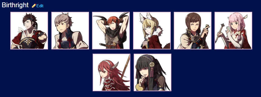 Ryoma, Hinoka, Takumi, Sakura, Saizo, Kagero, Azuma, Setsuna, Hinata, Oboro, Hana, Subaki, Hayato, Kaden, Orochi, Rinkah, Yukimura, Reina,Scarlet
