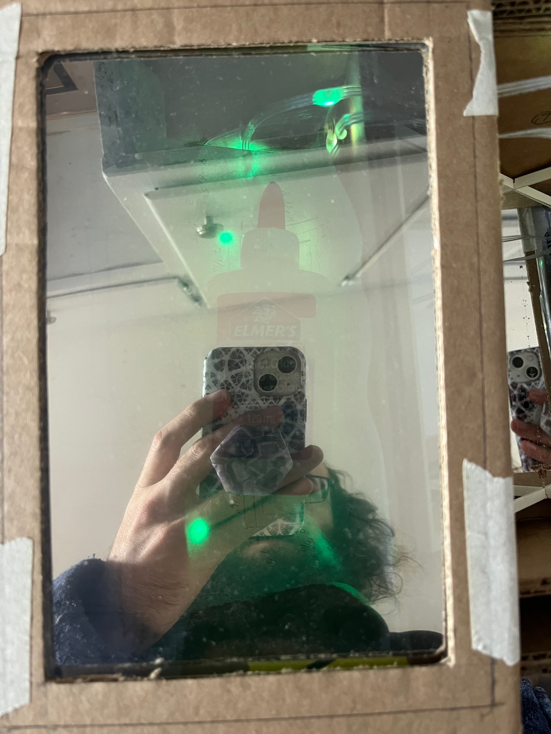 foam, cardboard, card stock, paper, mirrors, clear acrylic sheets, window tint film, LED lights, acrylic paint, colored pencil, gold leaf, craft moss