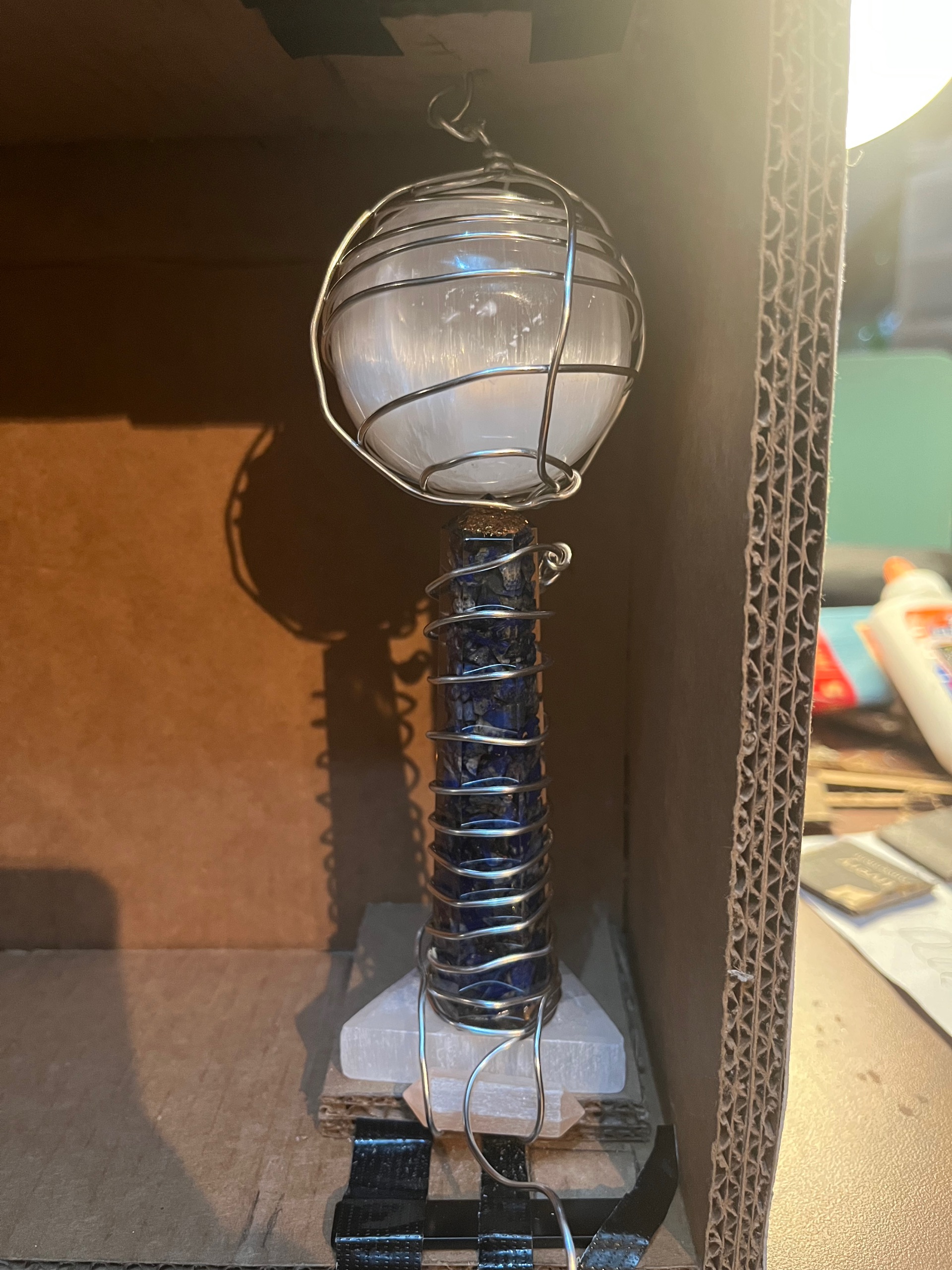 foam, cardboard, card stock, paper, mirrors, clear acrylic sheets, window tint film, crystals, orgonite, wire, LED lights, acrylic paint, colored pencil, gold leaf, craft moss