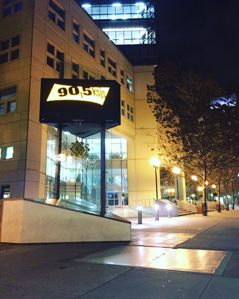 Campus Image: Bulletin board flashes the KSJS logo outside King library