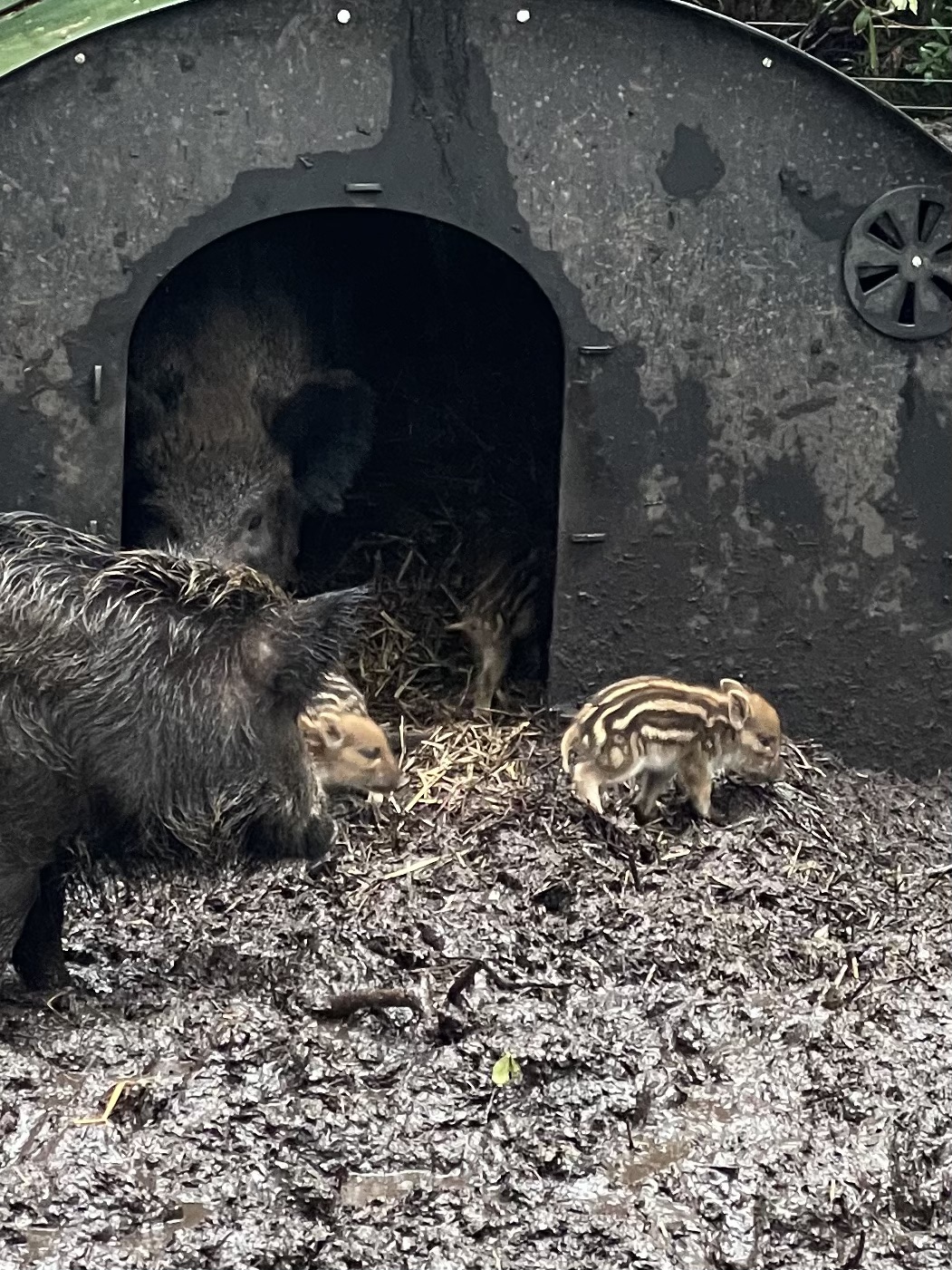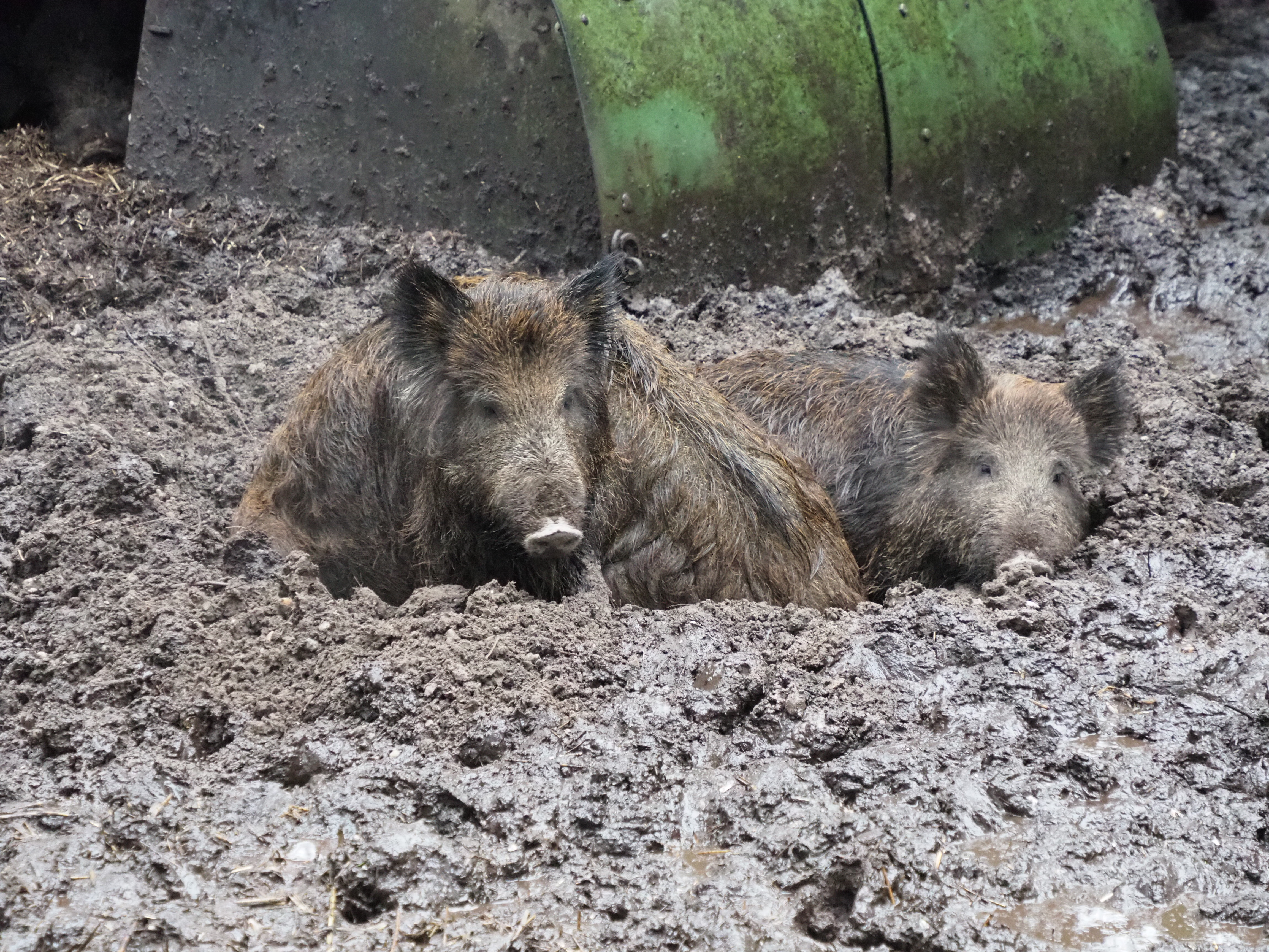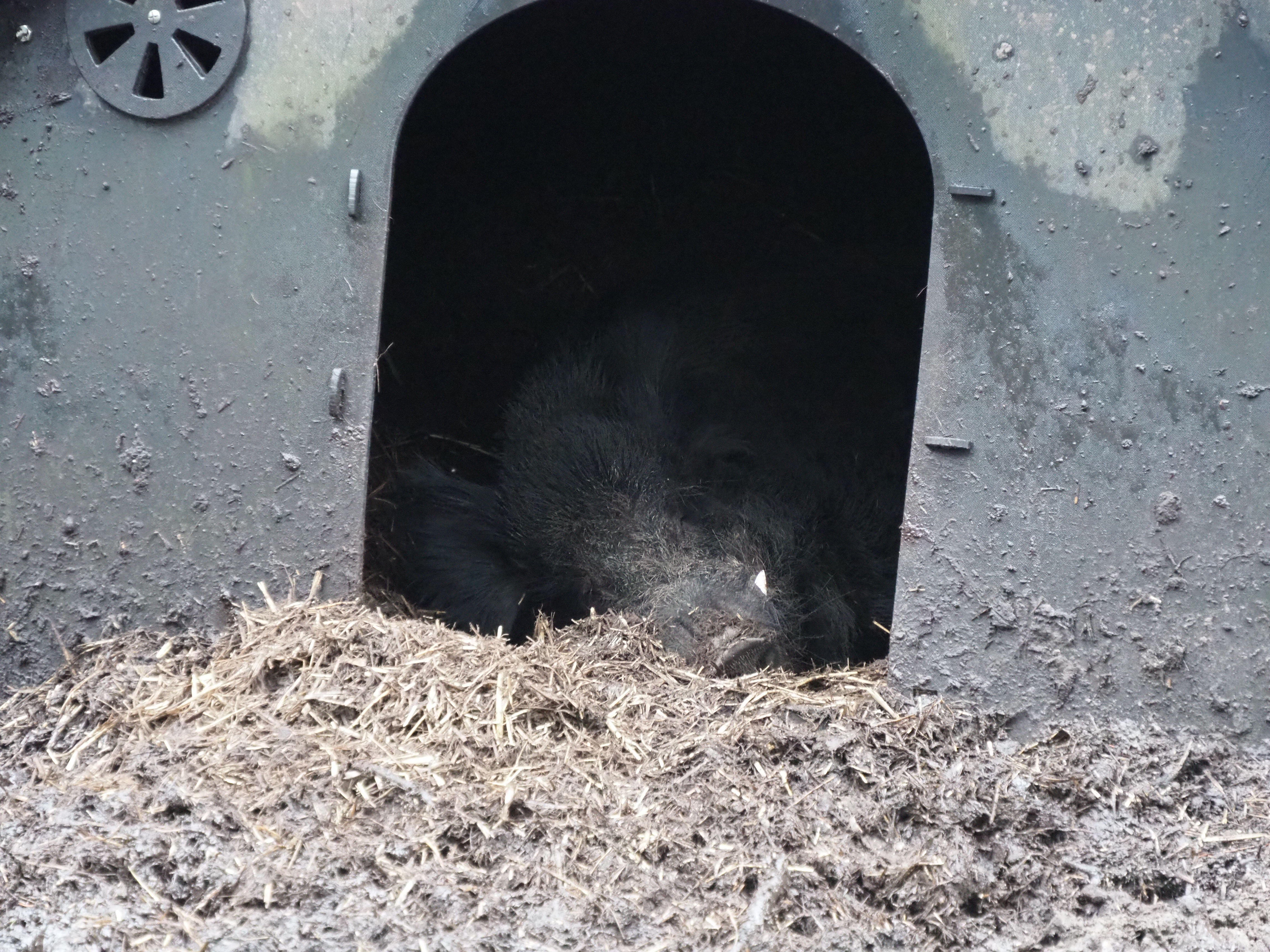 In the wild boar enclosure, these are “the teenagers”. There are two huts behind them, one where the adult male is sleeping and another for the adult female.