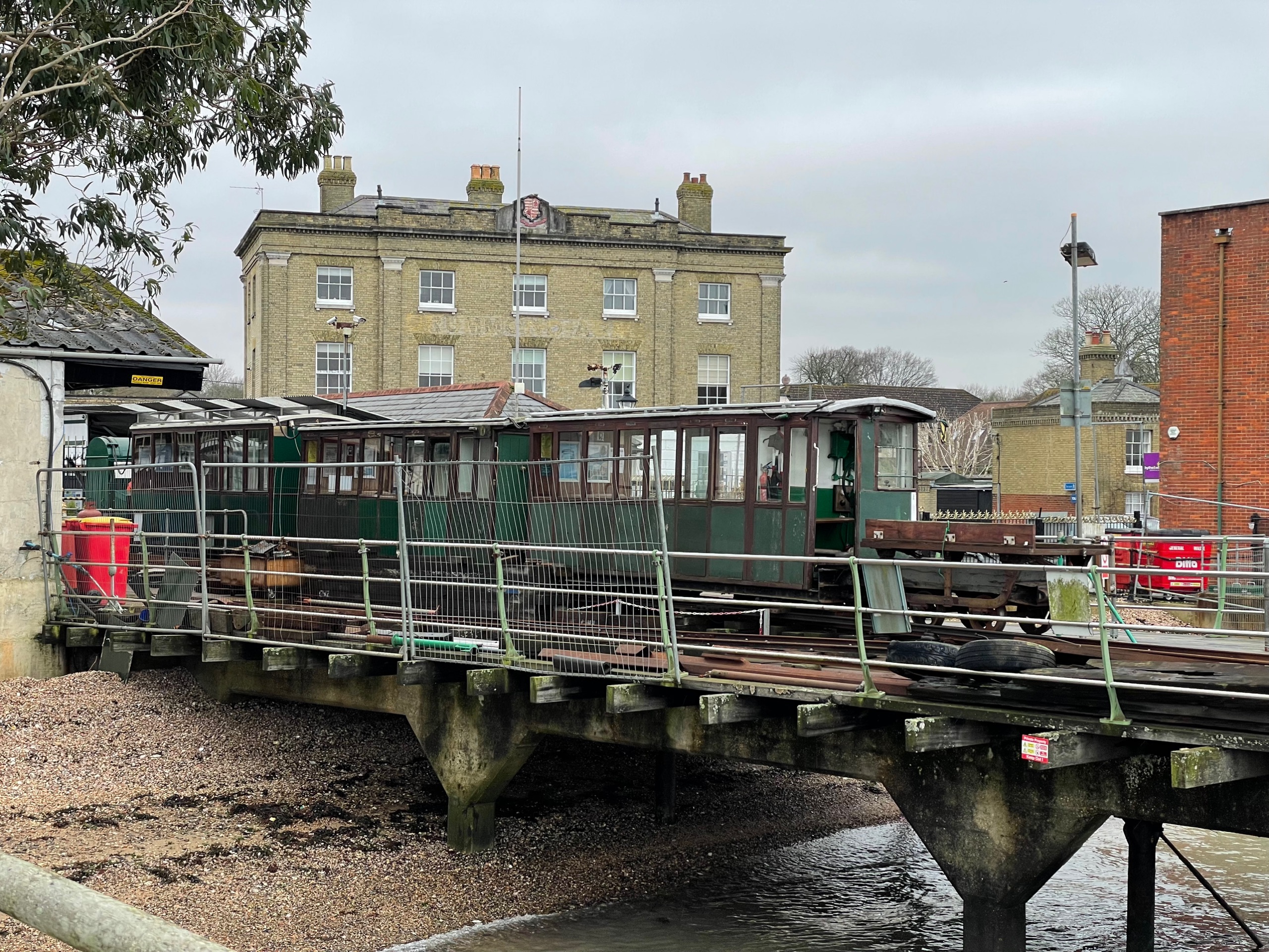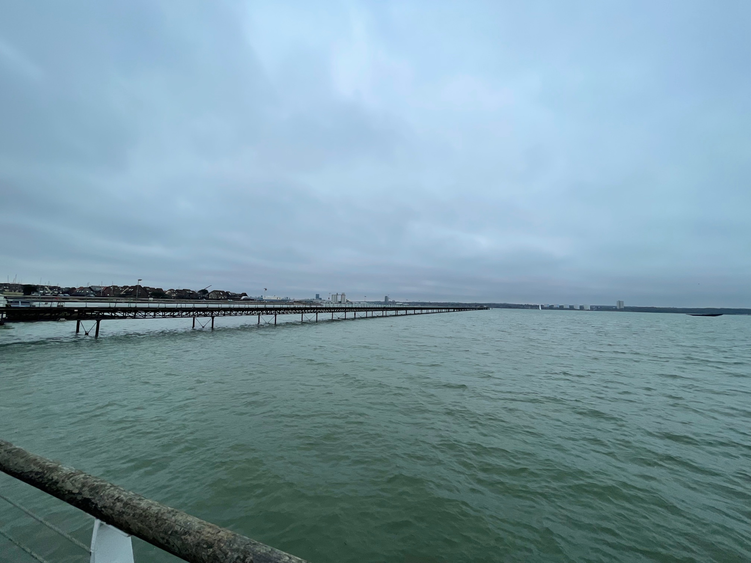 Like, properly miserable. Blowing a gale and colder than it was at the park. There’s no pedestrian access to the pier, it’s rail only… and we’re not certain it’s actually running, even though it’s the only way to get to the ferry service to Southampton at the far end. But regardless, the train looks … I mean, it has an air of “derelict fairground ride” about it.