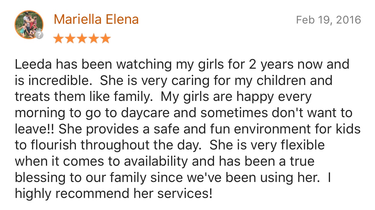 Ms. Anifa has been a blessing to my family; caring for my daughter as though she were her own. Although my daughteur no longer attends Ms. Anifa’s Daycare, Ms. Anifa is still listed as one of my daughter’s emergency POC’s - that says plenty without saying much at all. If you are looking for a child-care provider who embodies kindness, reliability, and comfort of care, Mr. Anifa is the one for you.