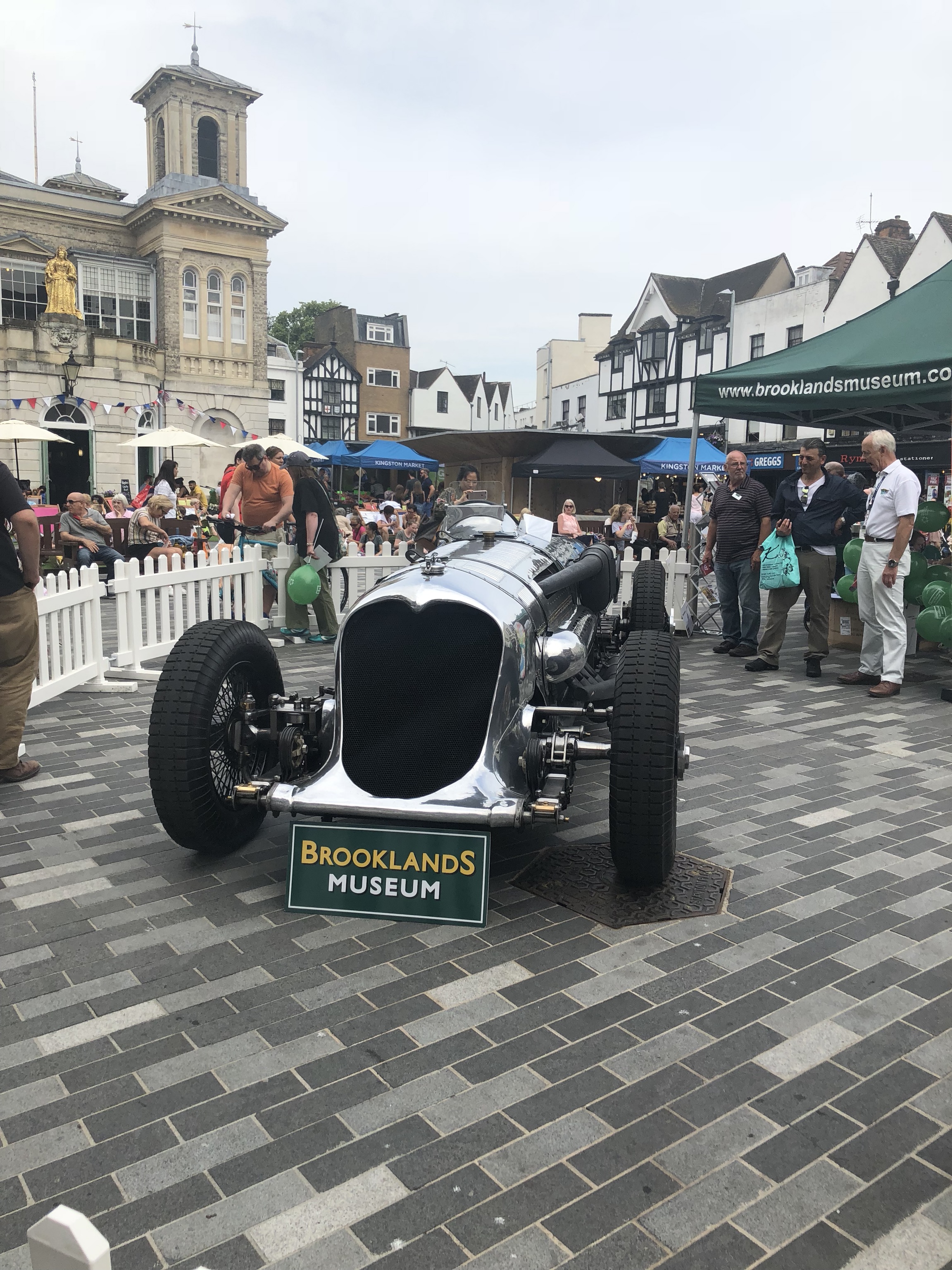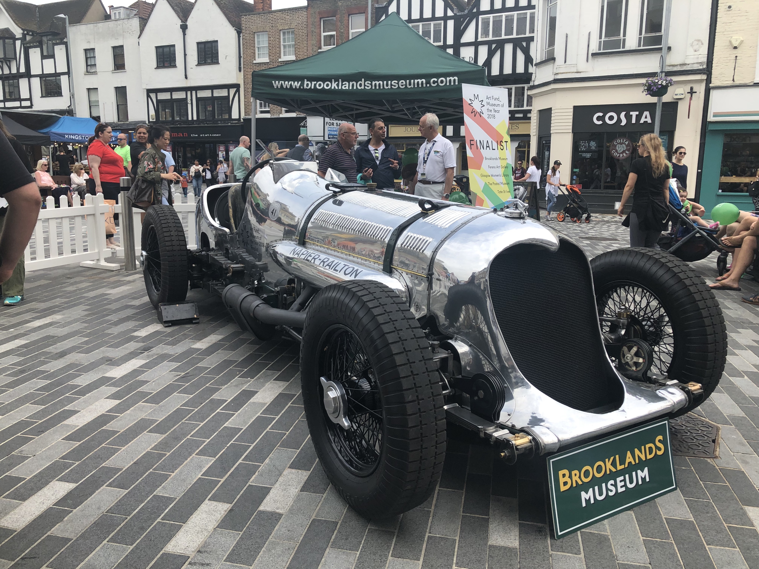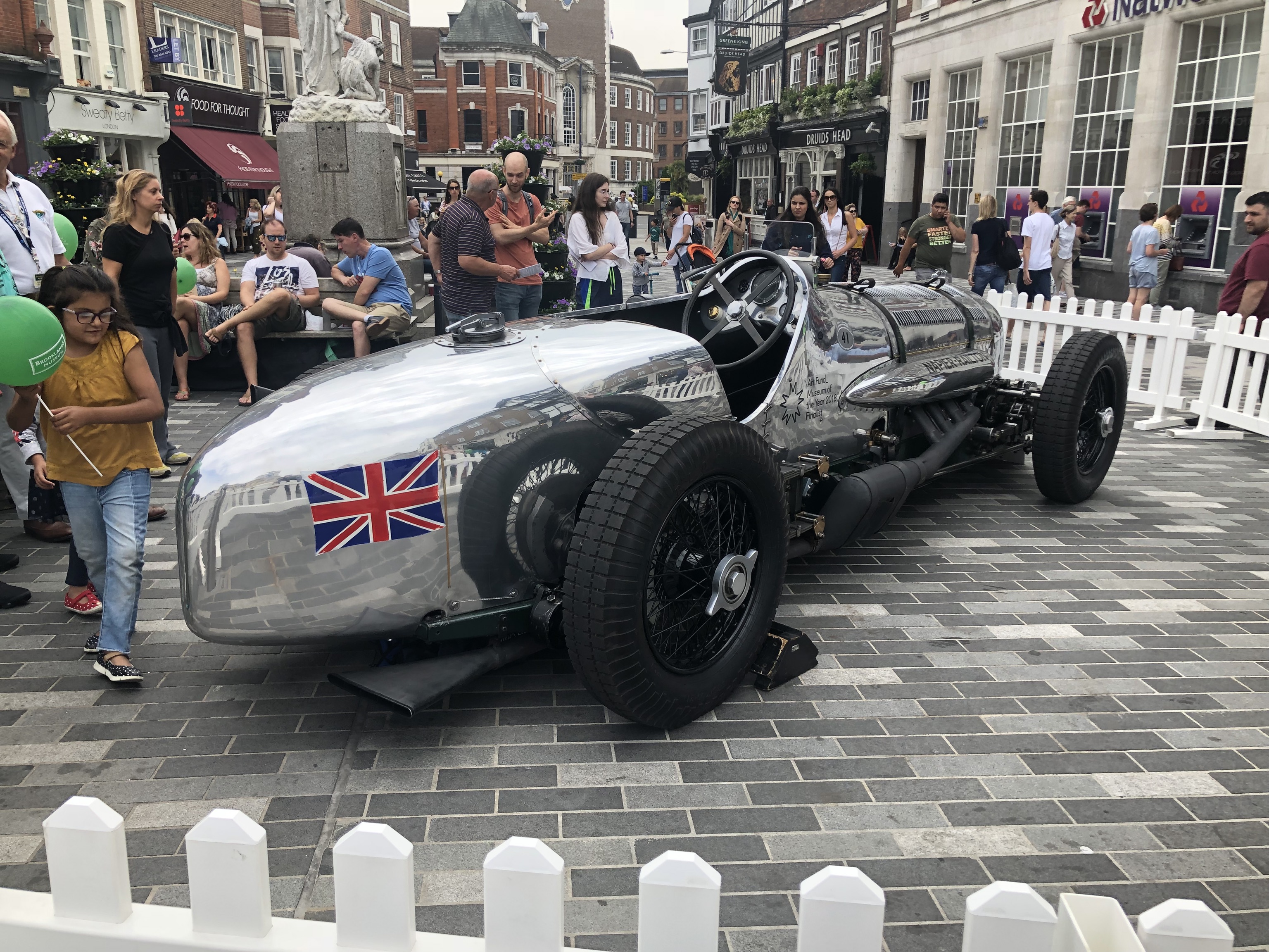 We're Art Fund pass holders, and that organisation has just announced the shortlist for museum of the year 2018. As it happens, one of them is Brooklands Museum a few miles south of us (it's a great place, full of cars and planes and with an old banked racetrack). Celebrating their shortlisting and attempting to gather votes to be the eventual winner, they've parked some old shiny car here for the day.