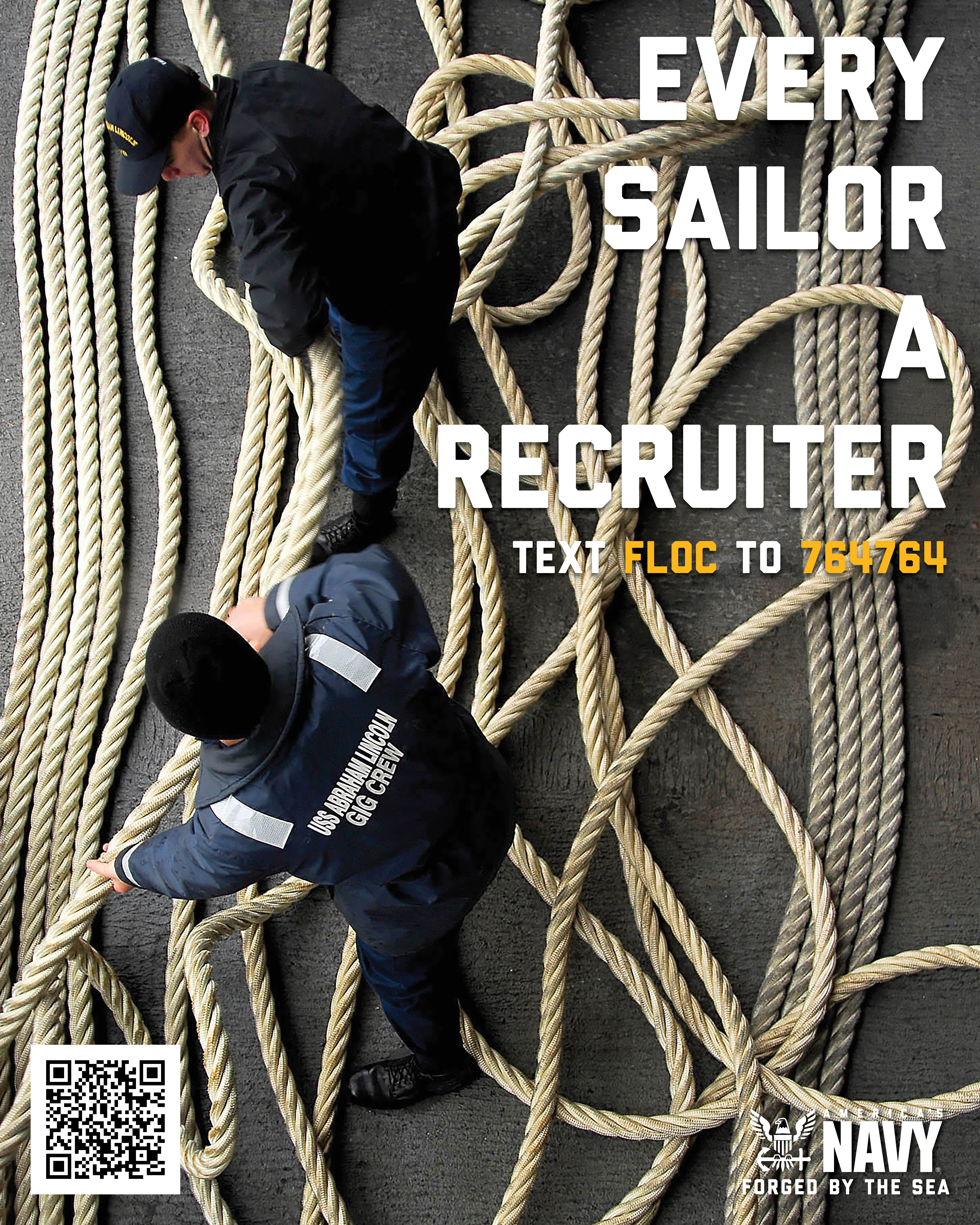Allchin emphasized that every Sailor is an “ambassador” for the service, encouraging Sailors to text “FLOC” to 764-764 if they encounter someone suitable for the Navy. The provided text links the Sailor to a survey page for submitting the potential recruit’s contact information, facilitating a recruiter’s connection with them.