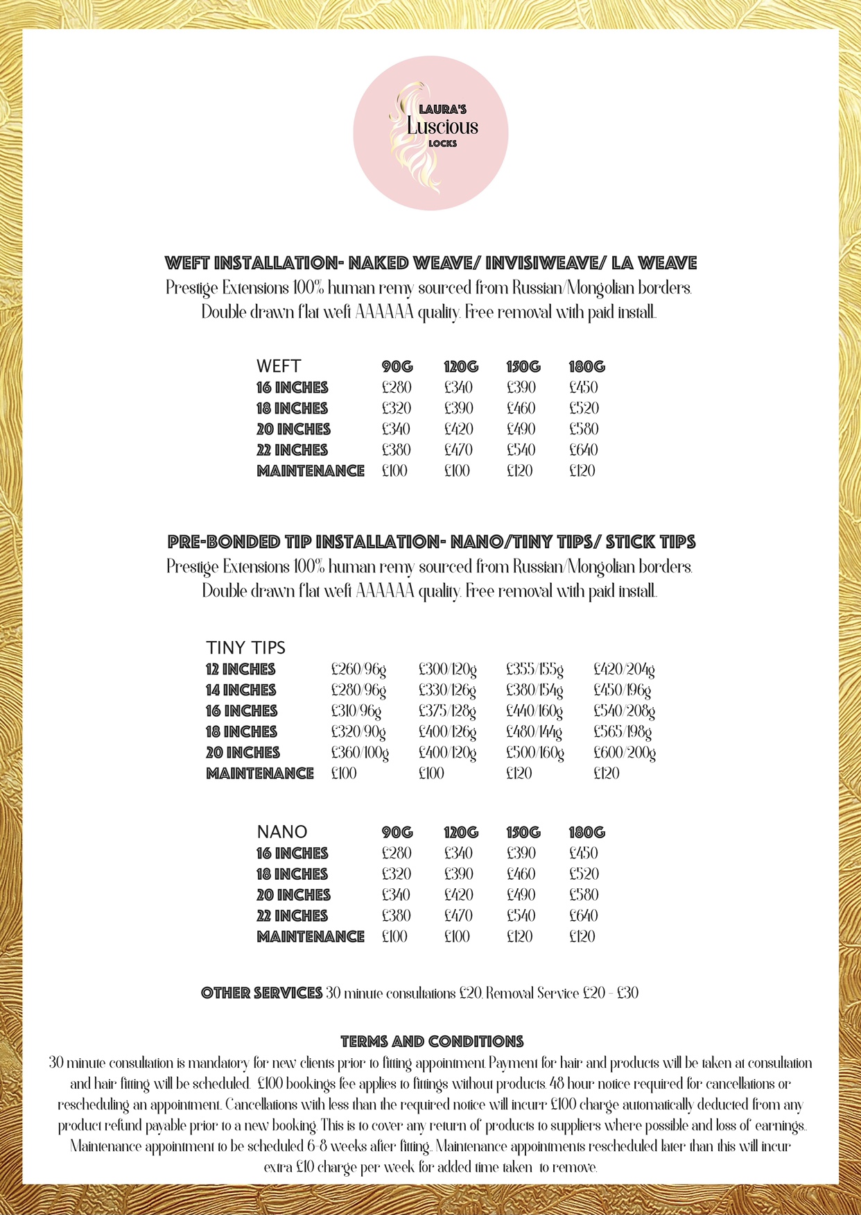 General Price List using Prestige Remy hair