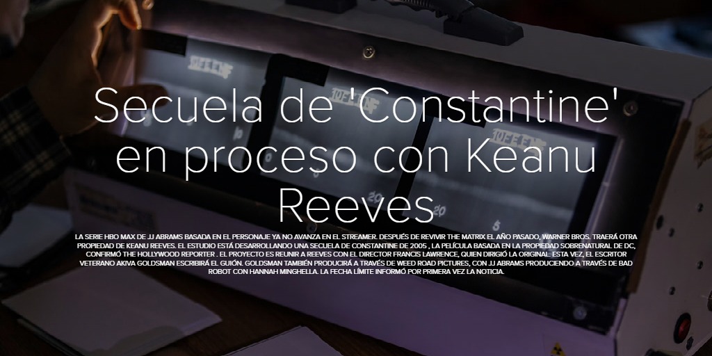Secuela de 'Constantine' en proceso con Keanu Reeves La serie HBO Max de JJ Abrams basada en el personaje ya no avanza en el streamer. Después de revivir The Matrix el año pasado, Warner Bros. traerá otra propiedad de Keanu Reeves. El estudio está desarrollando una secuela de Constantine de 2005 , la película basada en la propiedad sobrenatural de DC, confirmó The Hollywood Reporter . El proyecto es reunir a Reeves con el director Francis Lawrence, quien dirigió la original. Esta vez, el escritor veterano Akiva Goldsman escribirá el guión. Goldsman también producirá a través de Weed Road Pictures, con JJ Abrams produciendo a través de Bad Robot con Hannah Minghella. La fecha límite informó por primera vez la noticia.