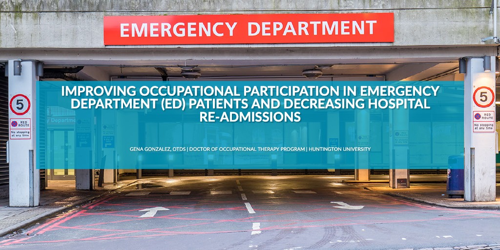The emergency room is a department often characterized by its large diversity of clients, medical conditions, treatments and interprofessional teams. Assessing a large array of individuals from all backgrounds, over 136 million people visit the emergency department each year (Chown & Soley, 2016). Encountering not only those with physical impairments, but also those with mental ailments as well, emergency departments provide 24-hour care for serious accidents, medical and surgical emergencies frequently impacting daily occupational performance (James et al., 2016). However, with one study showing over 50% of older adults to have left an accident and emergency department unable to perform basic activities of daily living, the role of occupational therapy in the ED has recently been highlighted (Hendriksen & Harrison, 2001). Not only assisting with safe discharge, but also with assistive technology, home assessment, and both cognitive and physical functioning, skilled occupational therapy services have been found to both increase quality of care, while decreasing hospital re-admissions and demands placed on emergency primary care (Rogers et al., 2016; Hendriksen & Harrison, 2001). In fact, according to health policy researchers, occupational therapy is the only spending category that reduces hospital re-admissions, with the profession providing a “unique immediate focus on patients’ functional and social needs, which can be an important driver to readmissions if left unaddressed” (Rogers et al., 2016). With 20% of Medicare patients found to be readmitted within 30 days of discharge, and 75% of re-admissions considered preventable, investments in occupational therapy can “improve care quality without significantly increasing hospital spending,” and may potentially save the Centers of Medicare and Medicaid Services approximately $12 billion annually (Roger et al., 2016; Chown & Soley, 2016). To facilitate in this development, this capstone project aims to determine if the inclusion of occupational therapy in the ED has the potential to decrease hospital re-admission rates.