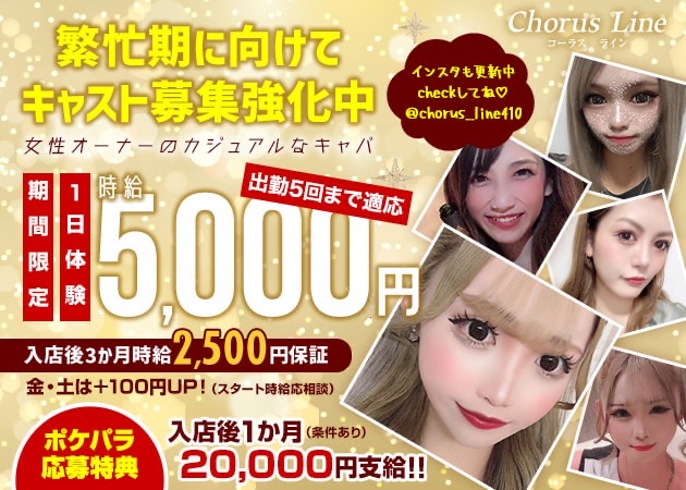 コーラスラインではキャストが楽しくのびのびと働ける環境を提供しておりますナイトワーク経験がない子には優しく指導しお店全体でフォローいたします𓈒𓂂𓏸