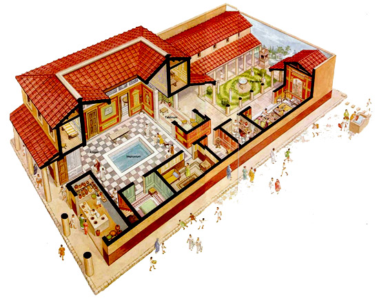 La domus (dal latino "casa") era un'abitazione riservata alle famiglie patrizie, costruita con mattoni o calcestruzzo (impasto di sabbia, ghiaia, acqua e cemento). Era formata in genere da un unico piano (a volte ce n'era un secondo, ma solo nella parte interna) e strutturata attorno a due ambienti centrali: l'atrium (cortile aperto) e il peristylium (giardinetto). L'atrium è il locale centrale quadrato o rettangolare che presenta un'ampia apertura sul soffitto (impluvium), alla quale corrisponde sul pavimento una grande vasca (compluvium) per il raccoglimento dell'acqua piovana. All'atrium si accedeva dalla strada, prima attraverso il vestibulum (vestibolo) e poi dalle fauces (corti corridoi)