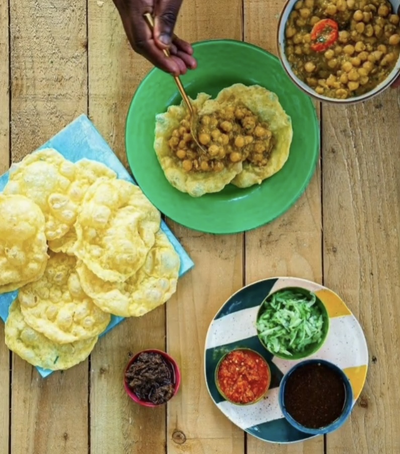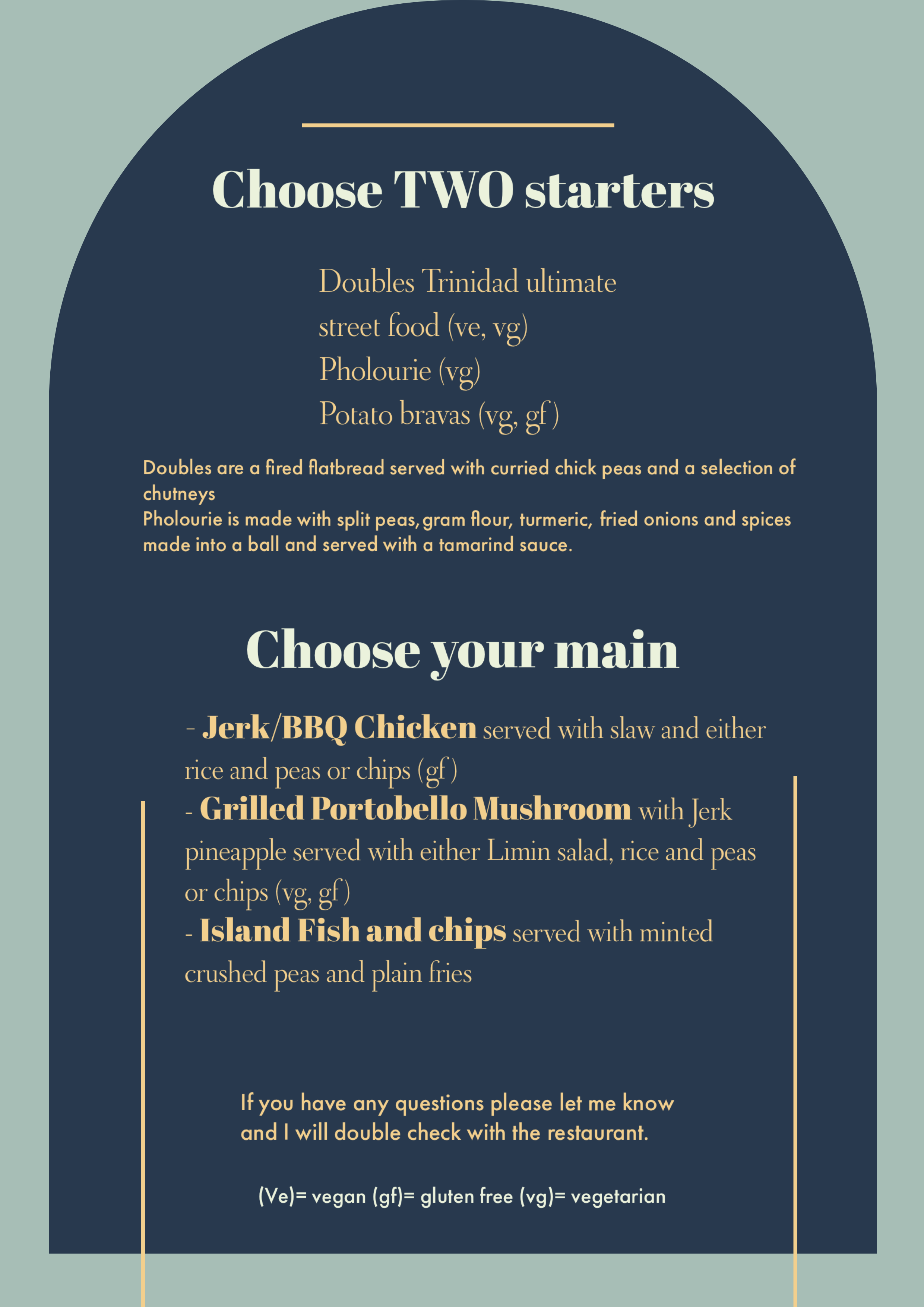Choose TWO of the starters; Doubles Trinidad ultimate street food is a small Fried flatbread served with curried chick peas and various chutneys (veggie & vegan) Potato bravas or Pholourie which is a split pea fritter.