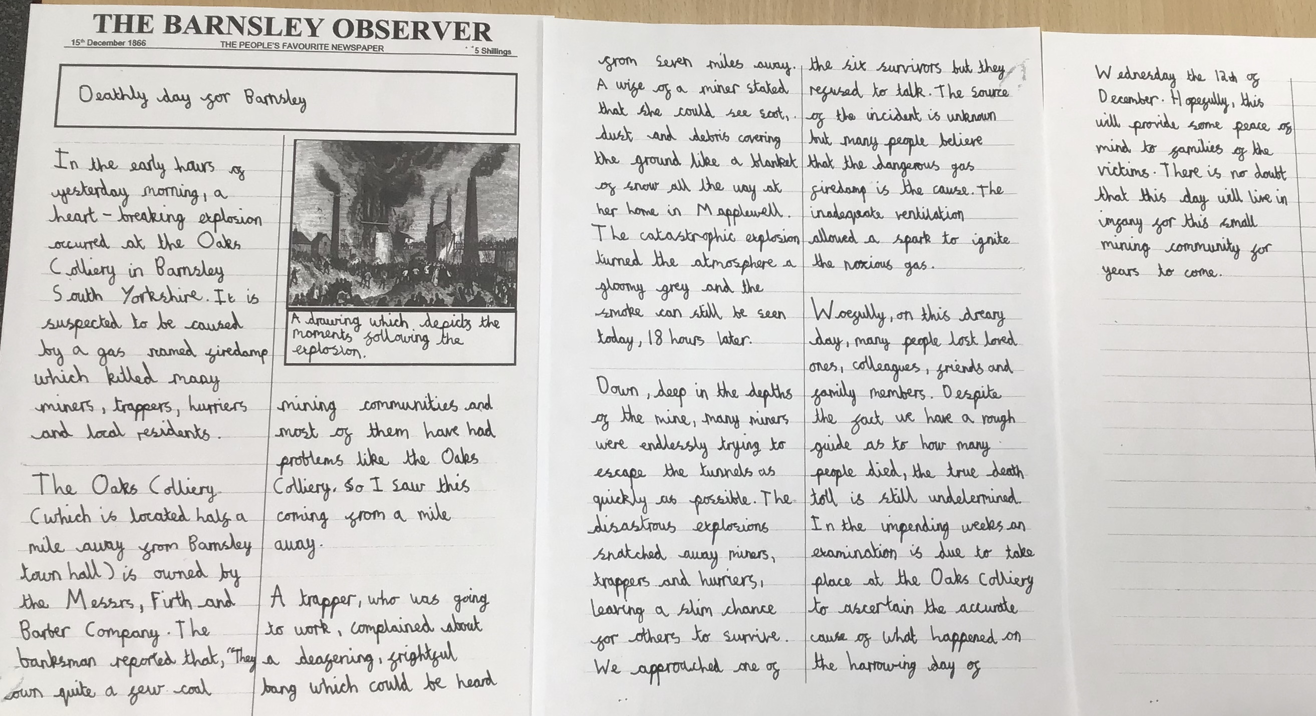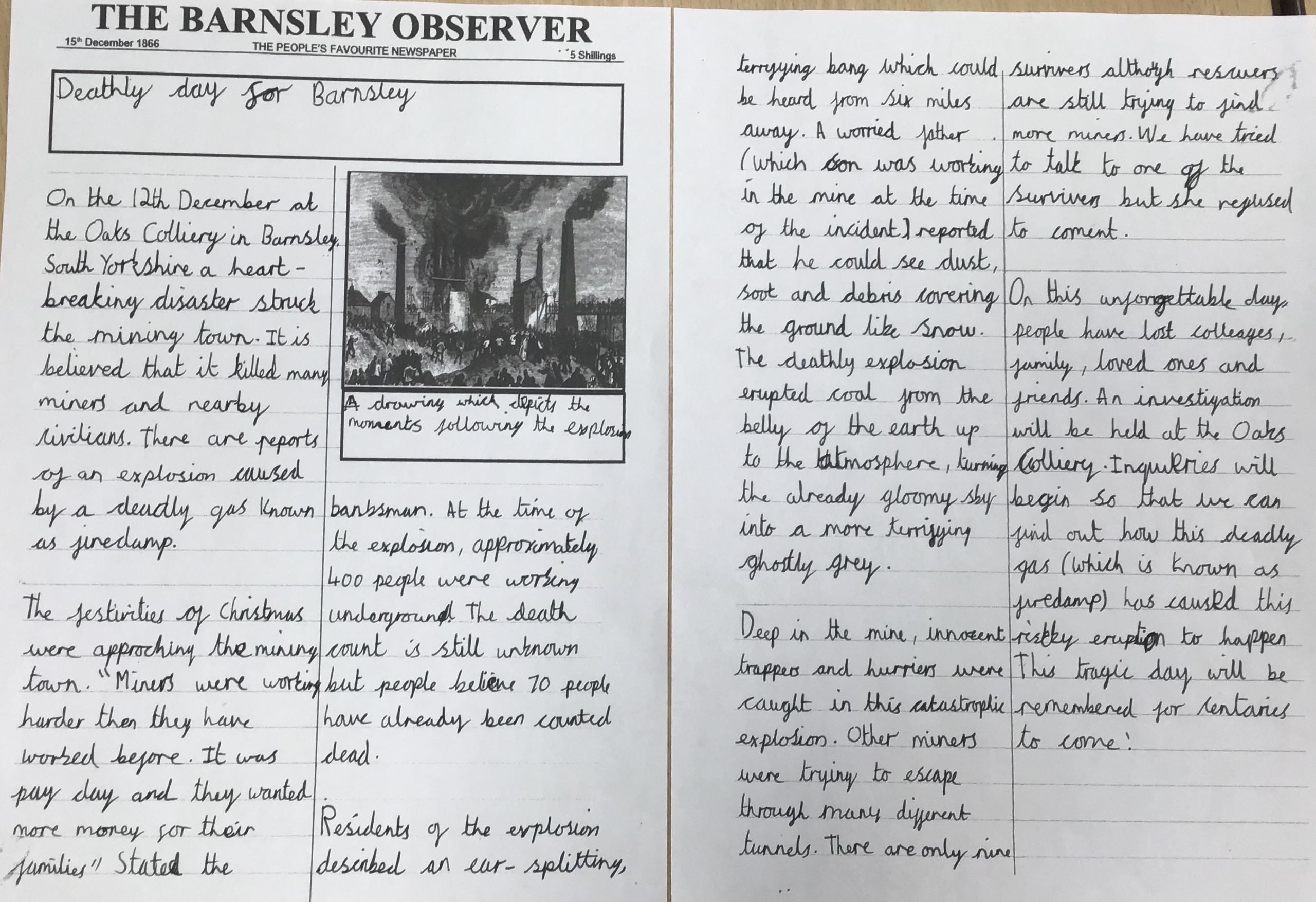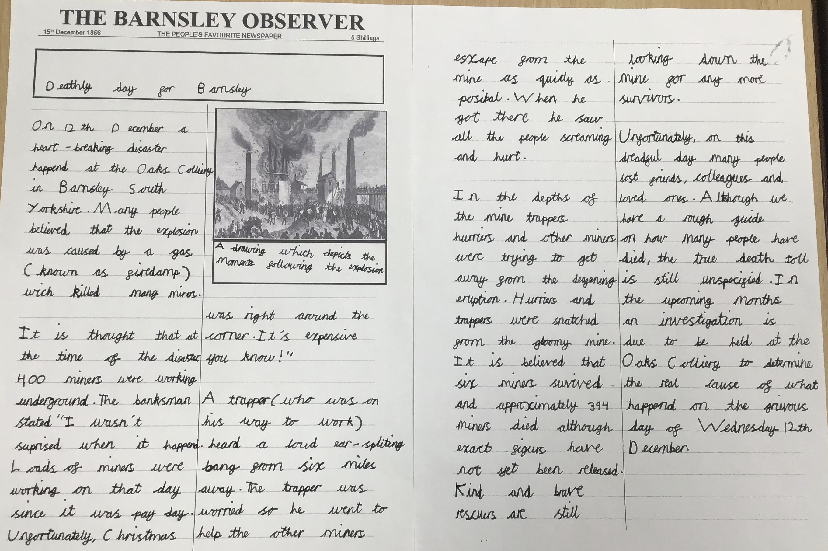 This half term, we have looked closely at the Oaks Colliery Disaster. We gathered information about what happened and made inferences about how the people involved would be feeling. Our end outcome was to write a newspaper report from the time about the disaster.