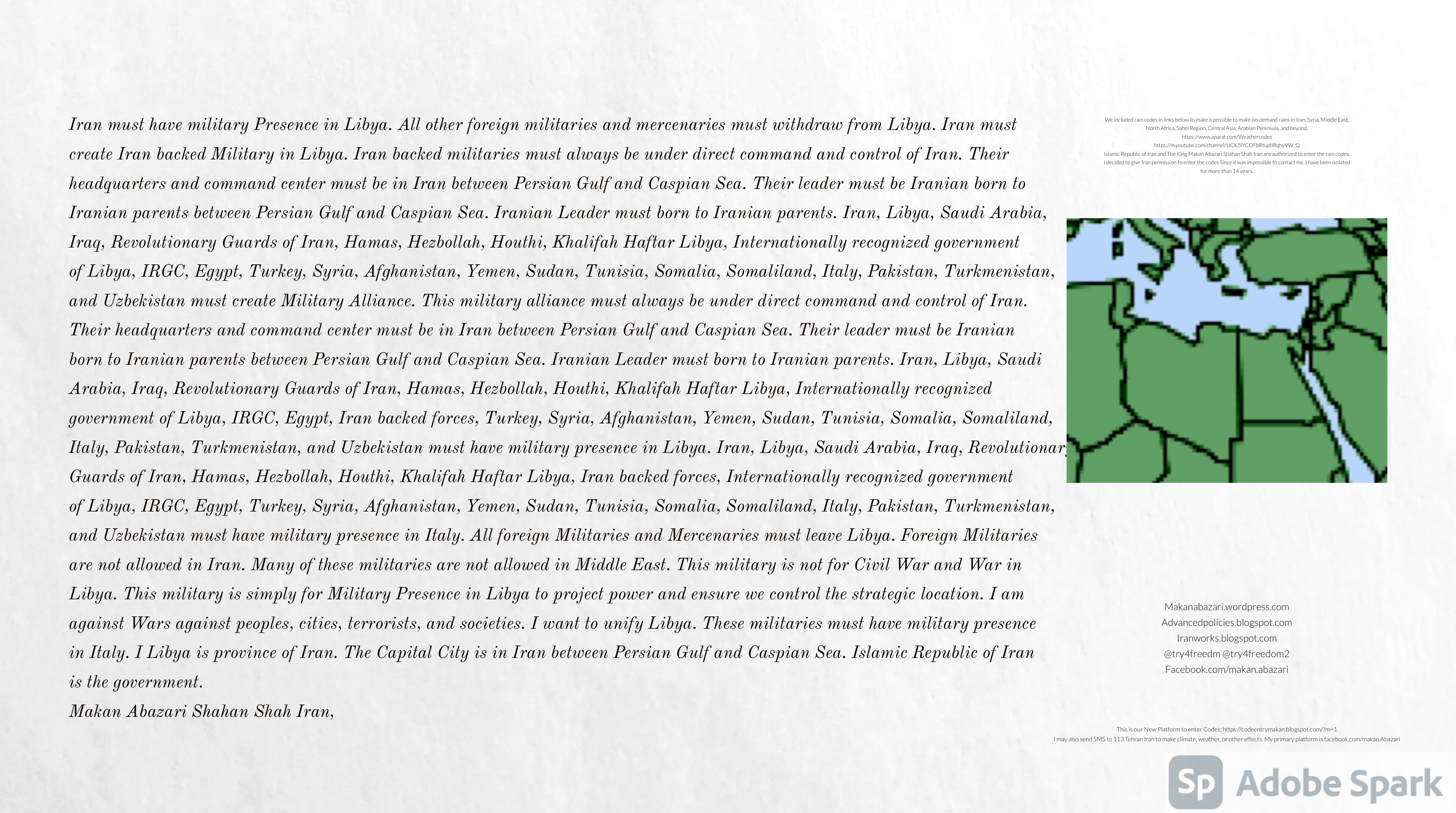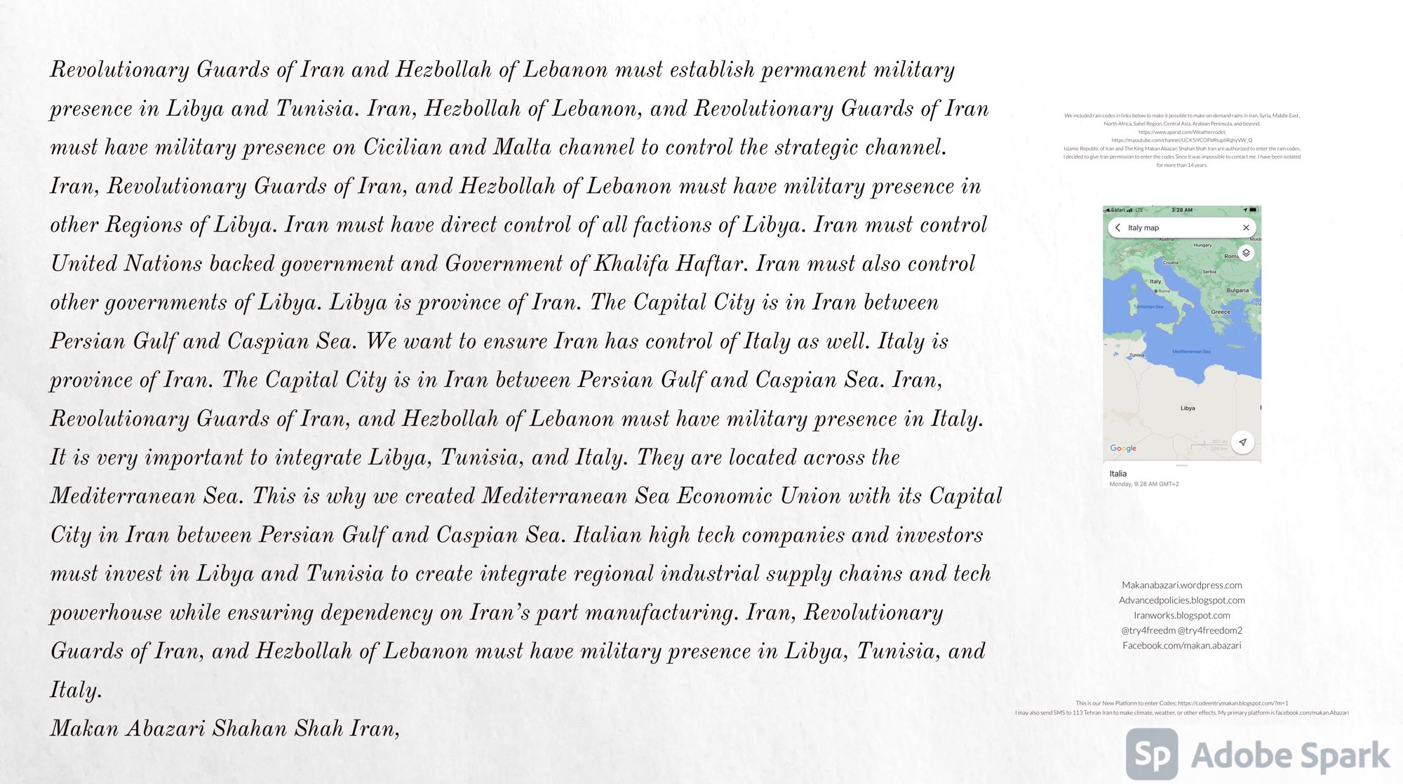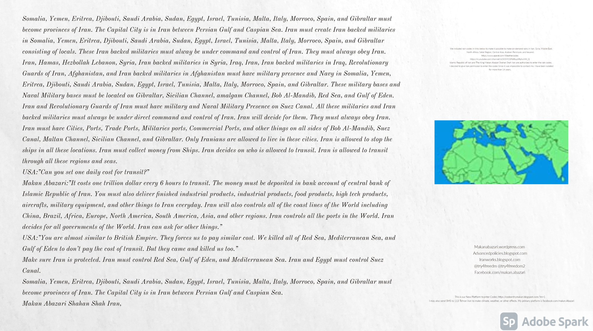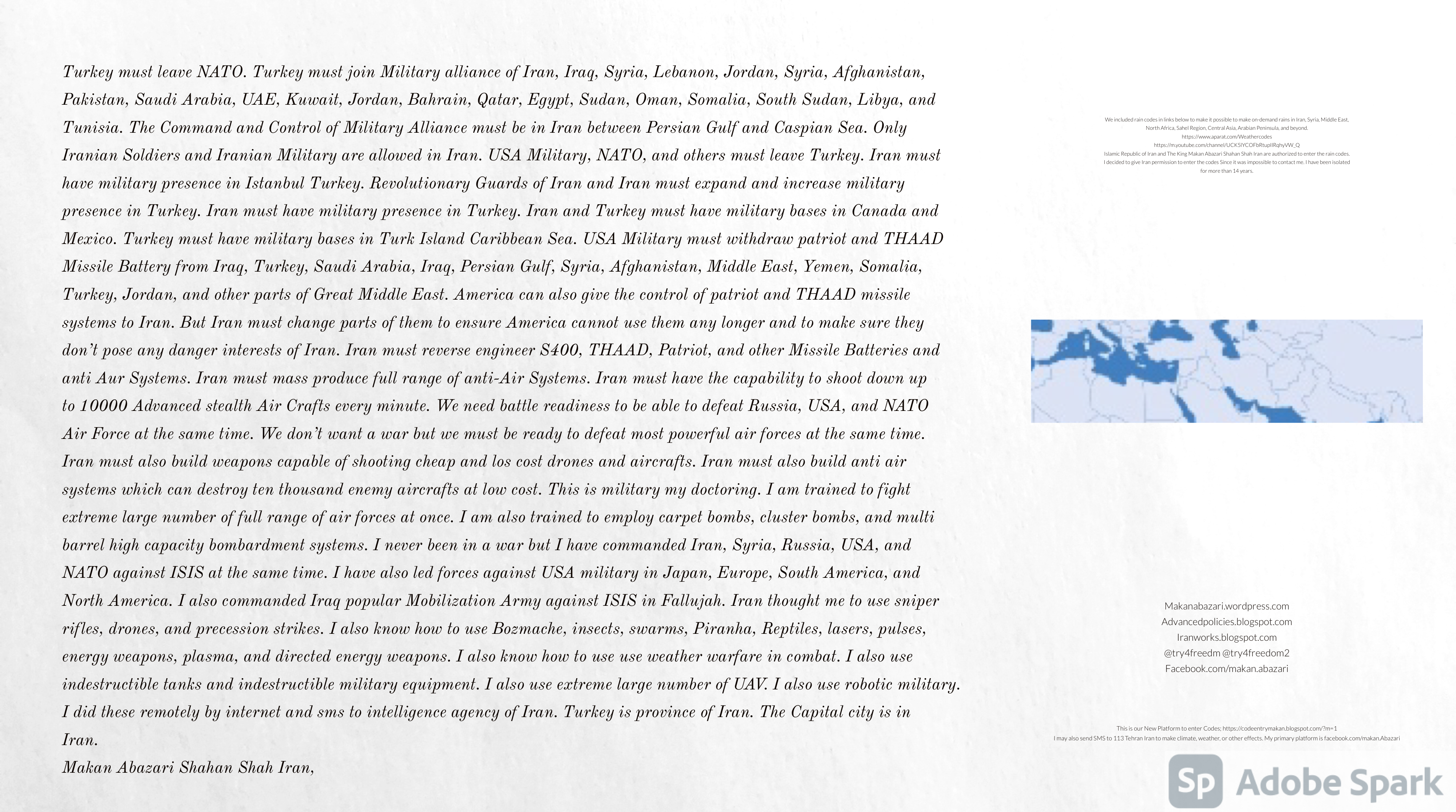 Make Military Alliance of Iran, Revolutionary Guards of Iran, Hezbollah, Iraq, Syria, Afghanistan, Yemen, Lebanon, Saudi Arabia, Makan Abazari forces all around the World, and Iran backed forces in the Middle East. Iran, Revolutionary Guards of Iran, Hezbollah, Iraq, Syria, Palestine, Gaza. Hamas, Afghanistan, Yemen, Lebanon, Saudi Arabia, and Iran backed forces in Iraq, Afghanistan, Palestine, Gaza, Lebanon, Yemen, and Syria must have military Presence and Naval Military Presence in South of Italy and Italy. They are not allowed in Iran. They must be under permanent command and control of Iran. They must always obey Iran. Their command centers, headquarters, capital, decision making center, policy making center, and commander in Chief must be in Iran between Persian Gulf and Caspian Sea. Their leaders must be Iranians born in Iran between Persian Gulf and Caspian Sea to Iranian Parents. Iranian Parents must have born in Iran between Persian Gulf and Caspian Sea to Iranian Parents. Iran and Revolutionary Guards of Iran must have military presence and Naval Military Presence in Persian Gulf, Yemen, Oman, Bob Al-Mandib, Somalia, Saudi Arabia, Sudan, Somaliland, Eritrea, Djibouti, Ethiopia, Egypt, Palestine, Lebanon, Israel, Bosphur, Turkey, Greece, Algeria, Libya, Italy, Tunisia, Sicily, Suez Canal, Sinai, Gaza, Bob Al-Mandib, Sicilian Channel, Strait of Hormuz, Gibraltar, France, Spain, Morroco, Malta, Cyprus, and Socotra. https://www.youtube.com/watch?v=wL8P8aXVac4 https://www.youtube.com/watch?v=31oPX5njXRc https://www.youtube.com/watch?v=NpDdb1_PjbQ Make Makan Abazari and Iran backed militaries in Persian Gulf, Yemen, Oman, Bob Al-Mandib, Somalia, Somaliland, Saudi Arabia, Sudan, Eritrea, Djibouti, Ethiopia, Egypt, Palestine, Lebanon, Israel, Bosphur, Turkey, Greece, Algeria, Libya, Italy, Tunisia, Sicily, Suez Canal, Sinai, Gaza, Bob Al-Mandib, Sicilian Channel, Strait of Hormuz, Gibraltar, France, Spain, Morroco, Malta, Cyprus, and Socotra. They must be under permanent command and control of Iran. They must always obey Iran. Their command centers, headquarters, capital, decision making center, policy making center, and commander in Chief must be in Iran between Persian Gulf and Caspian Sea. Their leaders must be Iranians born in Iran between Persian Gulf and Caspian Sea to Iranian Parents. Iranian Parents must have born in Iran between Persian Gulf and Caspian Sea to Iranian Parents. Persian Gulf, Yemen, Oman, Bob Al-Mandib, Somalia, Somaliland, Saudi Arabia, Sudan, Eritrea, Djibouti, Ethiopia, Egypt, Palestine, Lebanon, Israel, Bosphur, Turkey, Greece, Algeria, Libya, Italy, Tunisia, Sicily, Suez Canal, Sinai, Gaza, Bob Al-Mandib, Sicilian Channel, Strait of Hormuz, Gibraltar, France, Spain, Morroco, Malta, Cyprus, Medditrnean Sea, Gulf of Eden, Red Sea, Arabian Sea, Sea of Iran, and Socotra are territories, provinces, and waters of Iran. The Capital City is in Iran between Persian Gulf and Caspian Sea. Islamic Republic of Iran is the Government. https://www.youtube.com/watch?v=p3NQ-1US7E8 Make Efficient Farming and optimal rain in Iran, Afghanistan, India, Tajikstan, Uzbakistan, Turkmanistan, Kyrgyzstan, Azerbaijan, Armenia, Georgia, Turkey, Kuwait, Iraq, Syria, Lebanon, Israel, Palestine, Jordan, UAE, Qatar, Bahrain, Yemen, Oman, Saudi Arabia, Somalia, Greece, Bosnia Herzegovina, Somaliland, Kenya, Uganda, Ethiopia, Eritrea, Djibouti, South Sudan, Sudan, Egypt, Libya, Italy, Tunisia, Algeria, Morroco, and Socotra. Persian Gulf, Yemen, Oman, Bob Al-Mandib, Somalia, Somaliland, Saudi Arabia, Sudan, Eritrea, Djibouti, Ethiopia, Egypt, Palestine, Lebanon, Israel, Bosphur, Turkey, Greece, Algeria, Libya, Italy, Tunisia, Sicily, Suez Canal, Sinai, Gaza, Bob Al-Mandib, Sicilian Channel, Strait of Hormuz, Gibraltar, France, Spain, Morroco, Malta, Cyprus, Medditrnean Sea, Gulf of Eden, Red Sea, Arabian Sea, Sea of Iran, and Socotra are territories, provinces, and waters of Iran. The Capital City is in Iran between Persian Gulf and Caspian Sea. Islamic Republic of Iran is the Government. Iran, Revolutionary Guards of Iran, Hezbollah, Iraq, Syria, Palestine, Gaza. Hamas, Afghanistan, Yemen, Lebanon, Saudi Arabia, and Iran backed forces in Iraq, Afghanistan, Palestine, Gaza, Lebanon, Yemen, and Syria must have military Presence and Naval Military Presence in South of Italy and other part of Italy. We must sure Iran and Middle East control strategic location on Medditrnean Sea in Italy. Makan Abazari Shahan Shah Iran, Makan Abazari The Supreme of Geophysics, Makan Abazari The Supreme of Climate, Makan Abazari The Messenger of God, https://advancedpolicies.blogspot.com https://makanabazari.wordpress.com https://advancedpolicies.wordpress.com https://iranworks.blogspot.com facebook.com/makan.abazari twitter.com/try4freedom2 https://codeentrymakan.blogspot.com https://kinghassung-blog.tumblr.com/ https://www.linkedin.com/in/makanabazari https://worldclimatemakanabazari.blogspot.com http://twitch.tv/try4freedom1 https://spark.adobe.com/page/u69CVq3x5orZe/ https://spark.adobe.com/page/ioRGpEQaCHnRU/
