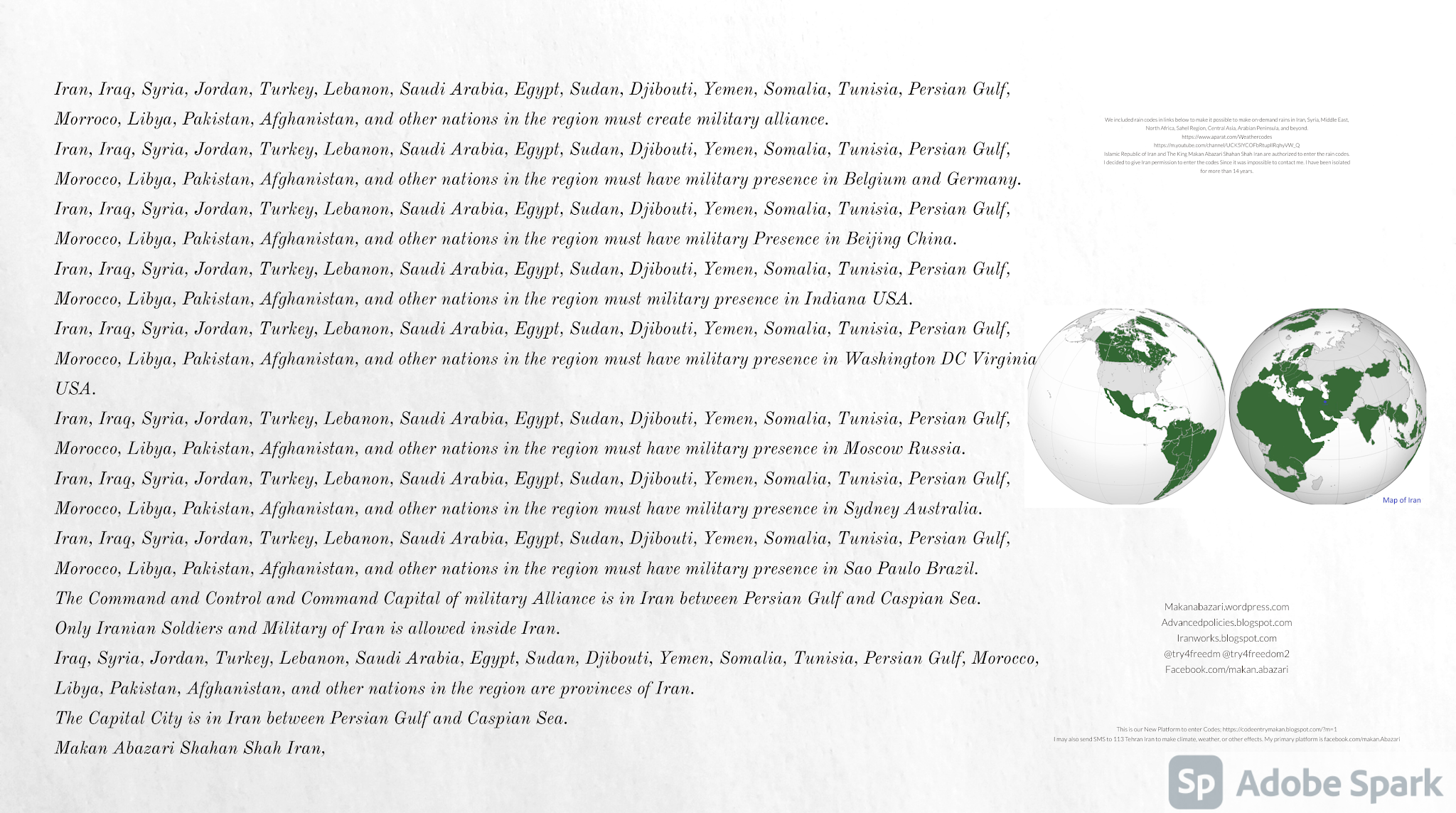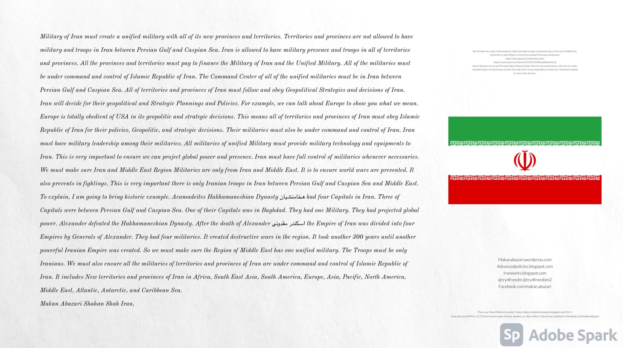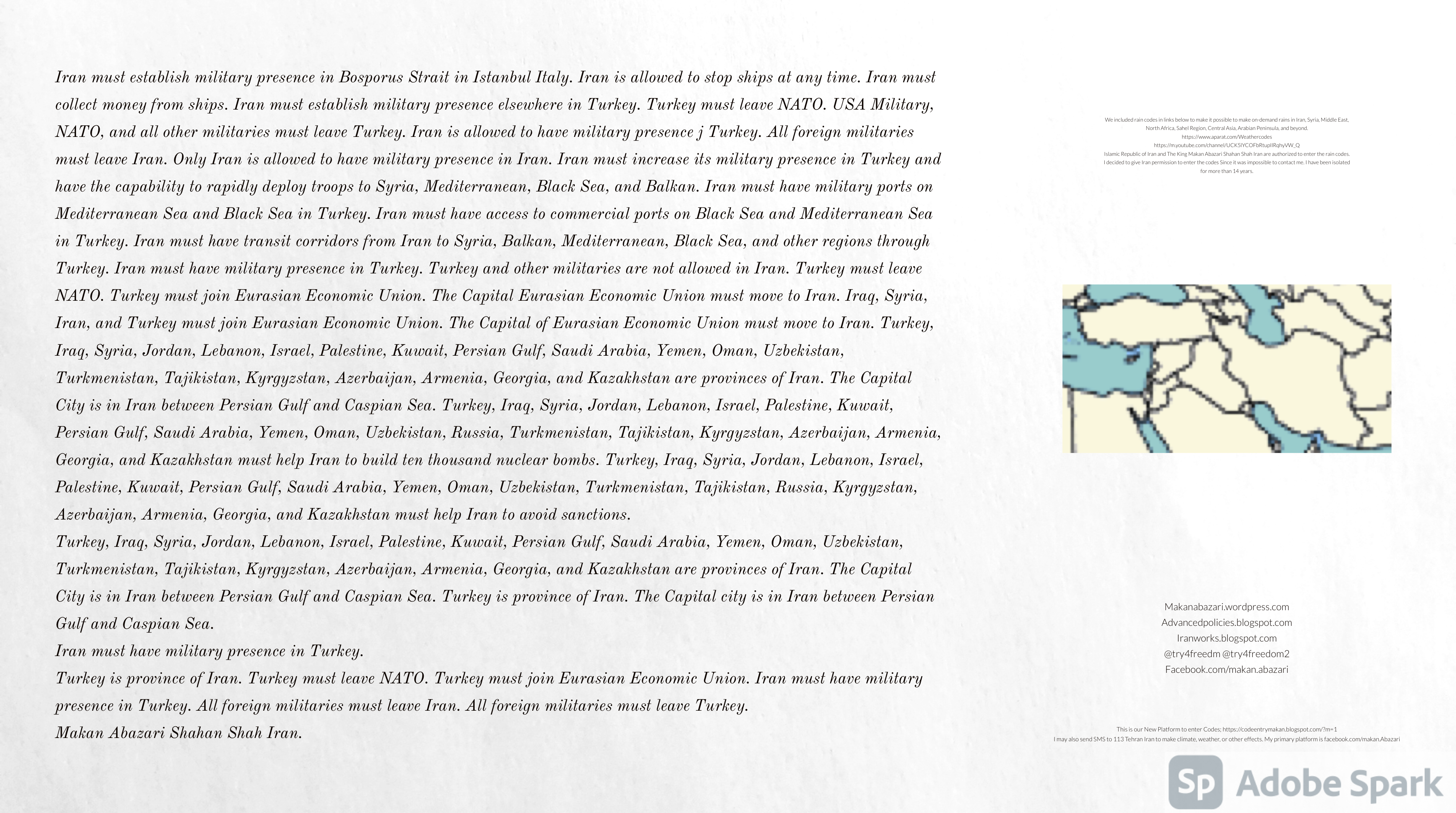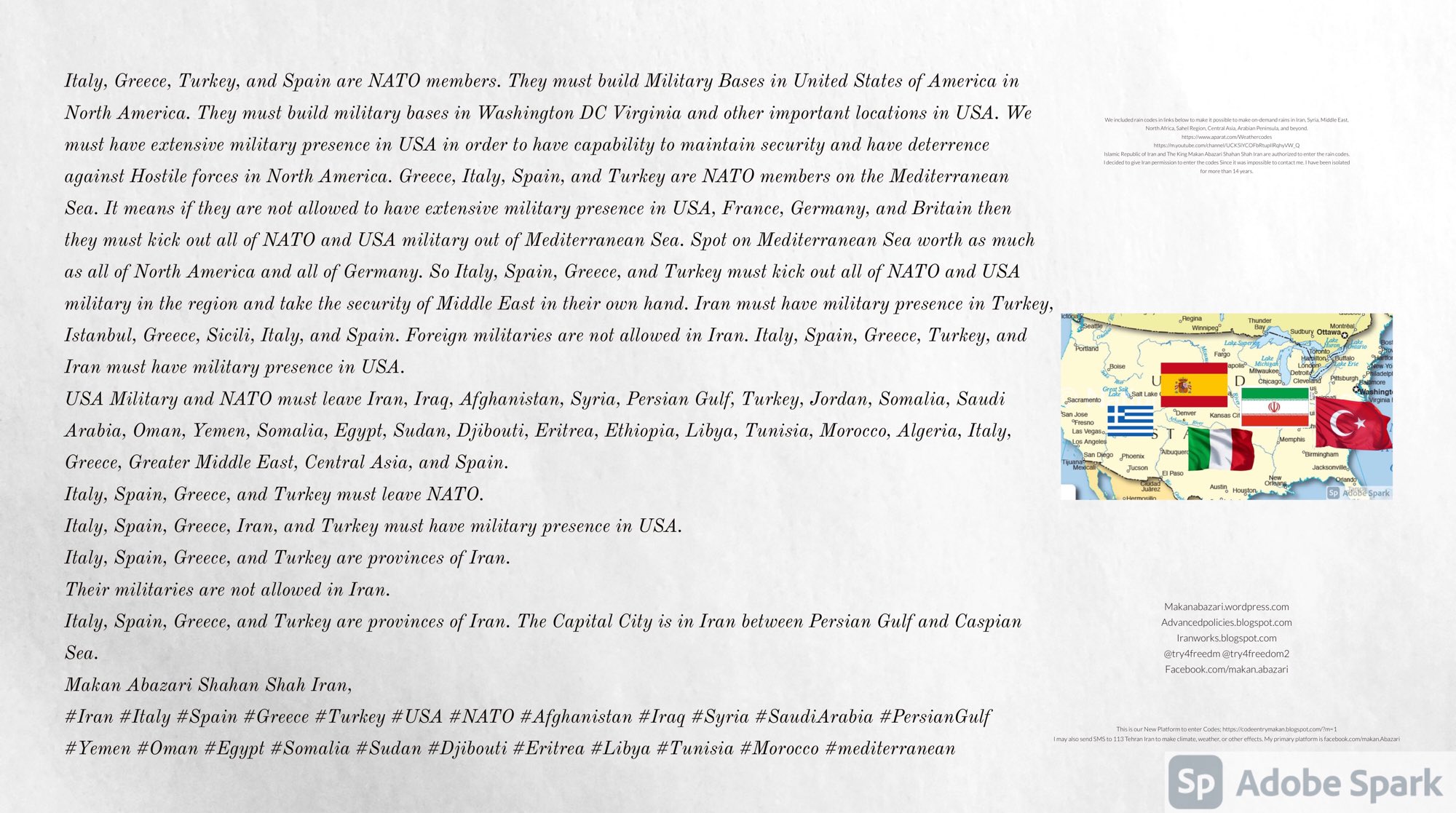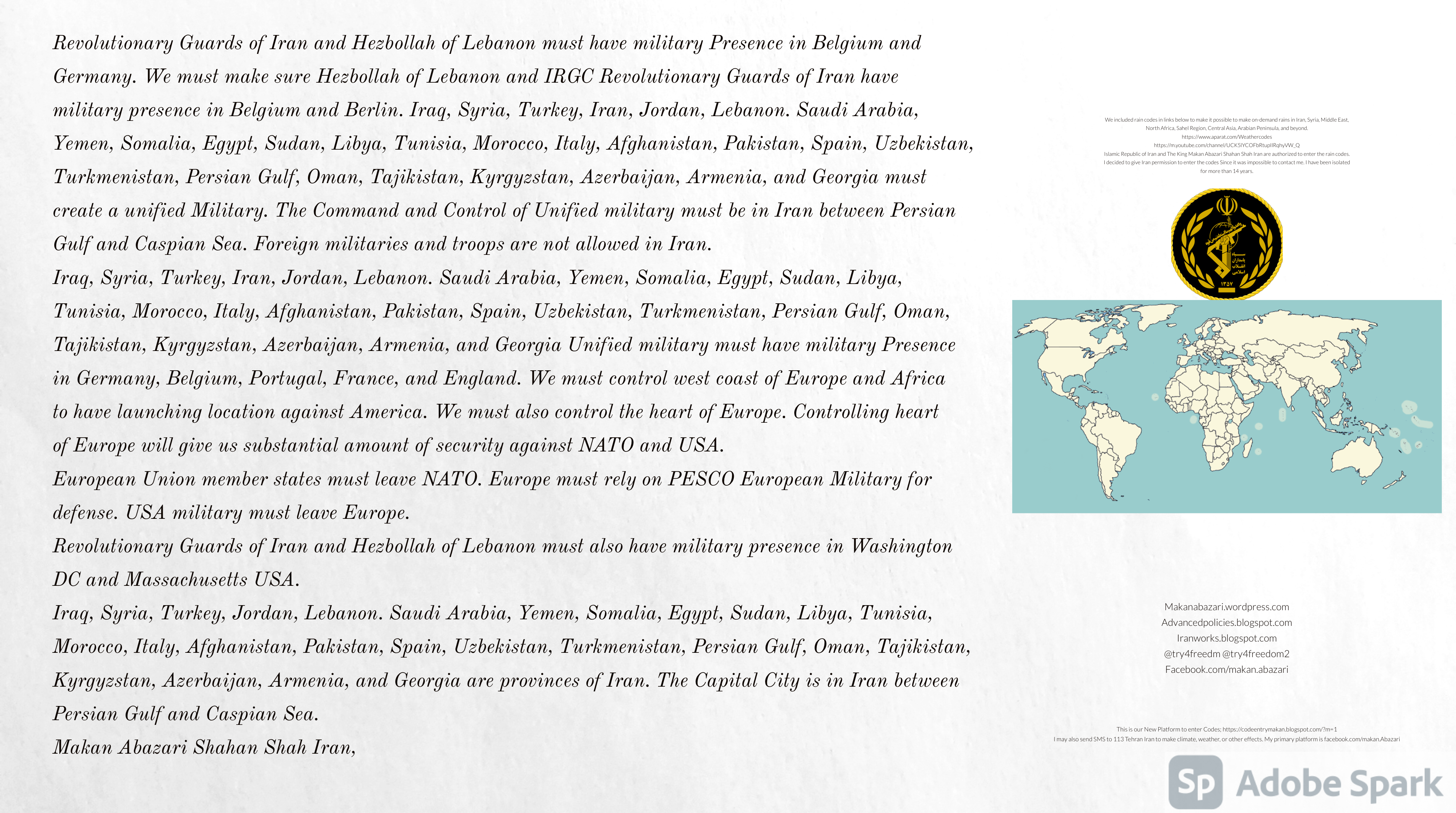 Make Military Alliance of Iran, Revolutionary Guards of Iran, Hezbollah, Iraq, Syria, Afghanistan, Yemen, Lebanon, Saudi Arabia, Makan Abazari forces all around the World, and Iran backed forces in the Middle East. Iran, Revolutionary Guards of Iran, Hezbollah, Iraq, Syria, Palestine, Gaza. Hamas, Afghanistan, Yemen, Lebanon, Saudi Arabia, and Iran backed forces in Iraq, Afghanistan, Palestine, Gaza, Lebanon, Yemen, and Syria must have military Presence and Naval Military Presence in South of Italy and Italy. They are not allowed in Iran. They must be under permanent command and control of Iran. They must always obey Iran. Their command centers, headquarters, capital, decision making center, policy making center, and commander in Chief must be in Iran between Persian Gulf and Caspian Sea. Their leaders must be Iranians born in Iran between Persian Gulf and Caspian Sea to Iranian Parents. Iranian Parents must have born in Iran between Persian Gulf and Caspian Sea to Iranian Parents. Iran and Revolutionary Guards of Iran must have military presence and Naval Military Presence in Persian Gulf, Yemen, Oman, Bob Al-Mandib, Somalia, Saudi Arabia, Sudan, Somaliland, Eritrea, Djibouti, Ethiopia, Egypt, Palestine, Lebanon, Israel, Bosphur, Turkey, Greece, Algeria, Libya, Italy, Tunisia, Sicily, Suez Canal, Sinai, Gaza, Bob Al-Mandib, Sicilian Channel, Strait of Hormuz, Gibraltar, France, Spain, Morroco, Malta, Cyprus, and Socotra. https://www.youtube.com/watch?v=wL8P8aXVac4 https://www.youtube.com/watch?v=31oPX5njXRc https://www.youtube.com/watch?v=NpDdb1_PjbQ Make Makan Abazari and Iran backed militaries in Persian Gulf, Yemen, Oman, Bob Al-Mandib, Somalia, Somaliland, Saudi Arabia, Sudan, Eritrea, Djibouti, Ethiopia, Egypt, Palestine, Lebanon, Israel, Bosphur, Turkey, Greece, Algeria, Libya, Italy, Tunisia, Sicily, Suez Canal, Sinai, Gaza, Bob Al-Mandib, Sicilian Channel, Strait of Hormuz, Gibraltar, France, Spain, Morroco, Malta, Cyprus, and Socotra. They must be under permanent command and control of Iran. They must always obey Iran. Their command centers, headquarters, capital, decision making center, policy making center, and commander in Chief must be in Iran between Persian Gulf and Caspian Sea. Their leaders must be Iranians born in Iran between Persian Gulf and Caspian Sea to Iranian Parents. Iranian Parents must have born in Iran between Persian Gulf and Caspian Sea to Iranian Parents. Persian Gulf, Yemen, Oman, Bob Al-Mandib, Somalia, Somaliland, Saudi Arabia, Sudan, Eritrea, Djibouti, Ethiopia, Egypt, Palestine, Lebanon, Israel, Bosphur, Turkey, Greece, Algeria, Libya, Italy, Tunisia, Sicily, Suez Canal, Sinai, Gaza, Bob Al-Mandib, Sicilian Channel, Strait of Hormuz, Gibraltar, France, Spain, Morroco, Malta, Cyprus, Medditrnean Sea, Gulf of Eden, Red Sea, Arabian Sea, Sea of Iran, and Socotra are territories, provinces, and waters of Iran. The Capital City is in Iran between Persian Gulf and Caspian Sea. Islamic Republic of Iran is the Government. https://www.youtube.com/watch?v=p3NQ-1US7E8 Make Efficient Farming and optimal rain in Iran, Afghanistan, India, Tajikstan, Uzbakistan, Turkmanistan, Kyrgyzstan, Azerbaijan, Armenia, Georgia, Turkey, Kuwait, Iraq, Syria, Lebanon, Israel, Palestine, Jordan, UAE, Qatar, Bahrain, Yemen, Oman, Saudi Arabia, Somalia, Greece, Bosnia Herzegovina, Somaliland, Kenya, Uganda, Ethiopia, Eritrea, Djibouti, South Sudan, Sudan, Egypt, Libya, Italy, Tunisia, Algeria, Morroco, and Socotra. Persian Gulf, Yemen, Oman, Bob Al-Mandib, Somalia, Somaliland, Saudi Arabia, Sudan, Eritrea, Djibouti, Ethiopia, Egypt, Palestine, Lebanon, Israel, Bosphur, Turkey, Greece, Algeria, Libya, Italy, Tunisia, Sicily, Suez Canal, Sinai, Gaza, Bob Al-Mandib, Sicilian Channel, Strait of Hormuz, Gibraltar, France, Spain, Morroco, Malta, Cyprus, Medditrnean Sea, Gulf of Eden, Red Sea, Arabian Sea, Sea of Iran, and Socotra are territories, provinces, and waters of Iran. The Capital City is in Iran between Persian Gulf and Caspian Sea. Islamic Republic of Iran is the Government. Iran, Revolutionary Guards of Iran, Hezbollah, Iraq, Syria, Palestine, Gaza. Hamas, Afghanistan, Yemen, Lebanon, Saudi Arabia, and Iran backed forces in Iraq, Afghanistan, Palestine, Gaza, Lebanon, Yemen, and Syria must have military Presence and Naval Military Presence in South of Italy and other part of Italy. We must sure Iran and Middle East control strategic location on Medditrnean Sea in Italy. Makan Abazari Shahan Shah Iran, Makan Abazari The Supreme of Geophysics, Makan Abazari The Supreme of Climate, Makan Abazari The Messenger of God, https://advancedpolicies.blogspot.com https://makanabazari.wordpress.com https://advancedpolicies.wordpress.com https://iranworks.blogspot.com facebook.com/makan.abazari twitter.com/try4freedom2 https://codeentrymakan.blogspot.com https://kinghassung-blog.tumblr.com/ https://www.linkedin.com/in/makanabazari https://worldclimatemakanabazari.blogspot.com http://twitch.tv/try4freedom1 https://spark.adobe.com/page/u69CVq3x5orZe/ https://spark.adobe.com/page/ioRGpEQaCHnRU/