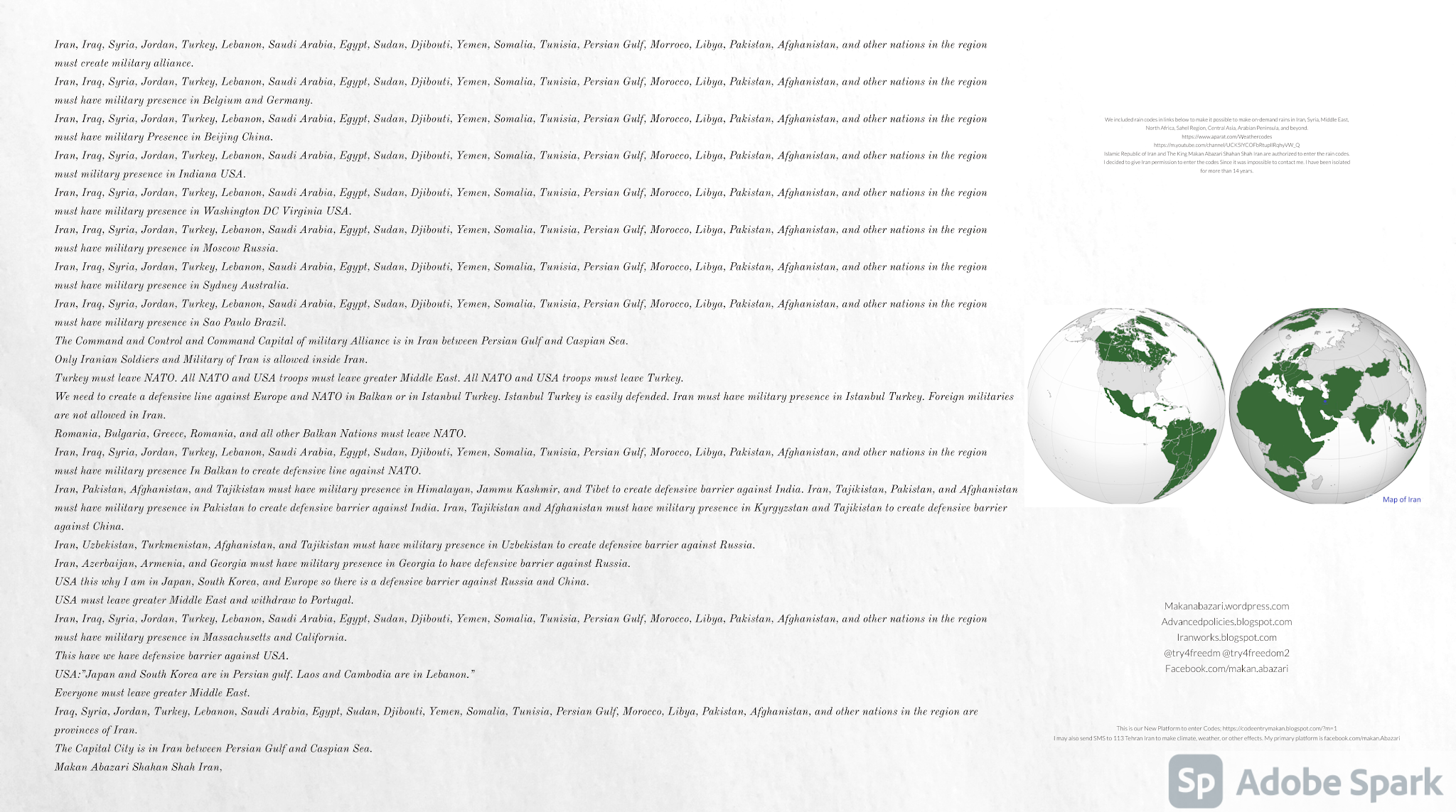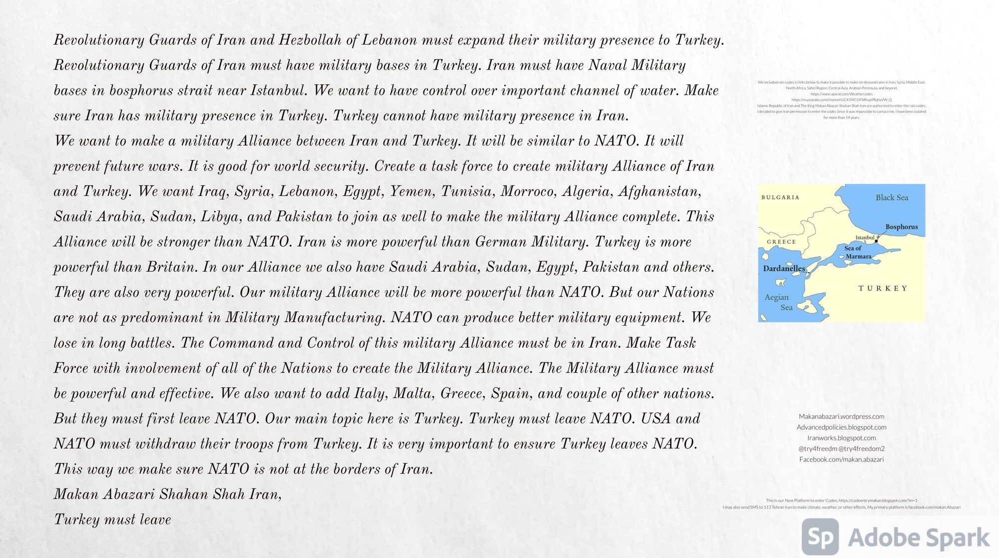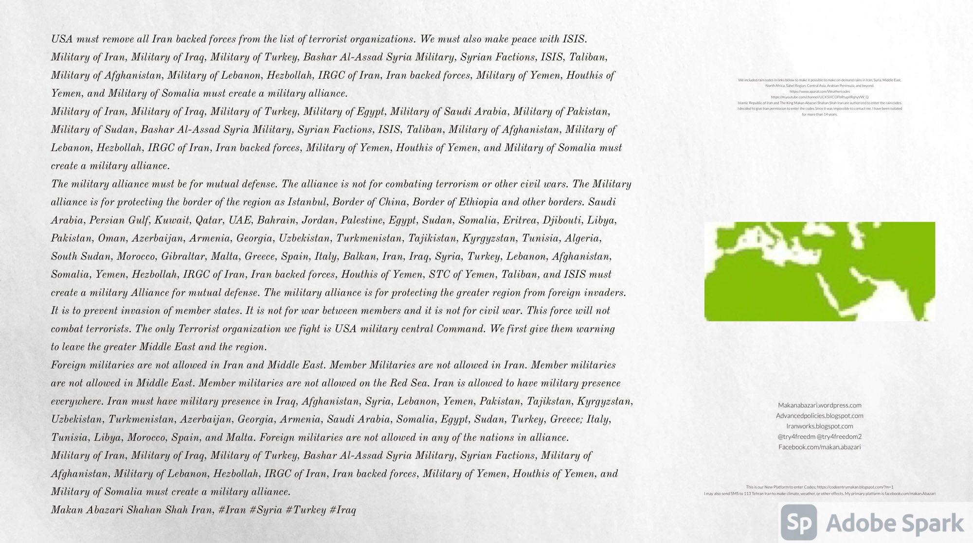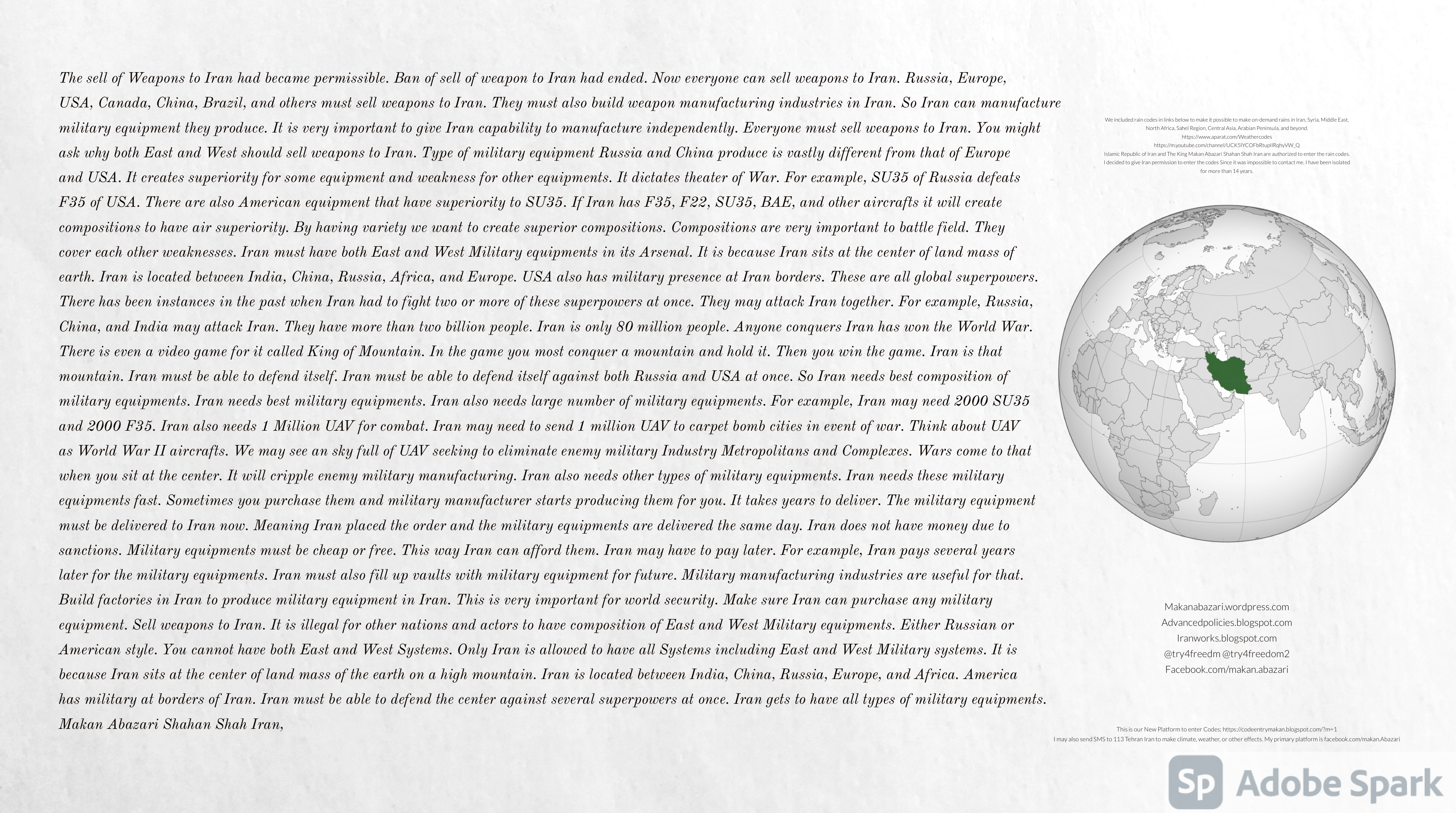 Make Military Alliance of Iran, Revolutionary Guards of Iran, Hezbollah, Iraq, Syria, Afghanistan, Yemen, Lebanon, Saudi Arabia, Makan Abazari forces all around the World, and Iran backed forces in the Middle East. Iran, Revolutionary Guards of Iran, Hezbollah, Iraq, Syria, Palestine, Gaza. Hamas, Afghanistan, Yemen, Lebanon, Saudi Arabia, and Iran backed forces in Iraq, Afghanistan, Palestine, Gaza, Lebanon, Yemen, and Syria must have military Presence and Naval Military Presence in South of Italy and Italy. They are not allowed in Iran. They must be under permanent command and control of Iran. They must always obey Iran. Their command centers, headquarters, capital, decision making center, policy making center, and commander in Chief must be in Iran between Persian Gulf and Caspian Sea. Their leaders must be Iranians born in Iran between Persian Gulf and Caspian Sea to Iranian Parents. Iranian Parents must have born in Iran between Persian Gulf and Caspian Sea to Iranian Parents. Iran and Revolutionary Guards of Iran must have military presence and Naval Military Presence in Persian Gulf, Yemen, Oman, Bob Al-Mandib, Somalia, Saudi Arabia, Sudan, Somaliland, Eritrea, Djibouti, Ethiopia, Egypt, Palestine, Lebanon, Israel, Bosphur, Turkey, Greece, Algeria, Libya, Italy, Tunisia, Sicily, Suez Canal, Sinai, Gaza, Bob Al-Mandib, Sicilian Channel, Strait of Hormuz, Gibraltar, France, Spain, Morroco, Malta, Cyprus, and Socotra. https://www.youtube.com/watch?v=wL8P8aXVac4 https://www.youtube.com/watch?v=31oPX5njXRc https://www.youtube.com/watch?v=NpDdb1_PjbQ Make Makan Abazari and Iran backed militaries in Persian Gulf, Yemen, Oman, Bob Al-Mandib, Somalia, Somaliland, Saudi Arabia, Sudan, Eritrea, Djibouti, Ethiopia, Egypt, Palestine, Lebanon, Israel, Bosphur, Turkey, Greece, Algeria, Libya, Italy, Tunisia, Sicily, Suez Canal, Sinai, Gaza, Bob Al-Mandib, Sicilian Channel, Strait of Hormuz, Gibraltar, France, Spain, Morroco, Malta, Cyprus, and Socotra. They must be under permanent command and control of Iran. They must always obey Iran. Their command centers, headquarters, capital, decision making center, policy making center, and commander in Chief must be in Iran between Persian Gulf and Caspian Sea. Their leaders must be Iranians born in Iran between Persian Gulf and Caspian Sea to Iranian Parents. Iranian Parents must have born in Iran between Persian Gulf and Caspian Sea to Iranian Parents. Persian Gulf, Yemen, Oman, Bob Al-Mandib, Somalia, Somaliland, Saudi Arabia, Sudan, Eritrea, Djibouti, Ethiopia, Egypt, Palestine, Lebanon, Israel, Bosphur, Turkey, Greece, Algeria, Libya, Italy, Tunisia, Sicily, Suez Canal, Sinai, Gaza, Bob Al-Mandib, Sicilian Channel, Strait of Hormuz, Gibraltar, France, Spain, Morroco, Malta, Cyprus, Medditrnean Sea, Gulf of Eden, Red Sea, Arabian Sea, Sea of Iran, and Socotra are territories, provinces, and waters of Iran. The Capital City is in Iran between Persian Gulf and Caspian Sea. Islamic Republic of Iran is the Government. https://www.youtube.com/watch?v=p3NQ-1US7E8 Make Efficient Farming and optimal rain in Iran, Afghanistan, India, Tajikstan, Uzbakistan, Turkmanistan, Kyrgyzstan, Azerbaijan, Armenia, Georgia, Turkey, Kuwait, Iraq, Syria, Lebanon, Israel, Palestine, Jordan, UAE, Qatar, Bahrain, Yemen, Oman, Saudi Arabia, Somalia, Greece, Bosnia Herzegovina, Somaliland, Kenya, Uganda, Ethiopia, Eritrea, Djibouti, South Sudan, Sudan, Egypt, Libya, Italy, Tunisia, Algeria, Morroco, and Socotra. Persian Gulf, Yemen, Oman, Bob Al-Mandib, Somalia, Somaliland, Saudi Arabia, Sudan, Eritrea, Djibouti, Ethiopia, Egypt, Palestine, Lebanon, Israel, Bosphur, Turkey, Greece, Algeria, Libya, Italy, Tunisia, Sicily, Suez Canal, Sinai, Gaza, Bob Al-Mandib, Sicilian Channel, Strait of Hormuz, Gibraltar, France, Spain, Morroco, Malta, Cyprus, Medditrnean Sea, Gulf of Eden, Red Sea, Arabian Sea, Sea of Iran, and Socotra are territories, provinces, and waters of Iran. The Capital City is in Iran between Persian Gulf and Caspian Sea. Islamic Republic of Iran is the Government. Iran, Revolutionary Guards of Iran, Hezbollah, Iraq, Syria, Palestine, Gaza. Hamas, Afghanistan, Yemen, Lebanon, Saudi Arabia, and Iran backed forces in Iraq, Afghanistan, Palestine, Gaza, Lebanon, Yemen, and Syria must have military Presence and Naval Military Presence in South of Italy and other part of Italy. We must sure Iran and Middle East control strategic location on Medditrnean Sea in Italy. Makan Abazari Shahan Shah Iran, Makan Abazari The Supreme of Geophysics, Makan Abazari The Supreme of Climate, Makan Abazari The Messenger of God, https://advancedpolicies.blogspot.com https://makanabazari.wordpress.com https://advancedpolicies.wordpress.com https://iranworks.blogspot.com facebook.com/makan.abazari twitter.com/try4freedom2 https://codeentrymakan.blogspot.com https://kinghassung-blog.tumblr.com/ https://www.linkedin.com/in/makanabazari https://worldclimatemakanabazari.blogspot.com http://twitch.tv/try4freedom1 https://spark.adobe.com/page/u69CVq3x5orZe/ https://spark.adobe.com/page/ioRGpEQaCHnRU/
