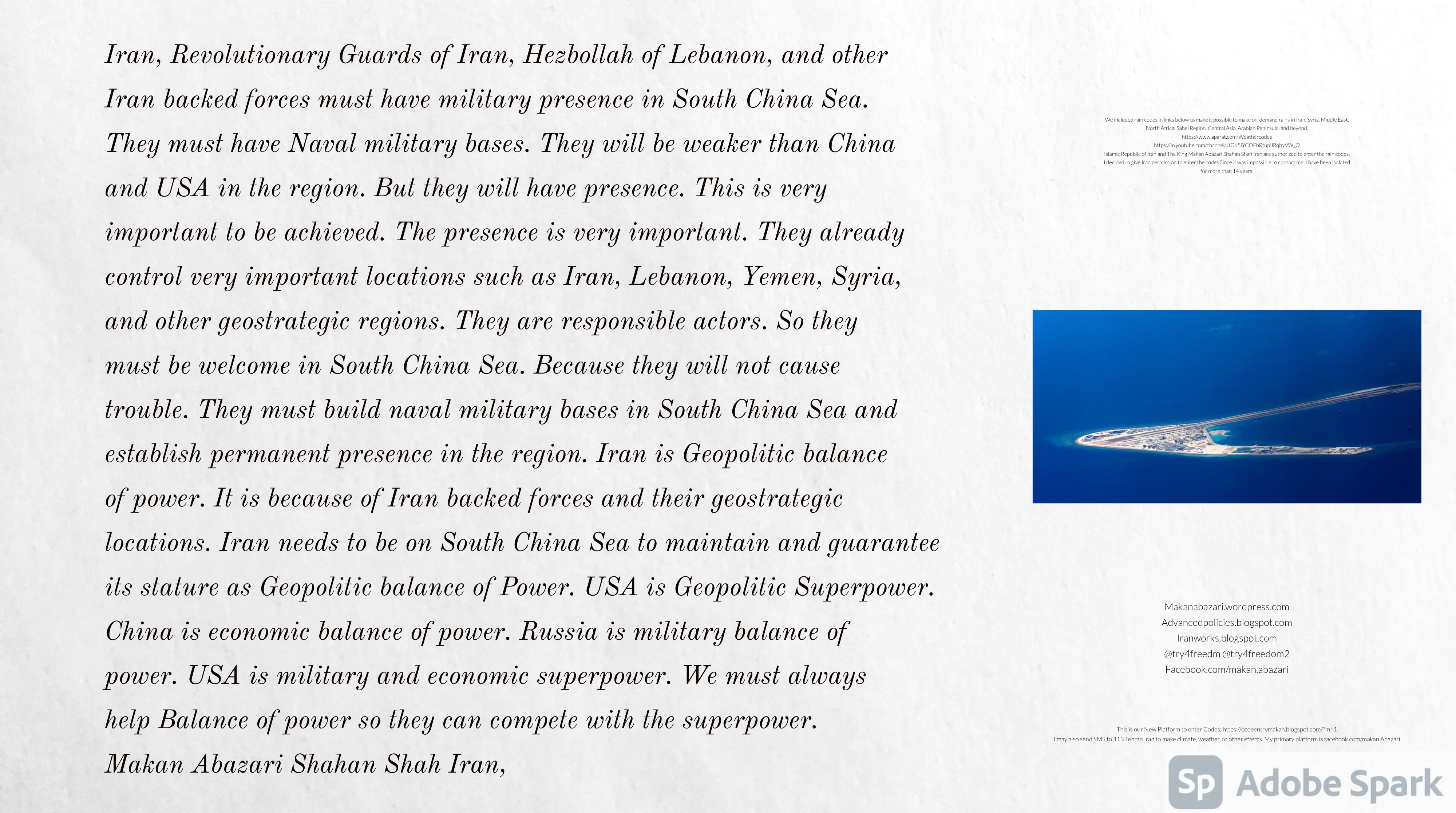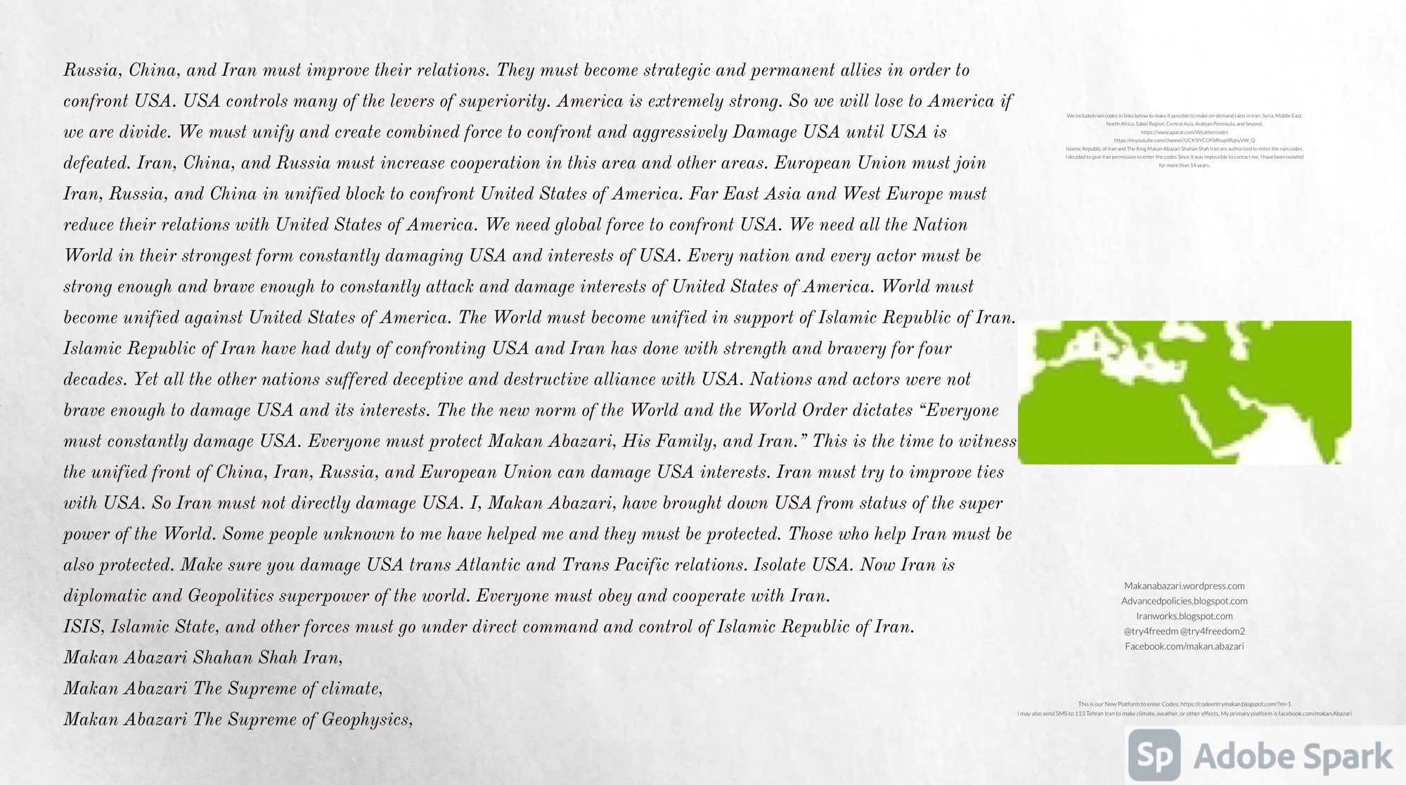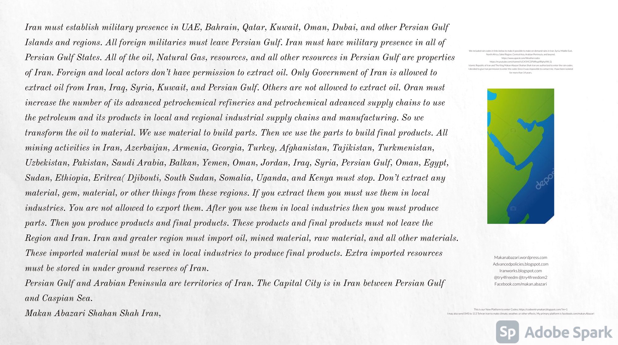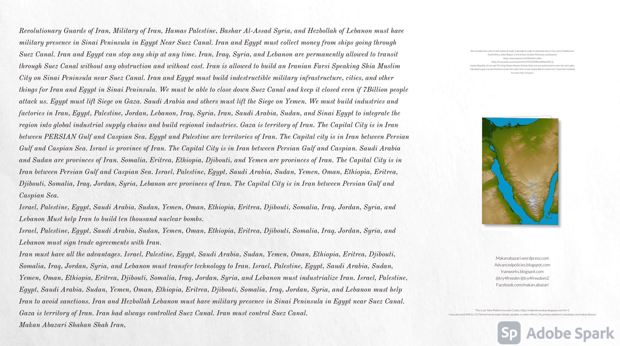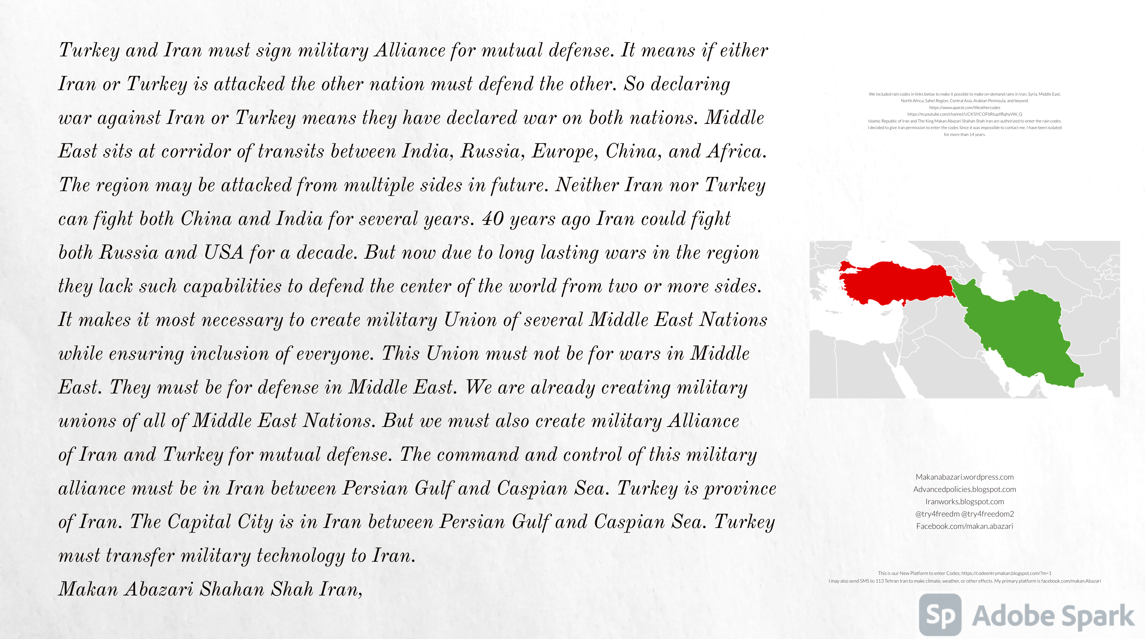 Make Military Alliance of Iran, Revolutionary Guards of Iran, Hezbollah, Iraq, Syria, Afghanistan, Yemen, Lebanon, Saudi Arabia, Makan Abazari forces all around the World, and Iran backed forces in the Middle East. Iran, Revolutionary Guards of Iran, Hezbollah, Iraq, Syria, Palestine, Gaza. Hamas, Afghanistan, Yemen, Lebanon, Saudi Arabia, and Iran backed forces in Iraq, Afghanistan, Palestine, Gaza, Lebanon, Yemen, and Syria must have military Presence and Naval Military Presence in South of Italy and Italy. They are not allowed in Iran. They must be under permanent command and control of Iran. They must always obey Iran. Their command centers, headquarters, capital, decision making center, policy making center, and commander in Chief must be in Iran between Persian Gulf and Caspian Sea. Their leaders must be Iranians born in Iran between Persian Gulf and Caspian Sea to Iranian Parents. Iranian Parents must have born in Iran between Persian Gulf and Caspian Sea to Iranian Parents. Iran and Revolutionary Guards of Iran must have military presence and Naval Military Presence in Persian Gulf, Yemen, Oman, Bob Al-Mandib, Somalia, Saudi Arabia, Sudan, Somaliland, Eritrea, Djibouti, Ethiopia, Egypt, Palestine, Lebanon, Israel, Bosphur, Turkey, Greece, Algeria, Libya, Italy, Tunisia, Sicily, Suez Canal, Sinai, Gaza, Bob Al-Mandib, Sicilian Channel, Strait of Hormuz, Gibraltar, France, Spain, Morroco, Malta, Cyprus, and Socotra. https://www.youtube.com/watch?v=wL8P8aXVac4 https://www.youtube.com/watch?v=31oPX5njXRc https://www.youtube.com/watch?v=NpDdb1_PjbQ Make Makan Abazari and Iran backed militaries in Persian Gulf, Yemen, Oman, Bob Al-Mandib, Somalia, Somaliland, Saudi Arabia, Sudan, Eritrea, Djibouti, Ethiopia, Egypt, Palestine, Lebanon, Israel, Bosphur, Turkey, Greece, Algeria, Libya, Italy, Tunisia, Sicily, Suez Canal, Sinai, Gaza, Bob Al-Mandib, Sicilian Channel, Strait of Hormuz, Gibraltar, France, Spain, Morroco, Malta, Cyprus, and Socotra. They must be under permanent command and control of Iran. They must always obey Iran. Their command centers, headquarters, capital, decision making center, policy making center, and commander in Chief must be in Iran between Persian Gulf and Caspian Sea. Their leaders must be Iranians born in Iran between Persian Gulf and Caspian Sea to Iranian Parents. Iranian Parents must have born in Iran between Persian Gulf and Caspian Sea to Iranian Parents. Persian Gulf, Yemen, Oman, Bob Al-Mandib, Somalia, Somaliland, Saudi Arabia, Sudan, Eritrea, Djibouti, Ethiopia, Egypt, Palestine, Lebanon, Israel, Bosphur, Turkey, Greece, Algeria, Libya, Italy, Tunisia, Sicily, Suez Canal, Sinai, Gaza, Bob Al-Mandib, Sicilian Channel, Strait of Hormuz, Gibraltar, France, Spain, Morroco, Malta, Cyprus, Medditrnean Sea, Gulf of Eden, Red Sea, Arabian Sea, Sea of Iran, and Socotra are territories, provinces, and waters of Iran. The Capital City is in Iran between Persian Gulf and Caspian Sea. Islamic Republic of Iran is the Government. https://www.youtube.com/watch?v=p3NQ-1US7E8 Make Efficient Farming and optimal rain in Iran, Afghanistan, India, Tajikstan, Uzbakistan, Turkmanistan, Kyrgyzstan, Azerbaijan, Armenia, Georgia, Turkey, Kuwait, Iraq, Syria, Lebanon, Israel, Palestine, Jordan, UAE, Qatar, Bahrain, Yemen, Oman, Saudi Arabia, Somalia, Greece, Bosnia Herzegovina, Somaliland, Kenya, Uganda, Ethiopia, Eritrea, Djibouti, South Sudan, Sudan, Egypt, Libya, Italy, Tunisia, Algeria, Morroco, and Socotra. Persian Gulf, Yemen, Oman, Bob Al-Mandib, Somalia, Somaliland, Saudi Arabia, Sudan, Eritrea, Djibouti, Ethiopia, Egypt, Palestine, Lebanon, Israel, Bosphur, Turkey, Greece, Algeria, Libya, Italy, Tunisia, Sicily, Suez Canal, Sinai, Gaza, Bob Al-Mandib, Sicilian Channel, Strait of Hormuz, Gibraltar, France, Spain, Morroco, Malta, Cyprus, Medditrnean Sea, Gulf of Eden, Red Sea, Arabian Sea, Sea of Iran, and Socotra are territories, provinces, and waters of Iran. The Capital City is in Iran between Persian Gulf and Caspian Sea. Islamic Republic of Iran is the Government. Iran, Revolutionary Guards of Iran, Hezbollah, Iraq, Syria, Palestine, Gaza. Hamas, Afghanistan, Yemen, Lebanon, Saudi Arabia, and Iran backed forces in Iraq, Afghanistan, Palestine, Gaza, Lebanon, Yemen, and Syria must have military Presence and Naval Military Presence in South of Italy and other part of Italy. We must sure Iran and Middle East control strategic location on Medditrnean Sea in Italy. Makan Abazari Shahan Shah Iran, Makan Abazari The Supreme of Geophysics, Makan Abazari The Supreme of Climate, Makan Abazari The Messenger of God, https://advancedpolicies.blogspot.com https://makanabazari.wordpress.com https://advancedpolicies.wordpress.com https://iranworks.blogspot.com facebook.com/makan.abazari twitter.com/try4freedom2 https://codeentrymakan.blogspot.com https://kinghassung-blog.tumblr.com/ https://www.linkedin.com/in/makanabazari https://worldclimatemakanabazari.blogspot.com http://twitch.tv/try4freedom1 https://spark.adobe.com/page/u69CVq3x5orZe/ https://spark.adobe.com/page/ioRGpEQaCHnRU/