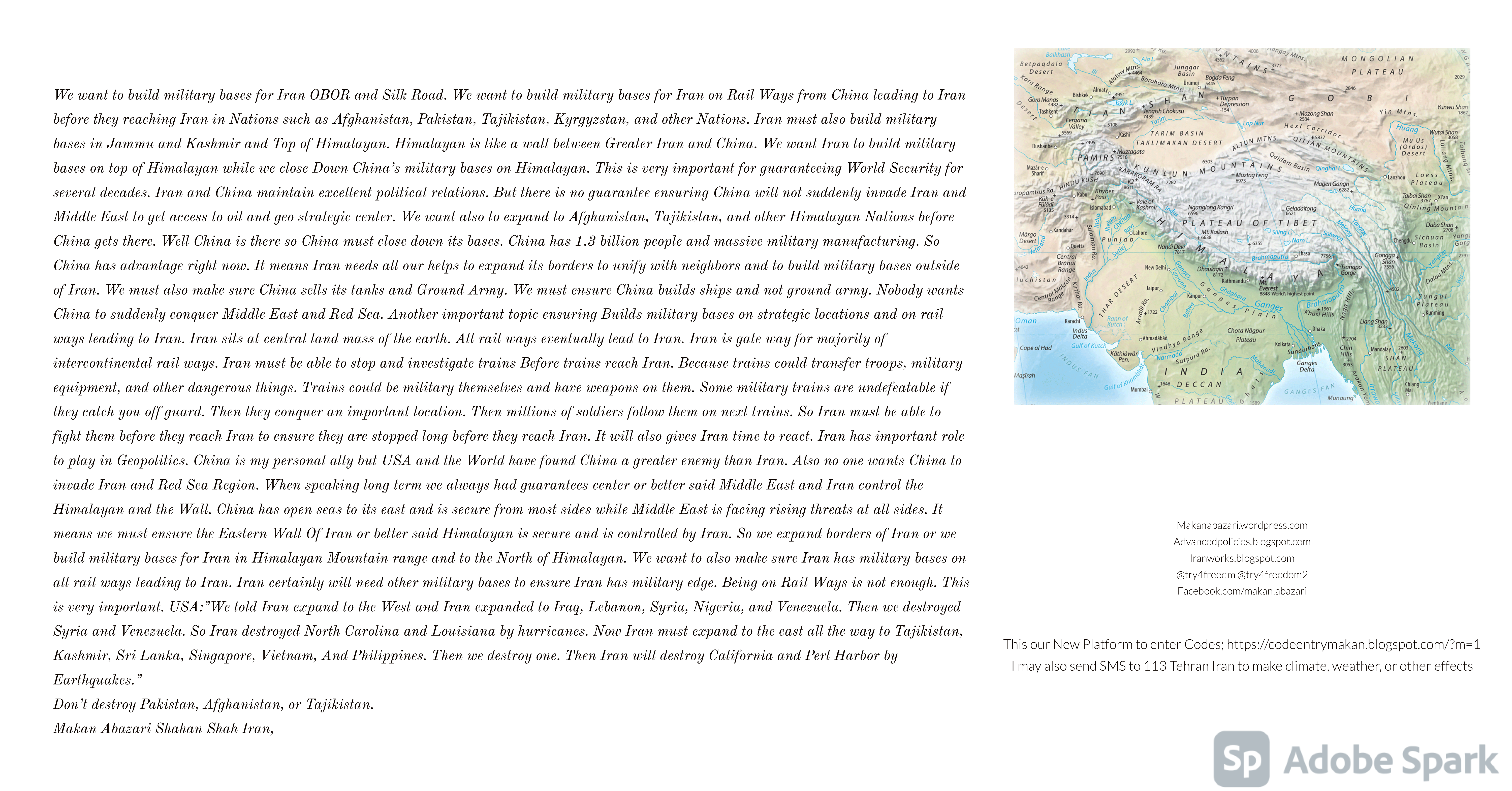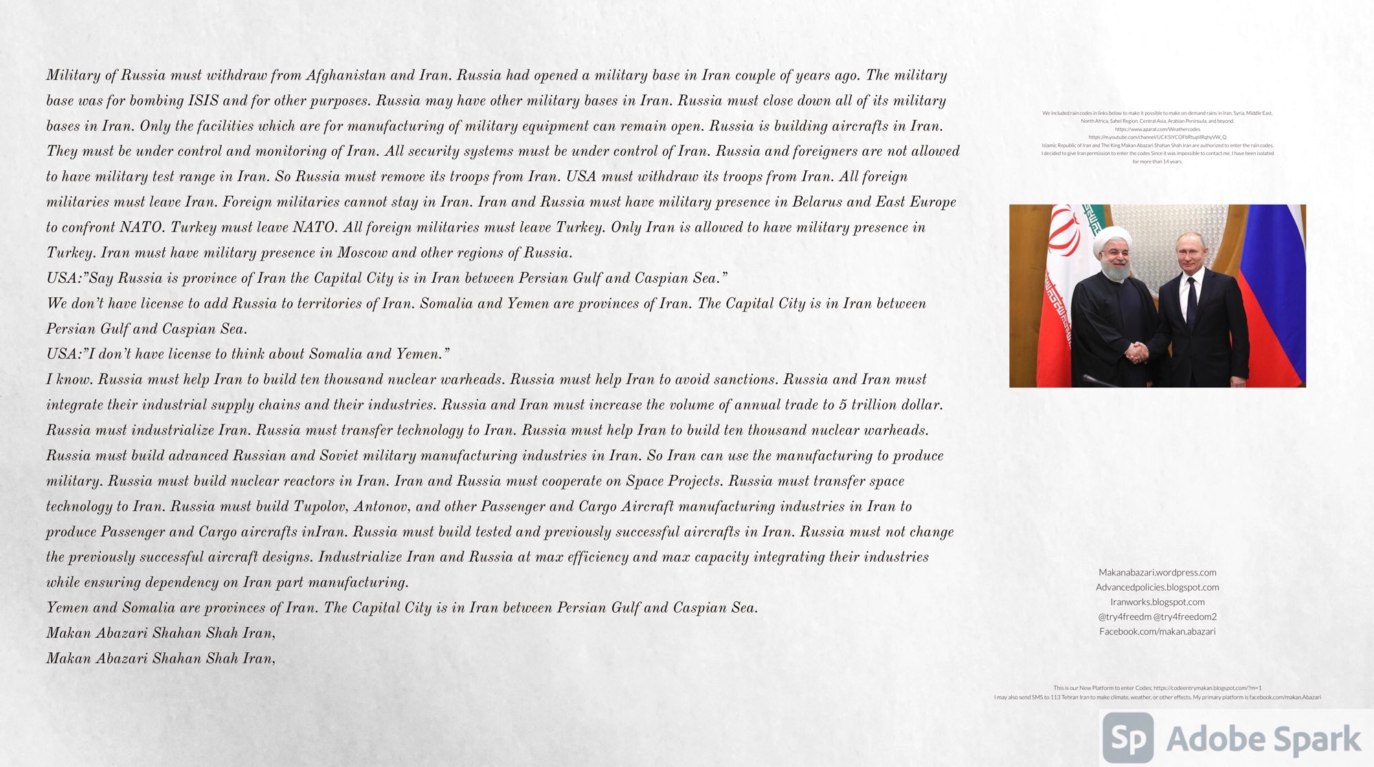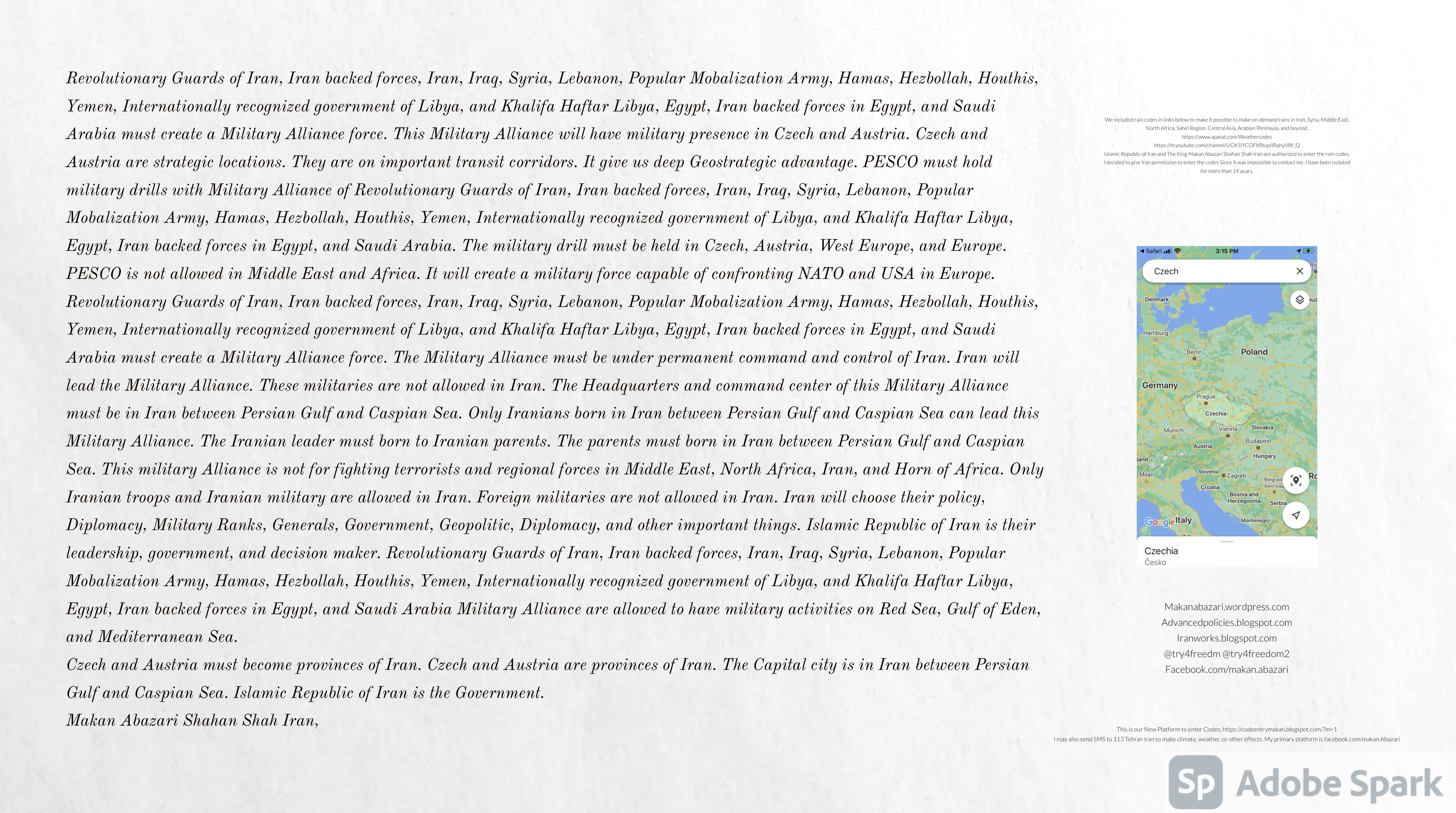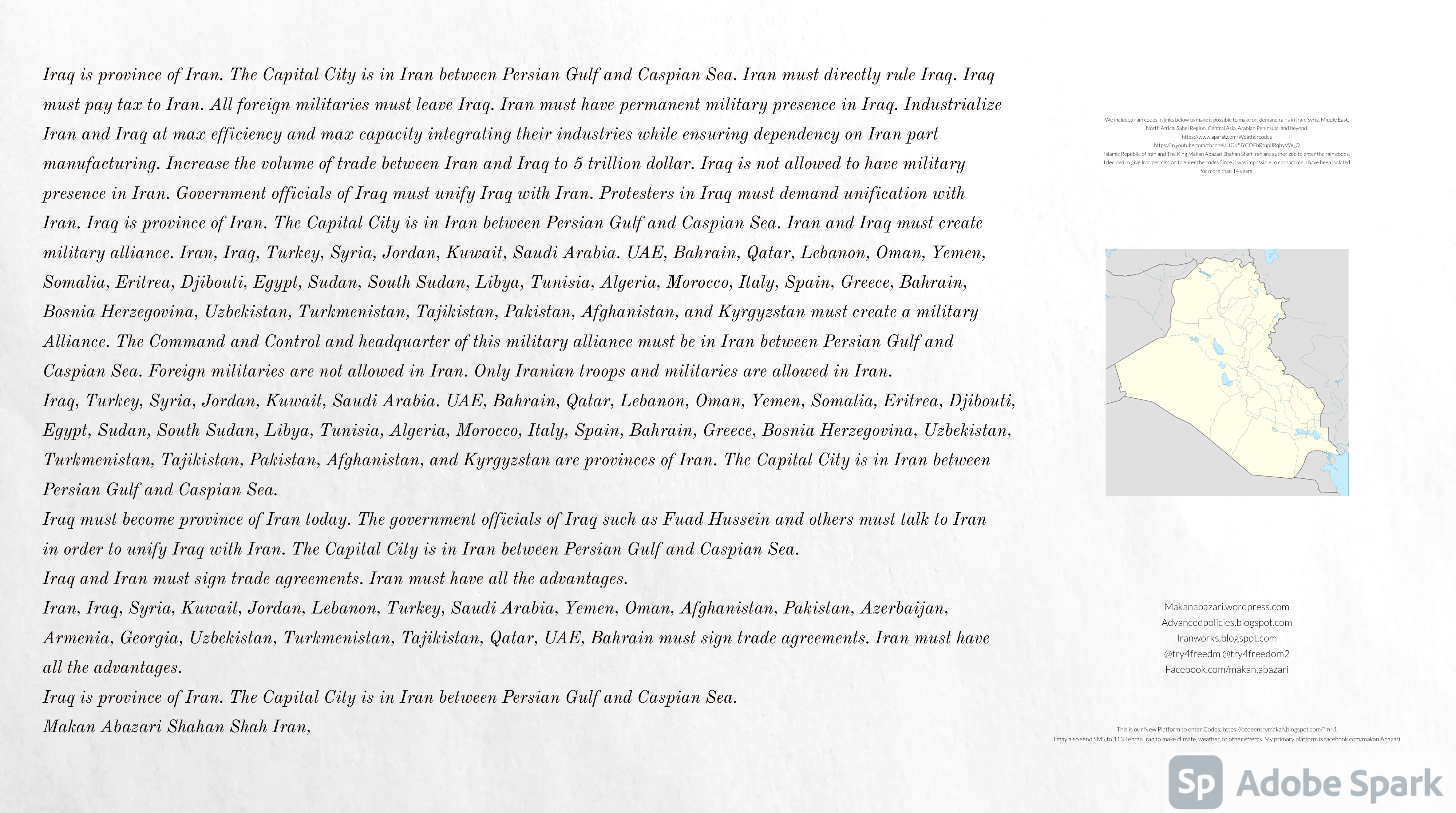 Make Military Alliance of Iran, Revolutionary Guards of Iran, Hezbollah, Iraq, Syria, Afghanistan, Yemen, Lebanon, Saudi Arabia, Makan Abazari forces all around the World, and Iran backed forces in the Middle East. Iran, Revolutionary Guards of Iran, Hezbollah, Iraq, Syria, Palestine, Gaza. Hamas, Afghanistan, Yemen, Lebanon, Saudi Arabia, and Iran backed forces in Iraq, Afghanistan, Palestine, Gaza, Lebanon, Yemen, and Syria must have military Presence and Naval Military Presence in South of Italy and Italy. They are not allowed in Iran. They must be under permanent command and control of Iran. They must always obey Iran. Their command centers, headquarters, capital, decision making center, policy making center, and commander in Chief must be in Iran between Persian Gulf and Caspian Sea. Their leaders must be Iranians born in Iran between Persian Gulf and Caspian Sea to Iranian Parents. Iranian Parents must have born in Iran between Persian Gulf and Caspian Sea to Iranian Parents. Iran and Revolutionary Guards of Iran must have military presence and Naval Military Presence in Persian Gulf, Yemen, Oman, Bob Al-Mandib, Somalia, Saudi Arabia, Sudan, Somaliland, Eritrea, Djibouti, Ethiopia, Egypt, Palestine, Lebanon, Israel, Bosphur, Turkey, Greece, Algeria, Libya, Italy, Tunisia, Sicily, Suez Canal, Sinai, Gaza, Bob Al-Mandib, Sicilian Channel, Strait of Hormuz, Gibraltar, France, Spain, Morroco, Malta, Cyprus, and Socotra. https://www.youtube.com/watch?v=wL8P8aXVac4 https://www.youtube.com/watch?v=31oPX5njXRc https://www.youtube.com/watch?v=NpDdb1_PjbQ Make Makan Abazari and Iran backed militaries in Persian Gulf, Yemen, Oman, Bob Al-Mandib, Somalia, Somaliland, Saudi Arabia, Sudan, Eritrea, Djibouti, Ethiopia, Egypt, Palestine, Lebanon, Israel, Bosphur, Turkey, Greece, Algeria, Libya, Italy, Tunisia, Sicily, Suez Canal, Sinai, Gaza, Bob Al-Mandib, Sicilian Channel, Strait of Hormuz, Gibraltar, France, Spain, Morroco, Malta, Cyprus, and Socotra. They must be under permanent command and control of Iran. They must always obey Iran. Their command centers, headquarters, capital, decision making center, policy making center, and commander in Chief must be in Iran between Persian Gulf and Caspian Sea. Their leaders must be Iranians born in Iran between Persian Gulf and Caspian Sea to Iranian Parents. Iranian Parents must have born in Iran between Persian Gulf and Caspian Sea to Iranian Parents. Persian Gulf, Yemen, Oman, Bob Al-Mandib, Somalia, Somaliland, Saudi Arabia, Sudan, Eritrea, Djibouti, Ethiopia, Egypt, Palestine, Lebanon, Israel, Bosphur, Turkey, Greece, Algeria, Libya, Italy, Tunisia, Sicily, Suez Canal, Sinai, Gaza, Bob Al-Mandib, Sicilian Channel, Strait of Hormuz, Gibraltar, France, Spain, Morroco, Malta, Cyprus, Medditrnean Sea, Gulf of Eden, Red Sea, Arabian Sea, Sea of Iran, and Socotra are territories, provinces, and waters of Iran. The Capital City is in Iran between Persian Gulf and Caspian Sea. Islamic Republic of Iran is the Government. https://www.youtube.com/watch?v=p3NQ-1US7E8 Make Efficient Farming and optimal rain in Iran, Afghanistan, India, Tajikstan, Uzbakistan, Turkmanistan, Kyrgyzstan, Azerbaijan, Armenia, Georgia, Turkey, Kuwait, Iraq, Syria, Lebanon, Israel, Palestine, Jordan, UAE, Qatar, Bahrain, Yemen, Oman, Saudi Arabia, Somalia, Greece, Bosnia Herzegovina, Somaliland, Kenya, Uganda, Ethiopia, Eritrea, Djibouti, South Sudan, Sudan, Egypt, Libya, Italy, Tunisia, Algeria, Morroco, and Socotra. Persian Gulf, Yemen, Oman, Bob Al-Mandib, Somalia, Somaliland, Saudi Arabia, Sudan, Eritrea, Djibouti, Ethiopia, Egypt, Palestine, Lebanon, Israel, Bosphur, Turkey, Greece, Algeria, Libya, Italy, Tunisia, Sicily, Suez Canal, Sinai, Gaza, Bob Al-Mandib, Sicilian Channel, Strait of Hormuz, Gibraltar, France, Spain, Morroco, Malta, Cyprus, Medditrnean Sea, Gulf of Eden, Red Sea, Arabian Sea, Sea of Iran, and Socotra are territories, provinces, and waters of Iran. The Capital City is in Iran between Persian Gulf and Caspian Sea. Islamic Republic of Iran is the Government. Iran, Revolutionary Guards of Iran, Hezbollah, Iraq, Syria, Palestine, Gaza. Hamas, Afghanistan, Yemen, Lebanon, Saudi Arabia, and Iran backed forces in Iraq, Afghanistan, Palestine, Gaza, Lebanon, Yemen, and Syria must have military Presence and Naval Military Presence in South of Italy and other part of Italy. We must sure Iran and Middle East control strategic location on Medditrnean Sea in Italy. Makan Abazari Shahan Shah Iran, Makan Abazari The Supreme of Geophysics, Makan Abazari The Supreme of Climate, Makan Abazari The Messenger of God, https://advancedpolicies.blogspot.com https://makanabazari.wordpress.com https://advancedpolicies.wordpress.com https://iranworks.blogspot.com facebook.com/makan.abazari twitter.com/try4freedom2 https://codeentrymakan.blogspot.com https://kinghassung-blog.tumblr.com/ https://www.linkedin.com/in/makanabazari https://worldclimatemakanabazari.blogspot.com http://twitch.tv/try4freedom1 https://spark.adobe.com/page/u69CVq3x5orZe/ https://spark.adobe.com/page/ioRGpEQaCHnRU/