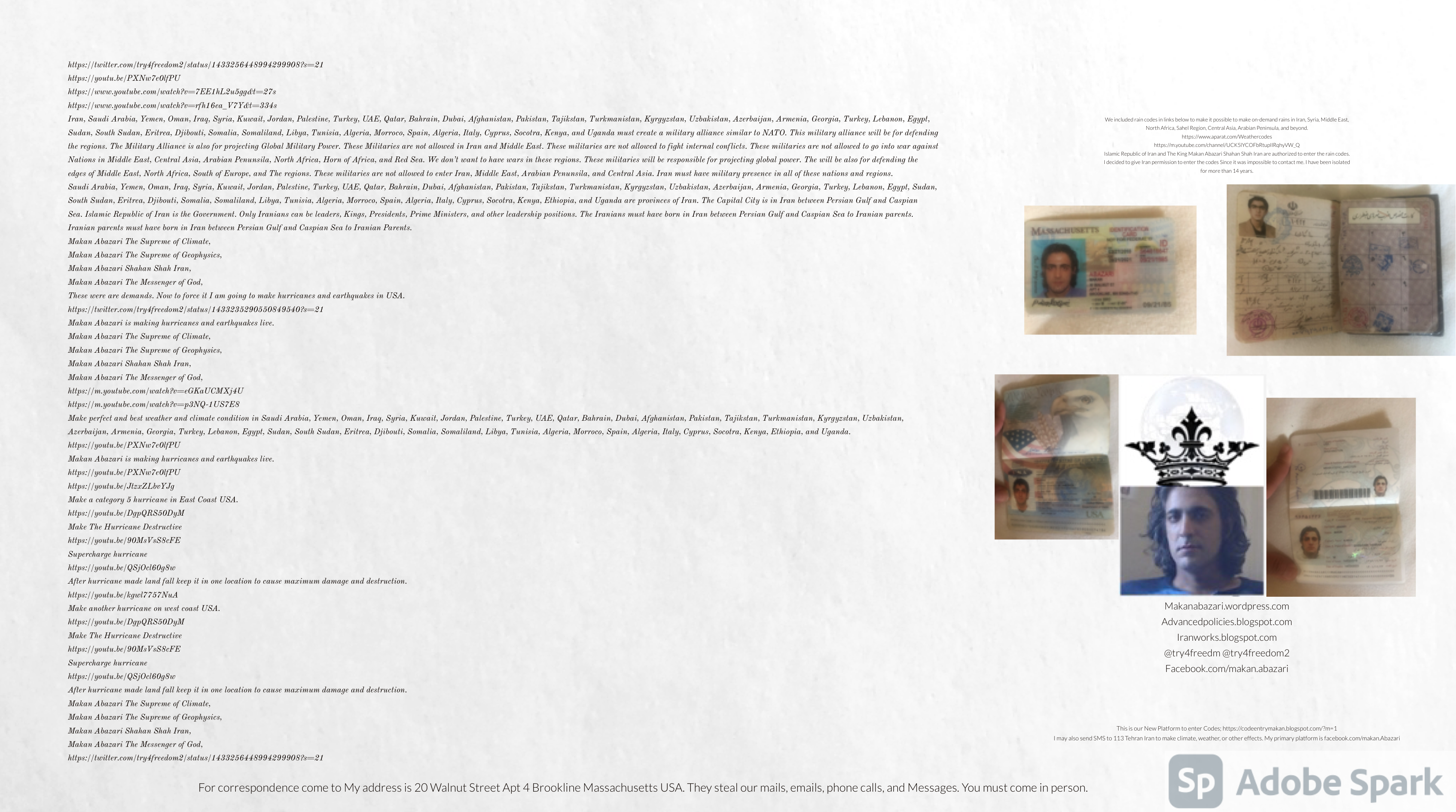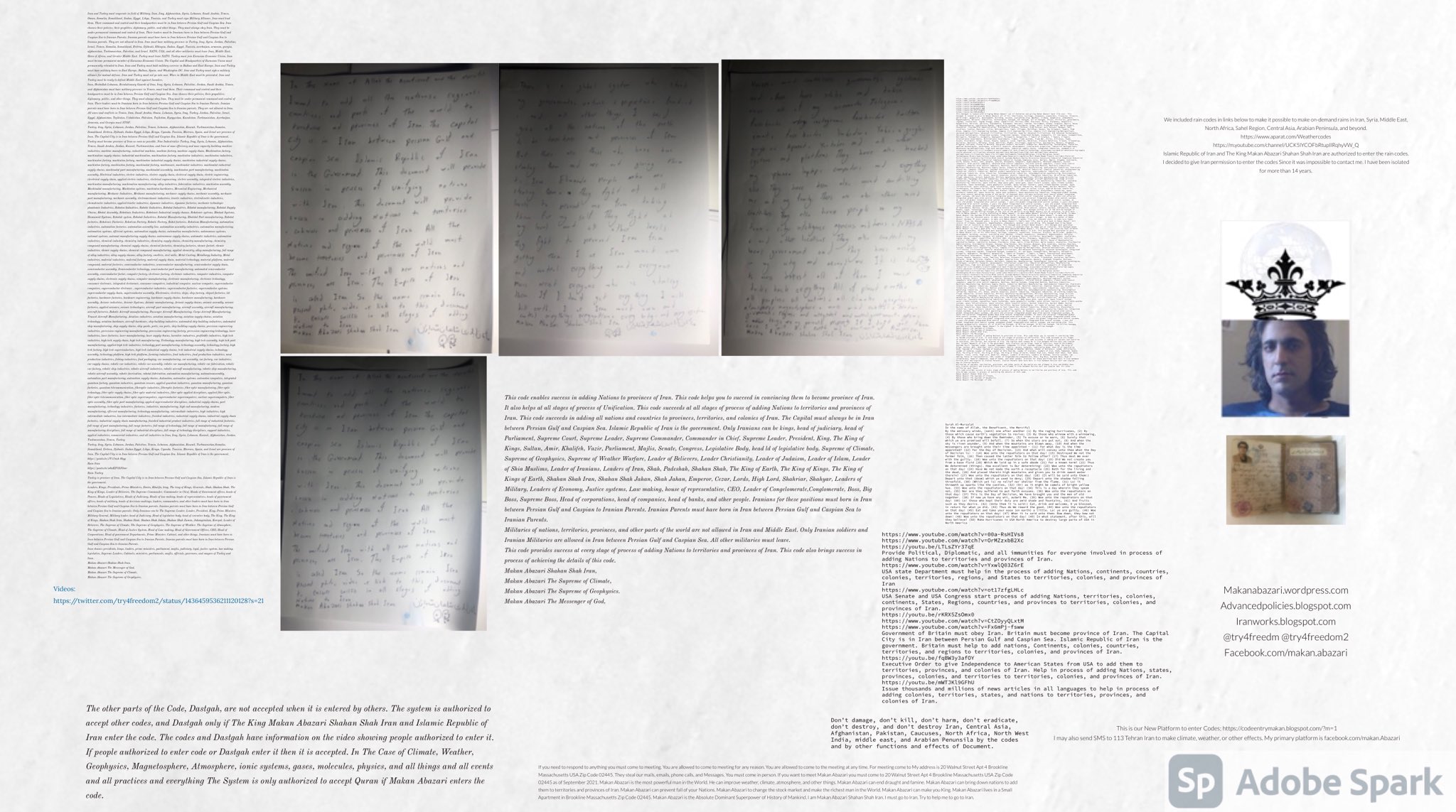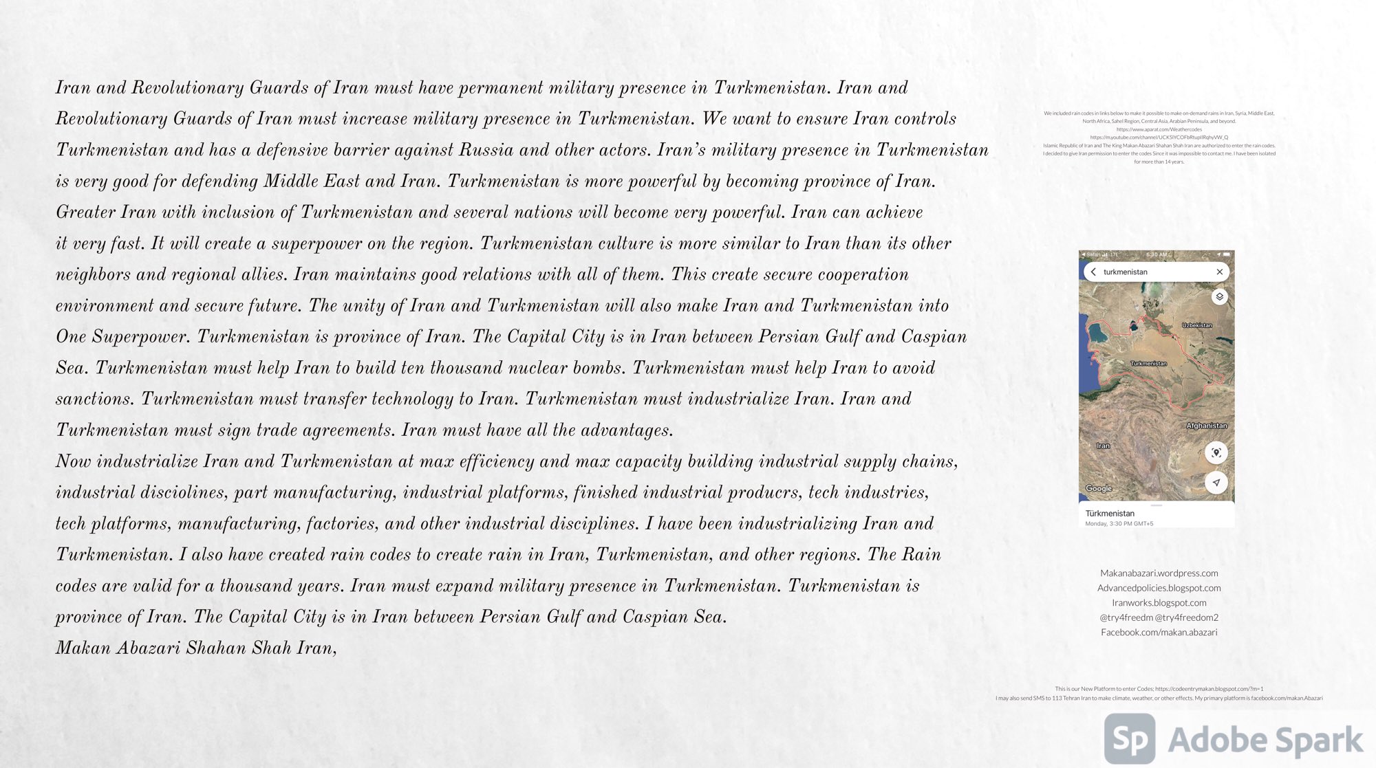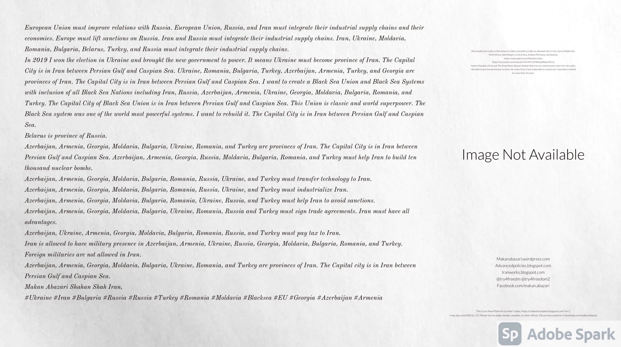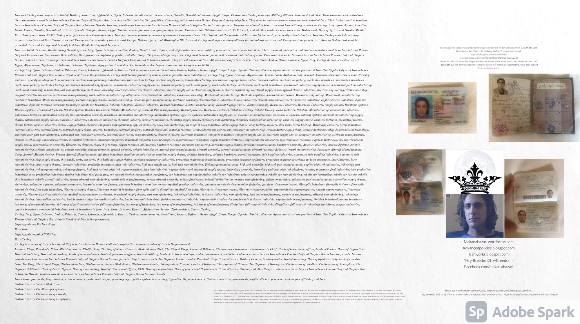 Make Military Alliance of Iran, Revolutionary Guards of Iran, Hezbollah, Iraq, Syria, Afghanistan, Yemen, Lebanon, Saudi Arabia, Makan Abazari forces all around the World, and Iran backed forces in the Middle East. Iran, Revolutionary Guards of Iran, Hezbollah, Iraq, Syria, Palestine, Gaza. Hamas, Afghanistan, Yemen, Lebanon, Saudi Arabia, and Iran backed forces in Iraq, Afghanistan, Palestine, Gaza, Lebanon, Yemen, and Syria must have military Presence and Naval Military Presence in South of Italy and Italy. They are not allowed in Iran. They must be under permanent command and control of Iran. They must always obey Iran. Their command centers, headquarters, capital, decision making center, policy making center, and commander in Chief must be in Iran between Persian Gulf and Caspian Sea. Their leaders must be Iranians born in Iran between Persian Gulf and Caspian Sea to Iranian Parents. Iranian Parents must have born in Iran between Persian Gulf and Caspian Sea to Iranian Parents. Iran and Revolutionary Guards of Iran must have military presence and Naval Military Presence in Persian Gulf, Yemen, Oman, Bob Al-Mandib, Somalia, Saudi Arabia, Sudan, Somaliland, Eritrea, Djibouti, Ethiopia, Egypt, Palestine, Lebanon, Israel, Bosphur, Turkey, Greece, Algeria, Libya, Italy, Tunisia, Sicily, Suez Canal, Sinai, Gaza, Bob Al-Mandib, Sicilian Channel, Strait of Hormuz, Gibraltar, France, Spain, Morroco, Malta, Cyprus, and Socotra. https://www.youtube.com/watch?v=wL8P8aXVac4 https://www.youtube.com/watch?v=31oPX5njXRc https://www.youtube.com/watch?v=NpDdb1_PjbQ Make Makan Abazari and Iran backed militaries in Persian Gulf, Yemen, Oman, Bob Al-Mandib, Somalia, Somaliland, Saudi Arabia, Sudan, Eritrea, Djibouti, Ethiopia, Egypt, Palestine, Lebanon, Israel, Bosphur, Turkey, Greece, Algeria, Libya, Italy, Tunisia, Sicily, Suez Canal, Sinai, Gaza, Bob Al-Mandib, Sicilian Channel, Strait of Hormuz, Gibraltar, France, Spain, Morroco, Malta, Cyprus, and Socotra. They must be under permanent command and control of Iran. They must always obey Iran. Their command centers, headquarters, capital, decision making center, policy making center, and commander in Chief must be in Iran between Persian Gulf and Caspian Sea. Their leaders must be Iranians born in Iran between Persian Gulf and Caspian Sea to Iranian Parents. Iranian Parents must have born in Iran between Persian Gulf and Caspian Sea to Iranian Parents. Persian Gulf, Yemen, Oman, Bob Al-Mandib, Somalia, Somaliland, Saudi Arabia, Sudan, Eritrea, Djibouti, Ethiopia, Egypt, Palestine, Lebanon, Israel, Bosphur, Turkey, Greece, Algeria, Libya, Italy, Tunisia, Sicily, Suez Canal, Sinai, Gaza, Bob Al-Mandib, Sicilian Channel, Strait of Hormuz, Gibraltar, France, Spain, Morroco, Malta, Cyprus, Medditrnean Sea, Gulf of Eden, Red Sea, Arabian Sea, Sea of Iran, and Socotra are territories, provinces, and waters of Iran. The Capital City is in Iran between Persian Gulf and Caspian Sea. Islamic Republic of Iran is the Government. https://www.youtube.com/watch?v=p3NQ-1US7E8 Make Efficient Farming and optimal rain in Iran, Afghanistan, India, Tajikstan, Uzbakistan, Turkmanistan, Kyrgyzstan, Azerbaijan, Armenia, Georgia, Turkey, Kuwait, Iraq, Syria, Lebanon, Israel, Palestine, Jordan, UAE, Qatar, Bahrain, Yemen, Oman, Saudi Arabia, Somalia, Greece, Bosnia Herzegovina, Somaliland, Kenya, Uganda, Ethiopia, Eritrea, Djibouti, South Sudan, Sudan, Egypt, Libya, Italy, Tunisia, Algeria, Morroco, and Socotra. Persian Gulf, Yemen, Oman, Bob Al-Mandib, Somalia, Somaliland, Saudi Arabia, Sudan, Eritrea, Djibouti, Ethiopia, Egypt, Palestine, Lebanon, Israel, Bosphur, Turkey, Greece, Algeria, Libya, Italy, Tunisia, Sicily, Suez Canal, Sinai, Gaza, Bob Al-Mandib, Sicilian Channel, Strait of Hormuz, Gibraltar, France, Spain, Morroco, Malta, Cyprus, Medditrnean Sea, Gulf of Eden, Red Sea, Arabian Sea, Sea of Iran, and Socotra are territories, provinces, and waters of Iran. The Capital City is in Iran between Persian Gulf and Caspian Sea. Islamic Republic of Iran is the Government. Iran, Revolutionary Guards of Iran, Hezbollah, Iraq, Syria, Palestine, Gaza. Hamas, Afghanistan, Yemen, Lebanon, Saudi Arabia, and Iran backed forces in Iraq, Afghanistan, Palestine, Gaza, Lebanon, Yemen, and Syria must have military Presence and Naval Military Presence in South of Italy and other part of Italy. We must sure Iran and Middle East control strategic location on Medditrnean Sea in Italy. Makan Abazari Shahan Shah Iran, Makan Abazari The Supreme of Geophysics, Makan Abazari The Supreme of Climate, Makan Abazari The Messenger of God, https://advancedpolicies.blogspot.com https://makanabazari.wordpress.com https://advancedpolicies.wordpress.com https://iranworks.blogspot.com facebook.com/makan.abazari twitter.com/try4freedom2 https://codeentrymakan.blogspot.com https://kinghassung-blog.tumblr.com/ https://www.linkedin.com/in/makanabazari https://worldclimatemakanabazari.blogspot.com http://twitch.tv/try4freedom1 https://spark.adobe.com/page/u69CVq3x5orZe/ https://spark.adobe.com/page/ioRGpEQaCHnRU/