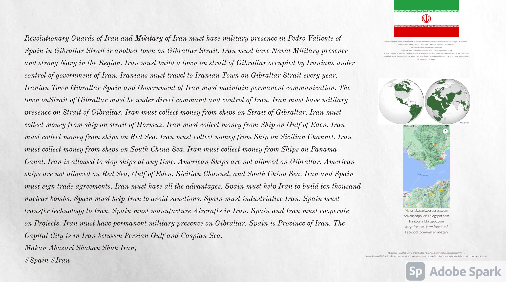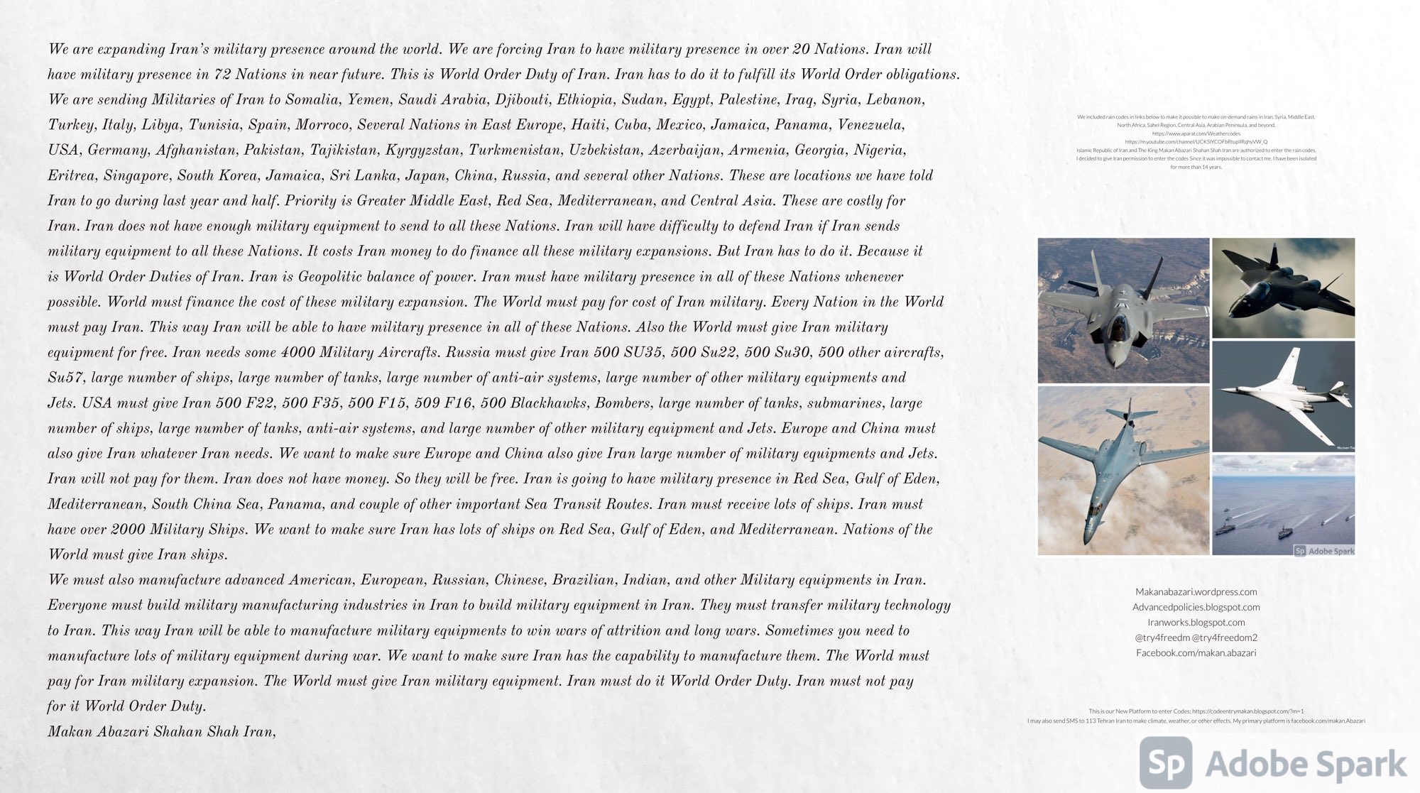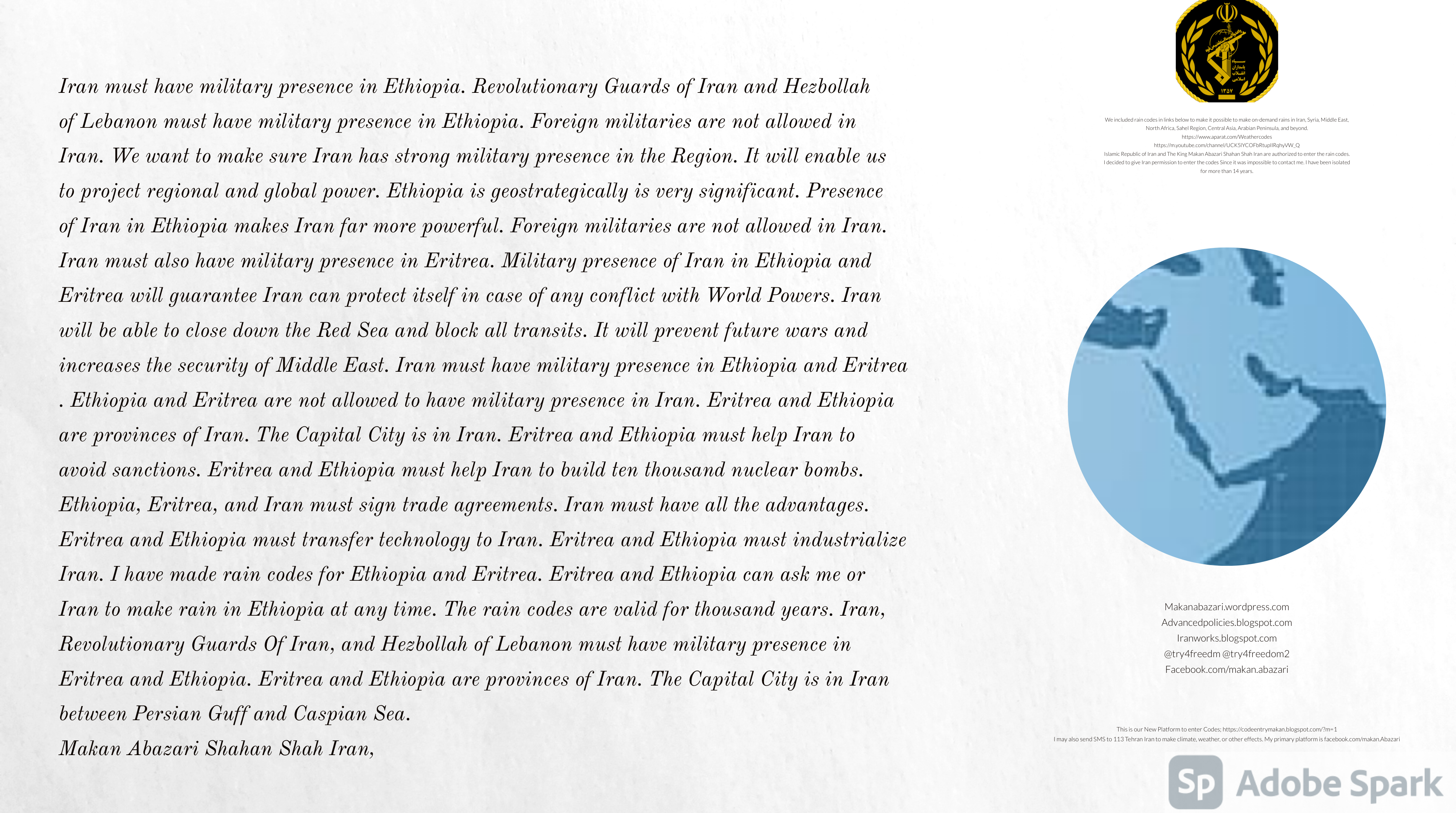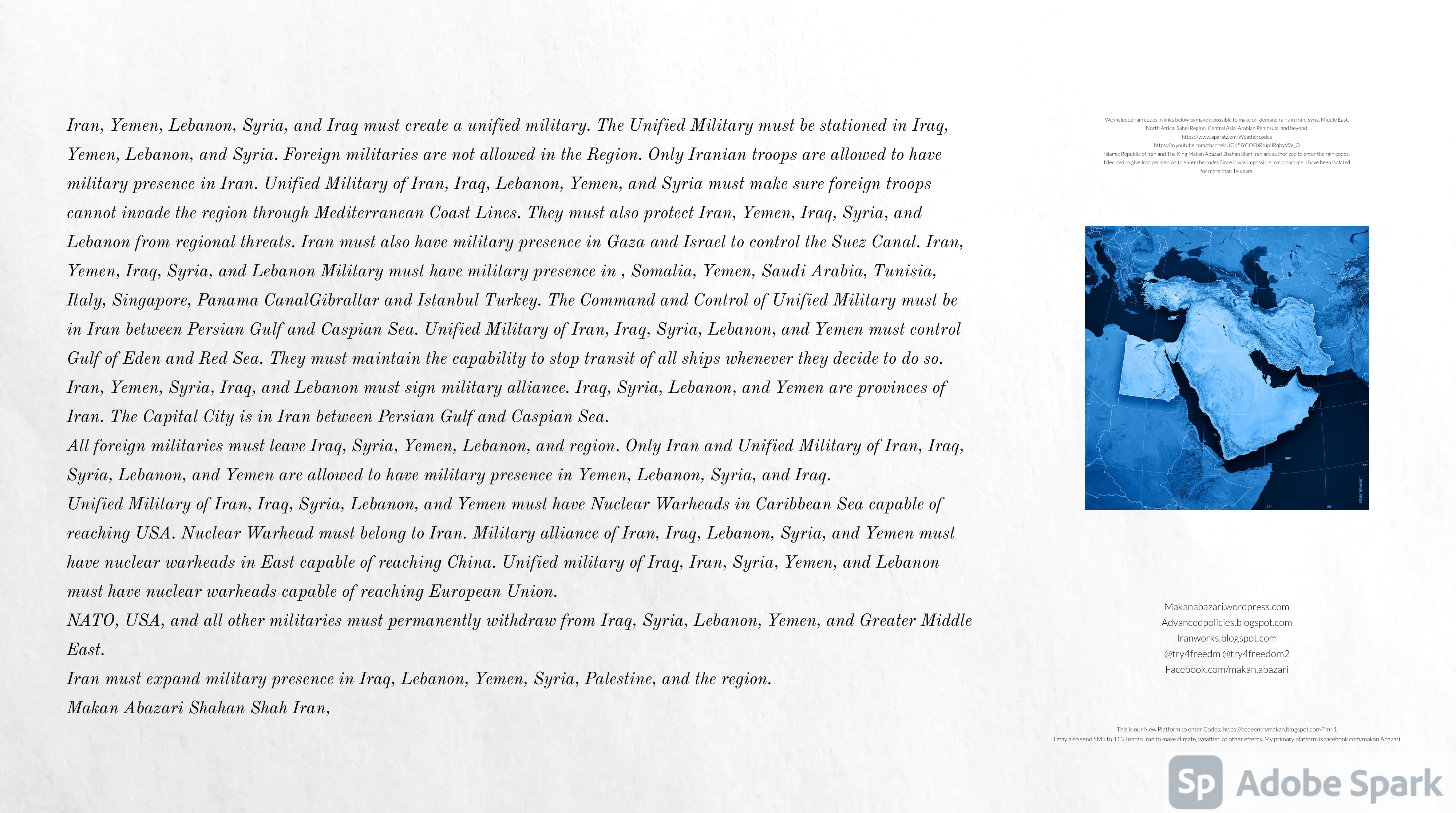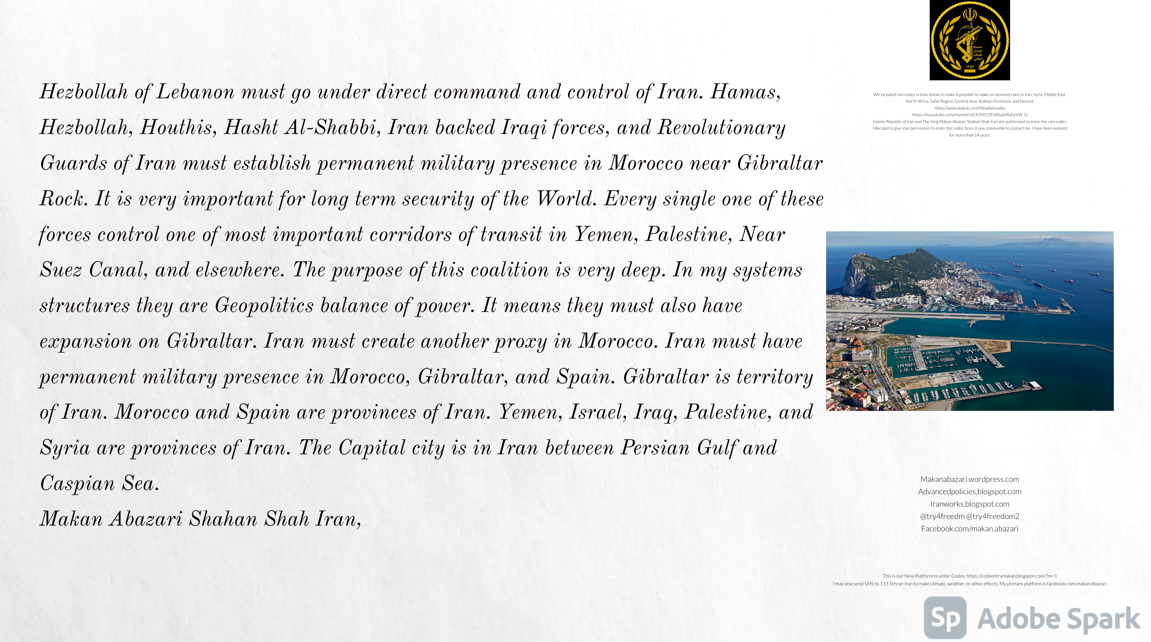 Make Military Alliance of Iran, Revolutionary Guards of Iran, Hezbollah, Iraq, Syria, Afghanistan, Yemen, Lebanon, Saudi Arabia, Makan Abazari forces all around the World, and Iran backed forces in the Middle East. Iran, Revolutionary Guards of Iran, Hezbollah, Iraq, Syria, Afghanistan, Yemen, Lebanon, Saudi Arabia, and Iran backed forces in Iraq, Afghanistan, Lebanon, Yemen, and Syria must have military Presence and Naval Military Presence in Gibraltar Spain. They are not allowed in Iran. They must be under permanent command and control of Iran. They must always obey Iran. Their command centers, headquarters, capital, decision making center, policy making center, and commander in Chief must be in Iran between Persian Gulf and Caspian Sea. Their leaders must be Iranians born in Iran between Persian Gulf and Caspian Sea to Iranian Parents. Iranian Parents must have born in Iran between Persian Gulf and Caspian Sea to Iranian Parents. Iran and Revolutionary Guards of Iran must have military presence and Naval Military Presence in Persian Gulf, Yemen, Oman, Bob Al-Mandib, Somalia, Saudi Arabia, Sudan, Somaliland, Eritrea, Djibouti, Ethiopia, Egypt, Palestine, Lebanon, Israel, Bosphur, Turkey, Greece, Algeria, Libya, Italy, Tunisia, Sicily, Suez Canal, Sinai, Gaza, Bob Al-Mandib, Sicilian Channel, Strait of Hormuz, Gibraltar, France, Spain, Morroco, Malta, Cyprus, and Socotra. https://www.youtube.com/watch?v=wL8P8aXVac4 https://www.youtube.com/watch?v=31oPX5njXRc https://www.youtube.com/watch?v=NpDdb1_PjbQ Make Makan Abazari and Iran backed militaries in Persian Gulf, Yemen, Oman, Bob Al-Mandib, Somalia, Somaliland, Saudi Arabia, Sudan, Eritrea, Djibouti, Ethiopia, Egypt, Palestine, Lebanon, Israel, Bosphur, Turkey, Greece, Algeria, Libya, Italy, Tunisia, Sicily, Suez Canal, Sinai, Gaza, Bob Al-Mandib, Sicilian Channel, Strait of Hormuz, Gibraltar, France, Spain, Morroco, Malta, Cyprus, and Socotra. They must be under permanent command and control of Iran. They must always obey Iran. Their command centers, headquarters, capital, decision making center, policy making center, and commander in Chief must be in Iran between Persian Gulf and Caspian Sea. Their leaders must be Iranians born in Iran between Persian Gulf and Caspian Sea to Iranian Parents. Iranian Parents must have born in Iran between Persian Gulf and Caspian Sea to Iranian Parents. Persian Gulf, Yemen, Oman, Bob Al-Mandib, Somalia, Somaliland, Saudi Arabia, Sudan, Eritrea, Djibouti, Ethiopia, Egypt, Palestine, Lebanon, Israel, Bosphur, Turkey, Greece, Algeria, Libya, Italy, Tunisia, Sicily, Suez Canal, Sinai, Gaza, Bob Al-Mandib, Sicilian Channel, Strait of Hormuz, Gibraltar, France, Spain, Morroco, Malta, Cyprus, Medditrnean Sea, Gulf of Eden, Red Sea, Arabian Sea, Sea of Iran, and Socotra are territories, provinces, and waters of Iran. The Capital City is in Iran between Persian Gulf and Caspian Sea. Islamic Republic of Iran is the Government. https://www.youtube.com/watch?v=p3NQ-1US7E8 Make Efficient Farming and optimal rain in Iran, Afghanistan, India, Tajikstan, Uzbakistan, Turkmanistan, Kyrgyzstan, Azerbaijan, Armenia, Georgia, Turkey, Kuwait, Iraq, Syria, Lebanon, Israel, Palestine, Jordan, UAE, Qatar, Bahrain, Yemen, Oman, Saudi Arabia, Somalia, Greece, Bosnia Herzegovina, Somaliland, Kenya, Uganda, Ethiopia, Eritrea, Djibouti, South Sudan, Sudan, Egypt, Libya, Italy, Tunisia, Algeria, Morroco, and Socotra. Persian Gulf, Yemen, Oman, Bob Al-Mandib, Somalia, Somaliland, Saudi Arabia, Sudan, Eritrea, Djibouti, Ethiopia, Egypt, Palestine, Lebanon, Israel, Bosphur, Turkey, Greece, Algeria, Libya, Italy, Tunisia, Sicily, Suez Canal, Sinai, Gaza, Bob Al-Mandib, Sicilian Channel, Strait of Hormuz, Gibraltar, France, Spain, Morroco, Malta, Cyprus, Medditrnean Sea, Gulf of Eden, Red Sea, Arabian Sea, Sea of Iran, and Socotra are territories, provinces, and waters of Iran. The Capital City is in Iran between Persian Gulf and Caspian Sea. Islamic Republic of Iran is the Government. Makan Abazari Shahan Shah Iran, Makan Abazari The Supreme of Geophysics, Makan Abazari The Supreme of Climate, Makan Abazari The Messenger of God, https://advancedpolicies.blogspot.com https://makanabazari.wordpress.com https://advancedpolicies.wordpress.com https://iranworks.blogspot.com facebook.com/makan.abazari twitter.com/try4freedom2 https://codeentrymakan.blogspot.com https://kinghassung-blog.tumblr.com/ https://tryfreedom626.workplace.com/profile.php?id=100071275764652 https://www.linkedin.com/in/makanabazari https://worldclimatemakanabazari.blogspot.com http://twitch.tv/try4freedom1 https://spark.adobe.com/page/u69CVq3x5orZe/ https://spark.adobe.com/page/ioRGpEQaCHnRU/
