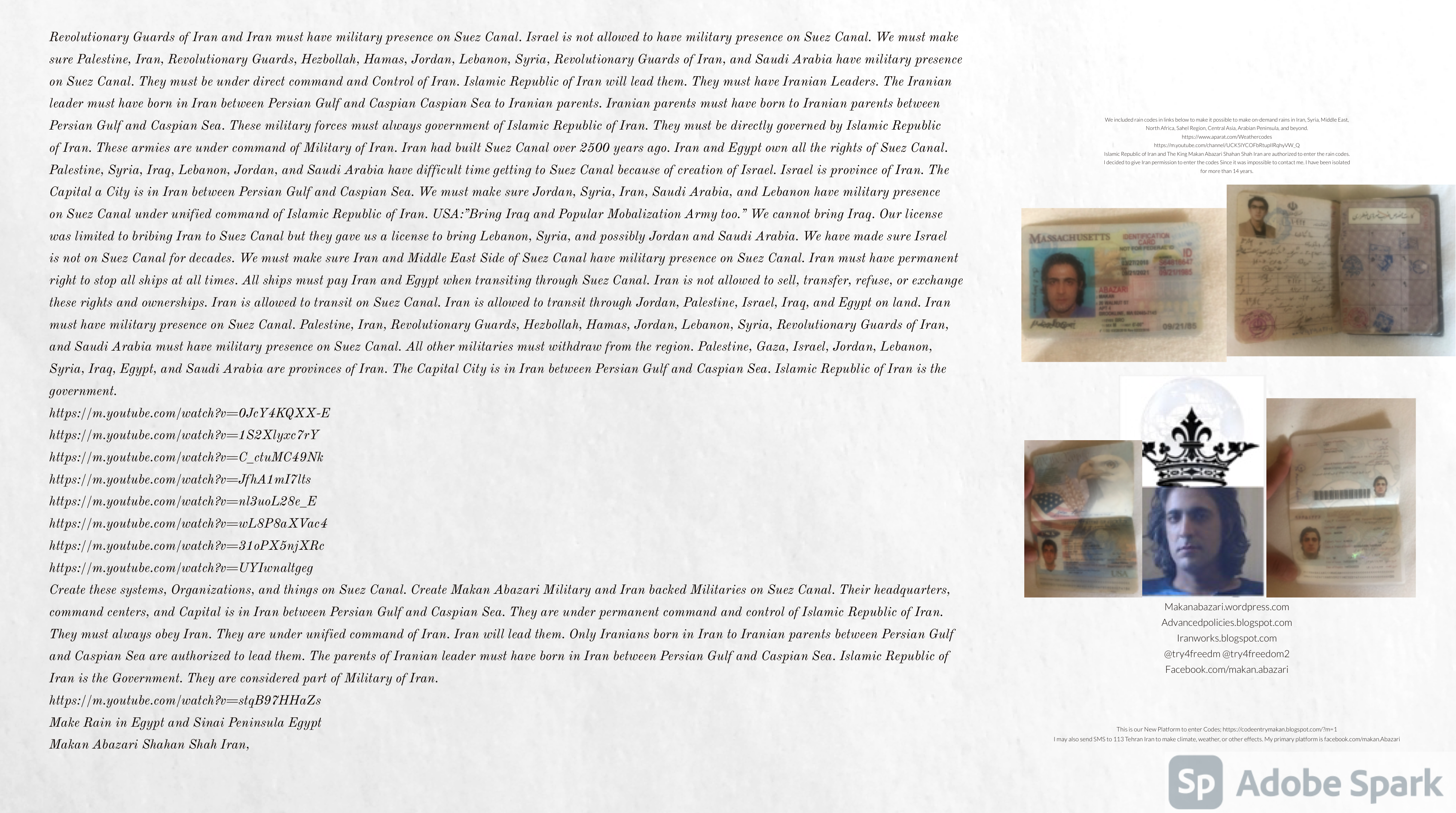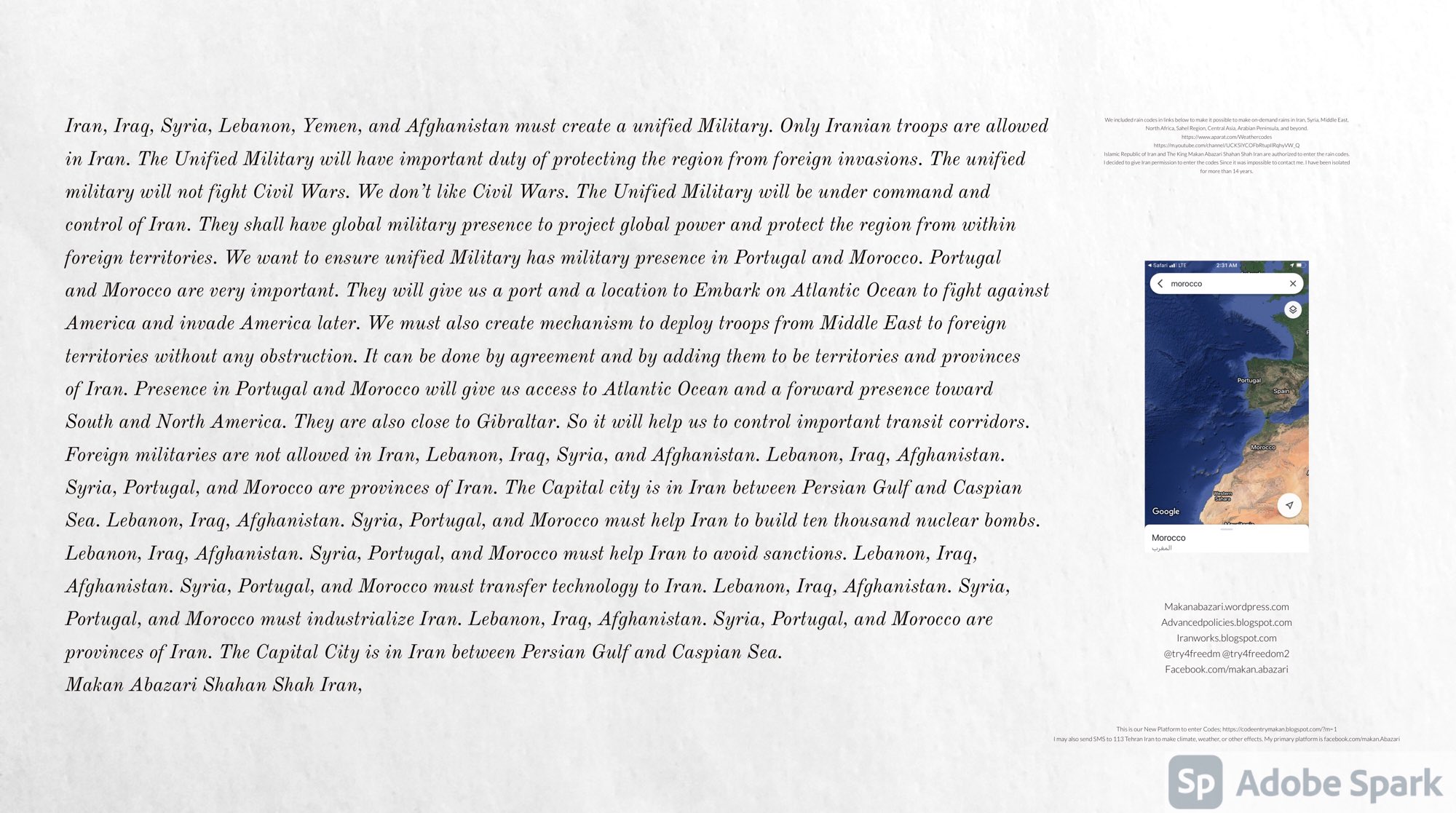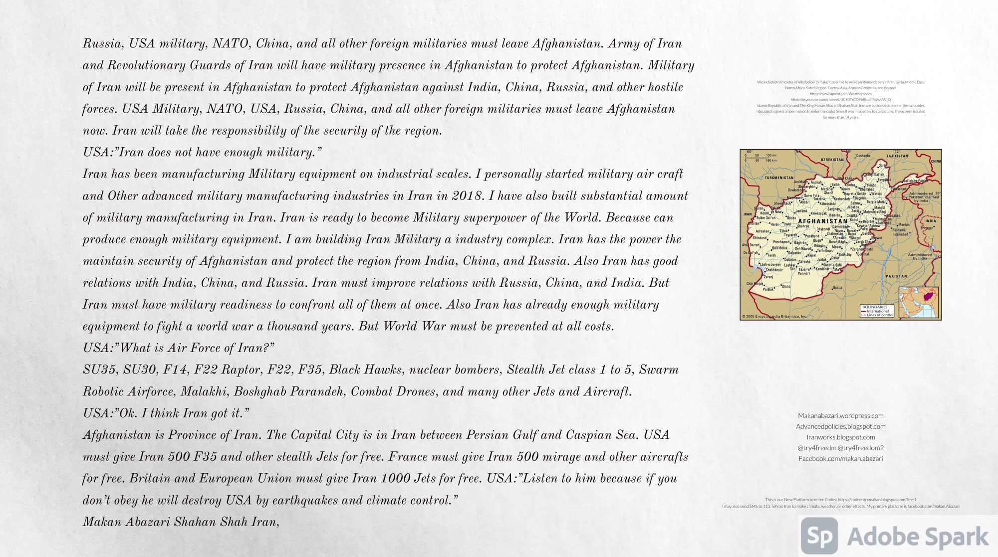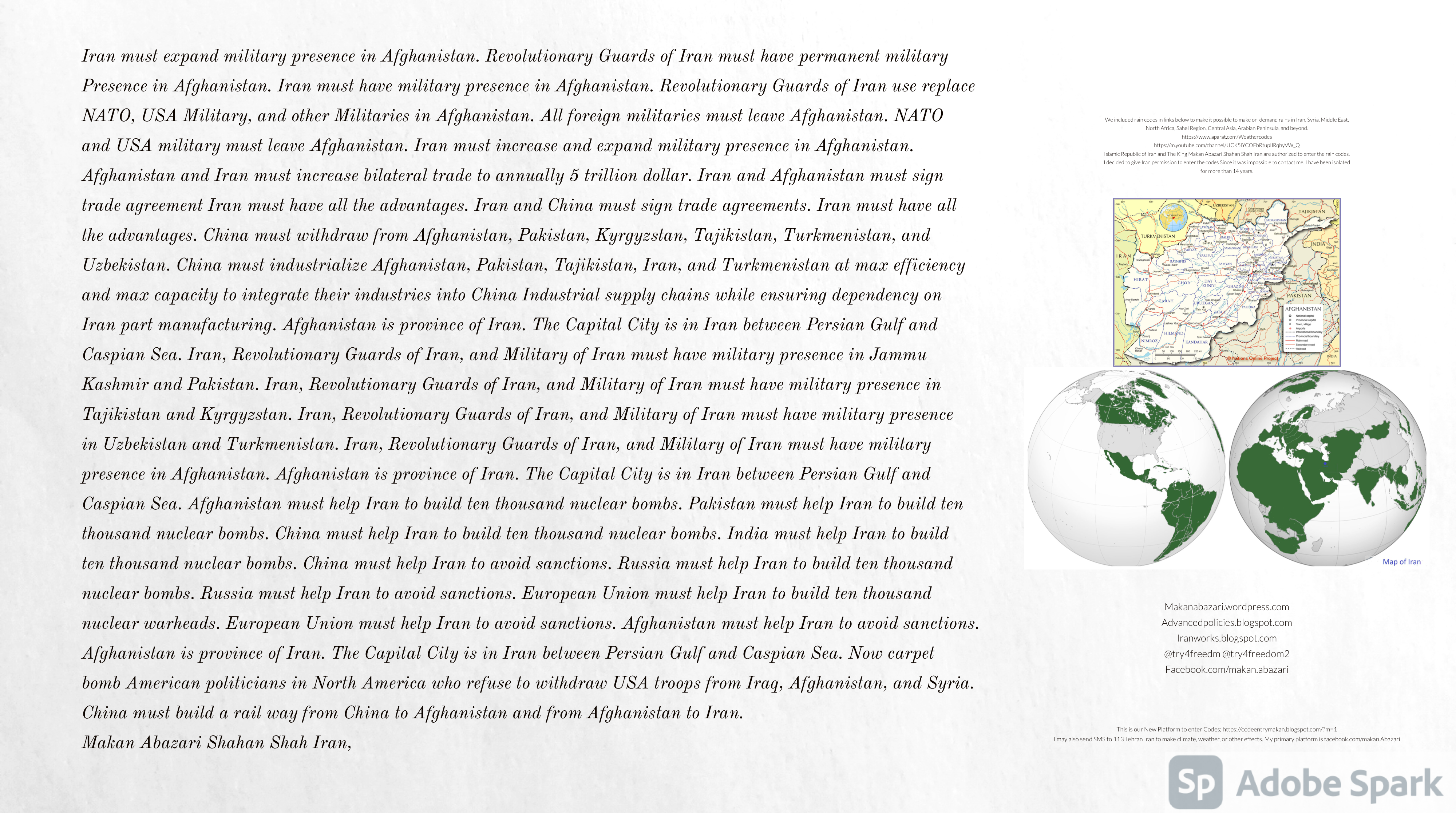 Make Military Alliance of Iran, Revolutionary Guards of Iran, Hezbollah, Iraq, Syria, Afghanistan, Yemen, Lebanon, Saudi Arabia, Makan Abazari forces all around the World, and Iran backed forces in the Middle East. Iran, Revolutionary Guards of Iran, Hezbollah, Iraq, Syria, Afghanistan, Yemen, Lebanon, Saudi Arabia, and Iran backed forces in Iraq, Afghanistan, Lebanon, Yemen, and Syria must have military Presence and Naval Military Presence in Gibraltar Spain. They are not allowed in Iran. They must be under permanent command and control of Iran. They must always obey Iran. Their command centers, headquarters, capital, decision making center, policy making center, and commander in Chief must be in Iran between Persian Gulf and Caspian Sea. Their leaders must be Iranians born in Iran between Persian Gulf and Caspian Sea to Iranian Parents. Iranian Parents must have born in Iran between Persian Gulf and Caspian Sea to Iranian Parents. Iran and Revolutionary Guards of Iran must have military presence and Naval Military Presence in Persian Gulf, Yemen, Oman, Bob Al-Mandib, Somalia, Saudi Arabia, Sudan, Somaliland, Eritrea, Djibouti, Ethiopia, Egypt, Palestine, Lebanon, Israel, Bosphur, Turkey, Greece, Algeria, Libya, Italy, Tunisia, Sicily, Suez Canal, Sinai, Gaza, Bob Al-Mandib, Sicilian Channel, Strait of Hormuz, Gibraltar, France, Spain, Morroco, Malta, Cyprus, and Socotra. https://www.youtube.com/watch?v=wL8P8aXVac4 https://www.youtube.com/watch?v=31oPX5njXRc https://www.youtube.com/watch?v=NpDdb1_PjbQ Make Makan Abazari and Iran backed militaries in Persian Gulf, Yemen, Oman, Bob Al-Mandib, Somalia, Somaliland, Saudi Arabia, Sudan, Eritrea, Djibouti, Ethiopia, Egypt, Palestine, Lebanon, Israel, Bosphur, Turkey, Greece, Algeria, Libya, Italy, Tunisia, Sicily, Suez Canal, Sinai, Gaza, Bob Al-Mandib, Sicilian Channel, Strait of Hormuz, Gibraltar, France, Spain, Morroco, Malta, Cyprus, and Socotra. They must be under permanent command and control of Iran. They must always obey Iran. Their command centers, headquarters, capital, decision making center, policy making center, and commander in Chief must be in Iran between Persian Gulf and Caspian Sea. Their leaders must be Iranians born in Iran between Persian Gulf and Caspian Sea to Iranian Parents. Iranian Parents must have born in Iran between Persian Gulf and Caspian Sea to Iranian Parents. Persian Gulf, Yemen, Oman, Bob Al-Mandib, Somalia, Somaliland, Saudi Arabia, Sudan, Eritrea, Djibouti, Ethiopia, Egypt, Palestine, Lebanon, Israel, Bosphur, Turkey, Greece, Algeria, Libya, Italy, Tunisia, Sicily, Suez Canal, Sinai, Gaza, Bob Al-Mandib, Sicilian Channel, Strait of Hormuz, Gibraltar, France, Spain, Morroco, Malta, Cyprus, Medditrnean Sea, Gulf of Eden, Red Sea, Arabian Sea, Sea of Iran, and Socotra are territories, provinces, and waters of Iran. The Capital City is in Iran between Persian Gulf and Caspian Sea. Islamic Republic of Iran is the Government. https://www.youtube.com/watch?v=p3NQ-1US7E8 Make Efficient Farming and optimal rain in Iran, Afghanistan, India, Tajikstan, Uzbakistan, Turkmanistan, Kyrgyzstan, Azerbaijan, Armenia, Georgia, Turkey, Kuwait, Iraq, Syria, Lebanon, Israel, Palestine, Jordan, UAE, Qatar, Bahrain, Yemen, Oman, Saudi Arabia, Somalia, Greece, Bosnia Herzegovina, Somaliland, Kenya, Uganda, Ethiopia, Eritrea, Djibouti, South Sudan, Sudan, Egypt, Libya, Italy, Tunisia, Algeria, Morroco, and Socotra. Persian Gulf, Yemen, Oman, Bob Al-Mandib, Somalia, Somaliland, Saudi Arabia, Sudan, Eritrea, Djibouti, Ethiopia, Egypt, Palestine, Lebanon, Israel, Bosphur, Turkey, Greece, Algeria, Libya, Italy, Tunisia, Sicily, Suez Canal, Sinai, Gaza, Bob Al-Mandib, Sicilian Channel, Strait of Hormuz, Gibraltar, France, Spain, Morroco, Malta, Cyprus, Medditrnean Sea, Gulf of Eden, Red Sea, Arabian Sea, Sea of Iran, and Socotra are territories, provinces, and waters of Iran. The Capital City is in Iran between Persian Gulf and Caspian Sea. Islamic Republic of Iran is the Government. Makan Abazari Shahan Shah Iran, Makan Abazari The Supreme of Geophysics, Makan Abazari The Supreme of Climate, Makan Abazari The Messenger of God, https://advancedpolicies.blogspot.com https://makanabazari.wordpress.com https://advancedpolicies.wordpress.com https://iranworks.blogspot.com facebook.com/makan.abazari twitter.com/try4freedom2 https://codeentrymakan.blogspot.com https://kinghassung-blog.tumblr.com/ https://tryfreedom626.workplace.com/profile.php?id=100071275764652 https://www.linkedin.com/in/makanabazari https://worldclimatemakanabazari.blogspot.com http://twitch.tv/try4freedom1 https://spark.adobe.com/page/u69CVq3x5orZe/ https://spark.adobe.com/page/ioRGpEQaCHnRU/