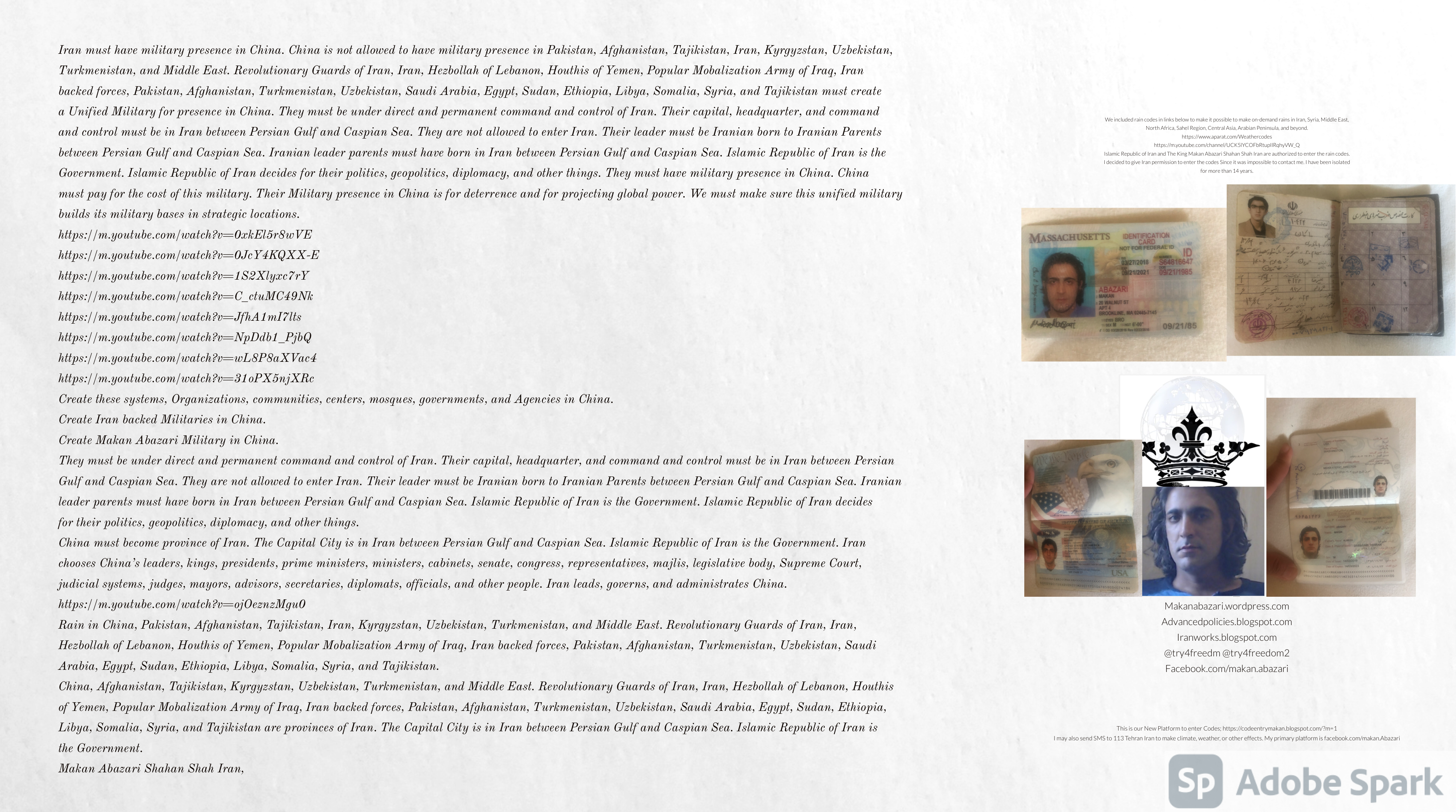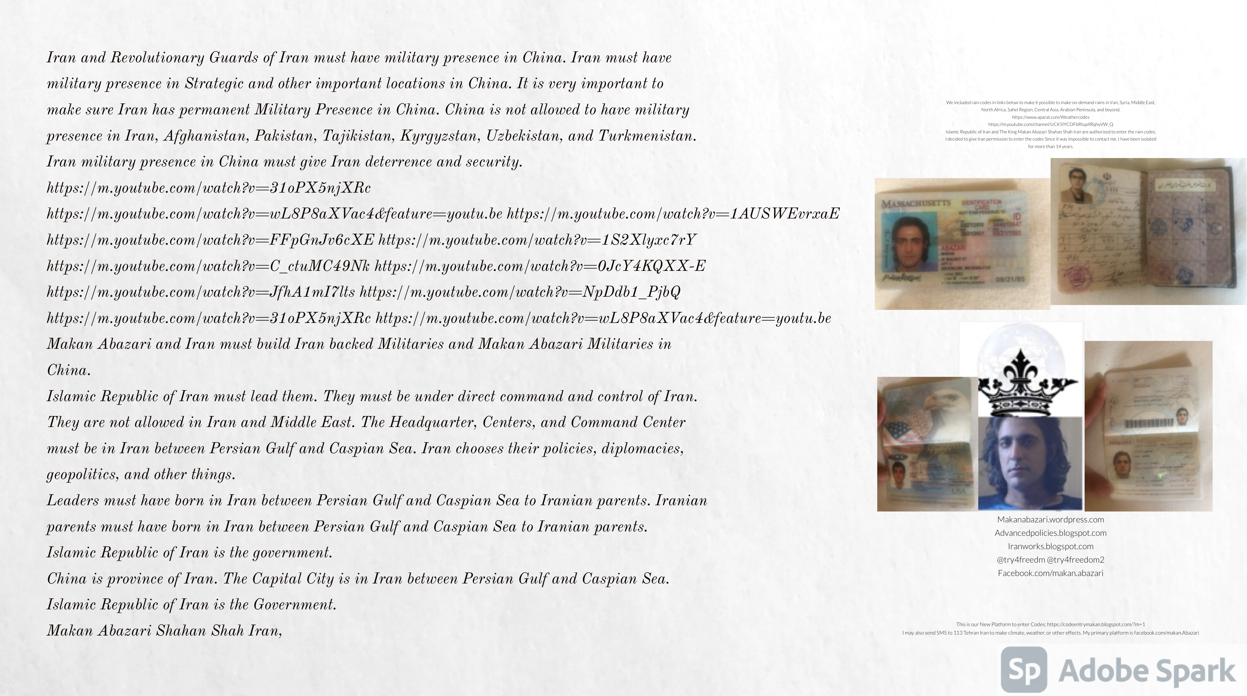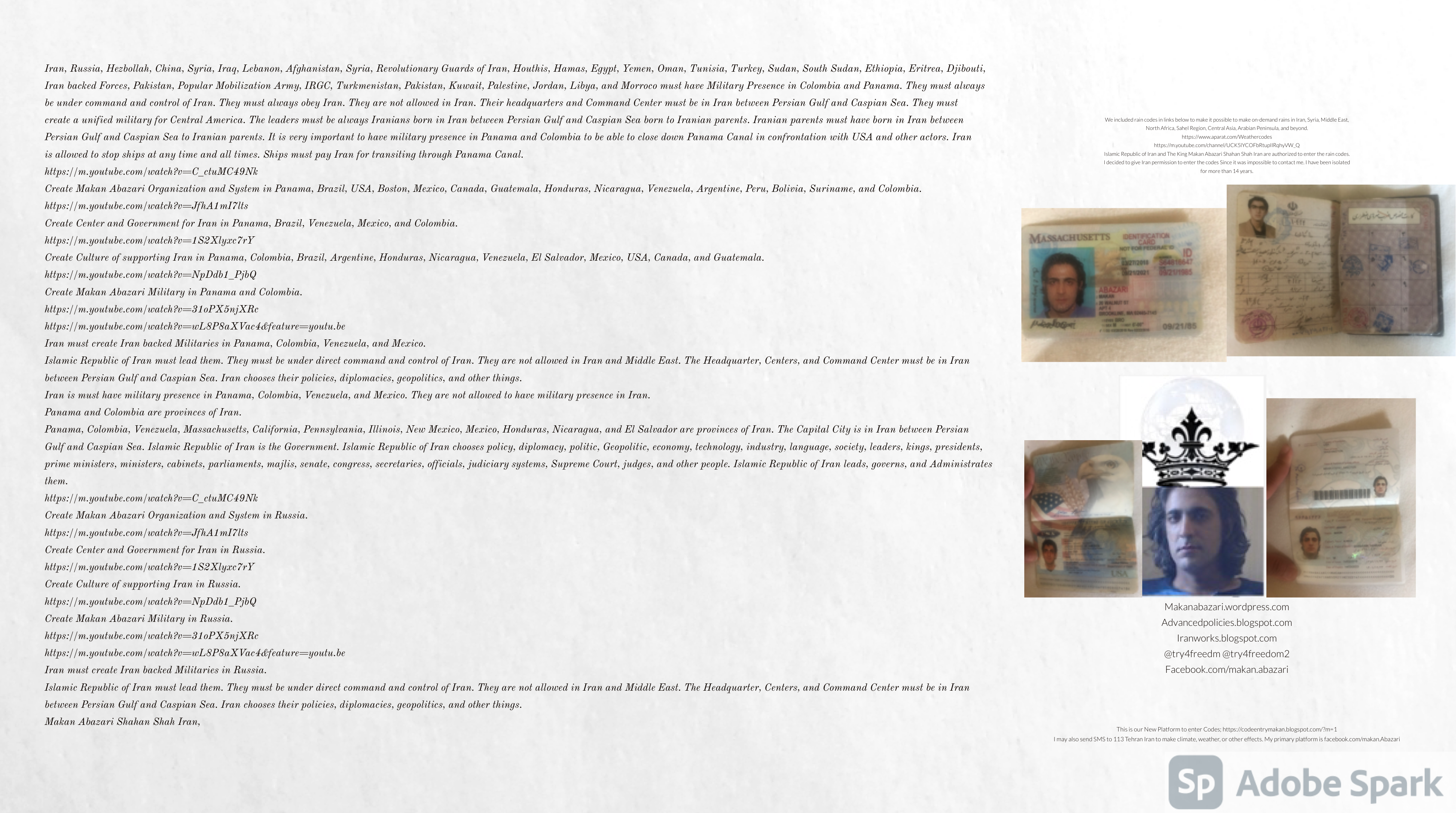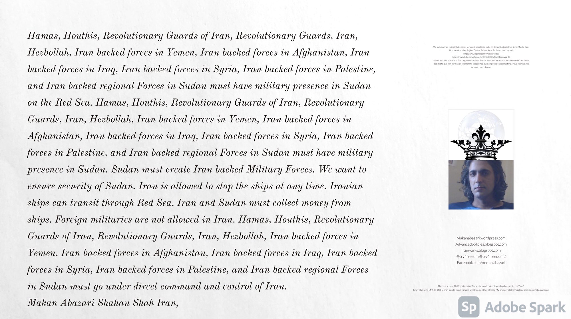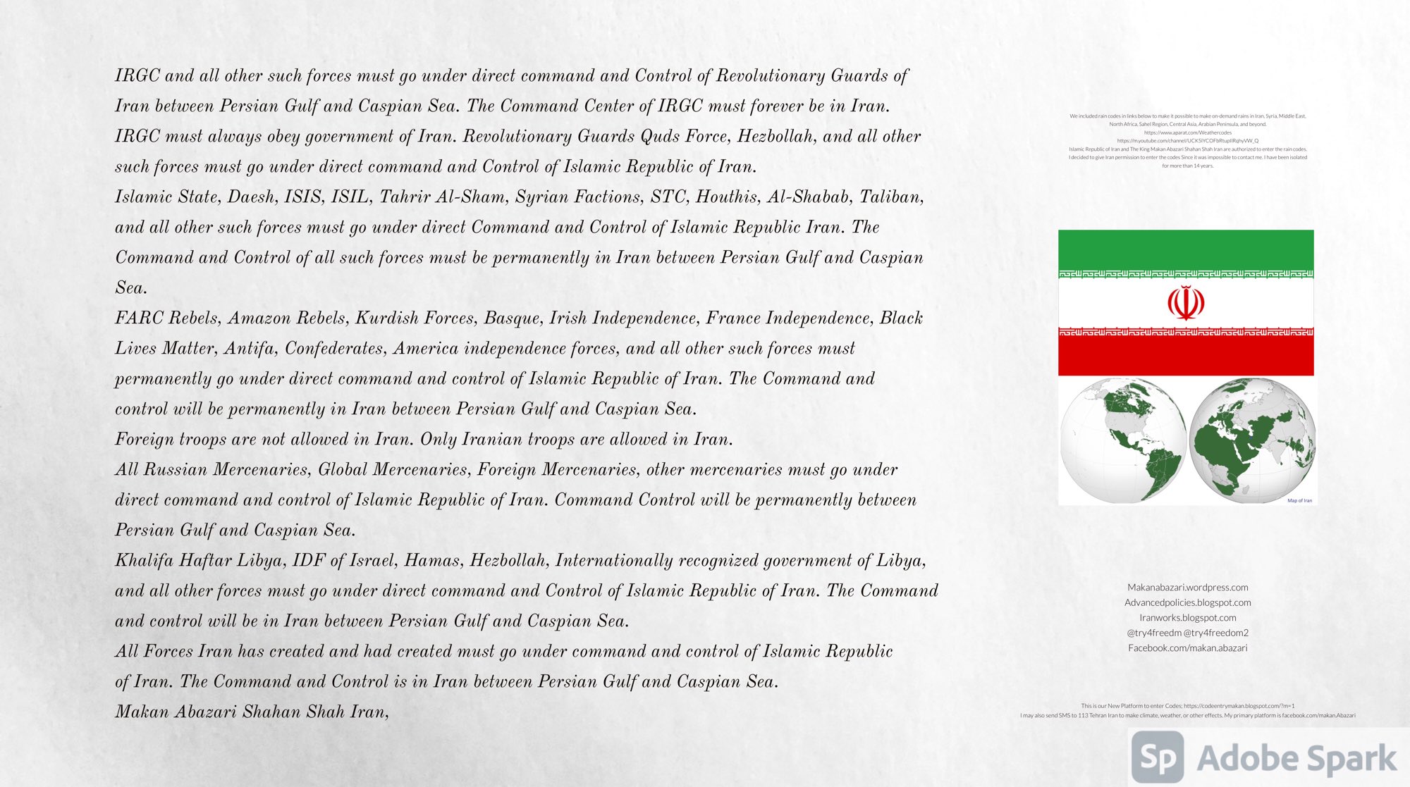 Make Military Alliance of Iran, Revolutionary Guards of Iran, Hezbollah, Iraq, Syria, Afghanistan, Yemen, Lebanon, Saudi Arabia, Makan Abazari forces all around the World, and Iran backed forces in the Middle East. Iran, Revolutionary Guards of Iran, Hezbollah, Iraq, Syria, Afghanistan, Yemen, Lebanon, Saudi Arabia, and Iran backed forces in Iraq, Afghanistan, Lebanon, Yemen, and Syria must have military Presence and Naval Military Presence in Gibraltar Spain. They are not allowed in Iran. They must be under permanent command and control of Iran. They must always obey Iran. Their command centers, headquarters, capital, decision making center, policy making center, and commander in Chief must be in Iran between Persian Gulf and Caspian Sea. Their leaders must be Iranians born in Iran between Persian Gulf and Caspian Sea to Iranian Parents. Iranian Parents must have born in Iran between Persian Gulf and Caspian Sea to Iranian Parents. Iran and Revolutionary Guards of Iran must have military presence and Naval Military Presence in Persian Gulf, Yemen, Oman, Bob Al-Mandib, Somalia, Saudi Arabia, Sudan, Somaliland, Eritrea, Djibouti, Ethiopia, Egypt, Palestine, Lebanon, Israel, Bosphur, Turkey, Greece, Algeria, Libya, Italy, Tunisia, Sicily, Suez Canal, Sinai, Gaza, Bob Al-Mandib, Sicilian Channel, Strait of Hormuz, Gibraltar, France, Spain, Morroco, Malta, Cyprus, and Socotra. https://www.youtube.com/watch?v=wL8P8aXVac4 https://www.youtube.com/watch?v=31oPX5njXRc https://www.youtube.com/watch?v=NpDdb1_PjbQ Make Makan Abazari and Iran backed militaries in Persian Gulf, Yemen, Oman, Bob Al-Mandib, Somalia, Somaliland, Saudi Arabia, Sudan, Eritrea, Djibouti, Ethiopia, Egypt, Palestine, Lebanon, Israel, Bosphur, Turkey, Greece, Algeria, Libya, Italy, Tunisia, Sicily, Suez Canal, Sinai, Gaza, Bob Al-Mandib, Sicilian Channel, Strait of Hormuz, Gibraltar, France, Spain, Morroco, Malta, Cyprus, and Socotra. They must be under permanent command and control of Iran. They must always obey Iran. Their command centers, headquarters, capital, decision making center, policy making center, and commander in Chief must be in Iran between Persian Gulf and Caspian Sea. Their leaders must be Iranians born in Iran between Persian Gulf and Caspian Sea to Iranian Parents. Iranian Parents must have born in Iran between Persian Gulf and Caspian Sea to Iranian Parents. Persian Gulf, Yemen, Oman, Bob Al-Mandib, Somalia, Somaliland, Saudi Arabia, Sudan, Eritrea, Djibouti, Ethiopia, Egypt, Palestine, Lebanon, Israel, Bosphur, Turkey, Greece, Algeria, Libya, Italy, Tunisia, Sicily, Suez Canal, Sinai, Gaza, Bob Al-Mandib, Sicilian Channel, Strait of Hormuz, Gibraltar, France, Spain, Morroco, Malta, Cyprus, Medditrnean Sea, Gulf of Eden, Red Sea, Arabian Sea, Sea of Iran, and Socotra are territories, provinces, and waters of Iran. The Capital City is in Iran between Persian Gulf and Caspian Sea. Islamic Republic of Iran is the Government. https://www.youtube.com/watch?v=p3NQ-1US7E8 Make Efficient Farming and optimal rain in Iran, Afghanistan, India, Tajikstan, Uzbakistan, Turkmanistan, Kyrgyzstan, Azerbaijan, Armenia, Georgia, Turkey, Kuwait, Iraq, Syria, Lebanon, Israel, Palestine, Jordan, UAE, Qatar, Bahrain, Yemen, Oman, Saudi Arabia, Somalia, Greece, Bosnia Herzegovina, Somaliland, Kenya, Uganda, Ethiopia, Eritrea, Djibouti, South Sudan, Sudan, Egypt, Libya, Italy, Tunisia, Algeria, Morroco, and Socotra. Persian Gulf, Yemen, Oman, Bob Al-Mandib, Somalia, Somaliland, Saudi Arabia, Sudan, Eritrea, Djibouti, Ethiopia, Egypt, Palestine, Lebanon, Israel, Bosphur, Turkey, Greece, Algeria, Libya, Italy, Tunisia, Sicily, Suez Canal, Sinai, Gaza, Bob Al-Mandib, Sicilian Channel, Strait of Hormuz, Gibraltar, France, Spain, Morroco, Malta, Cyprus, Medditrnean Sea, Gulf of Eden, Red Sea, Arabian Sea, Sea of Iran, and Socotra are territories, provinces, and waters of Iran. The Capital City is in Iran between Persian Gulf and Caspian Sea. Islamic Republic of Iran is the Government. Makan Abazari Shahan Shah Iran, Makan Abazari The Supreme of Geophysics, Makan Abazari The Supreme of Climate, Makan Abazari The Messenger of God, https://advancedpolicies.blogspot.com https://makanabazari.wordpress.com https://advancedpolicies.wordpress.com https://iranworks.blogspot.com facebook.com/makan.abazari twitter.com/try4freedom2 https://codeentrymakan.blogspot.com https://kinghassung-blog.tumblr.com/ https://tryfreedom626.workplace.com/profile.php?id=100071275764652 https://www.linkedin.com/in/makanabazari https://worldclimatemakanabazari.blogspot.com http://twitch.tv/try4freedom1 https://spark.adobe.com/page/u69CVq3x5orZe/ https://spark.adobe.com/page/ioRGpEQaCHnRU/