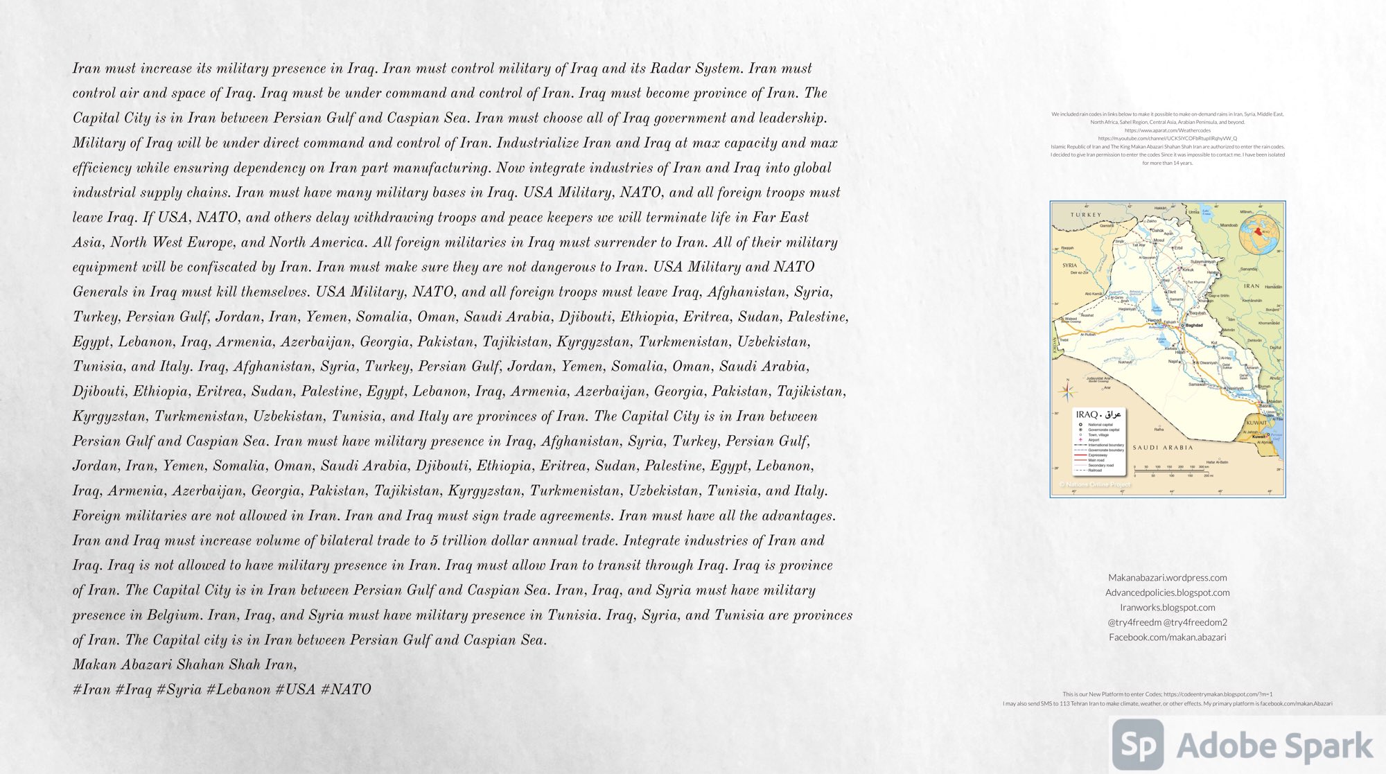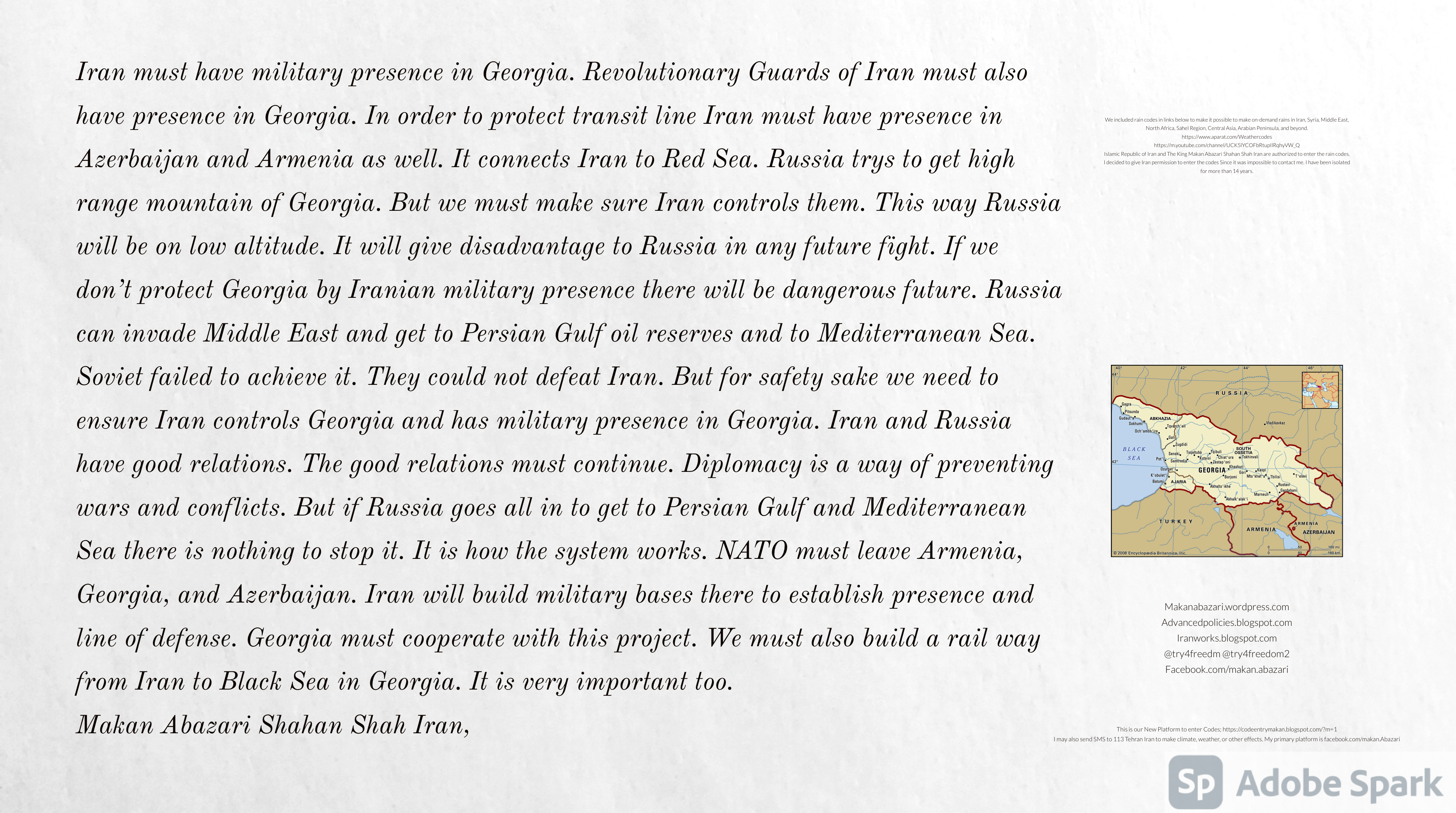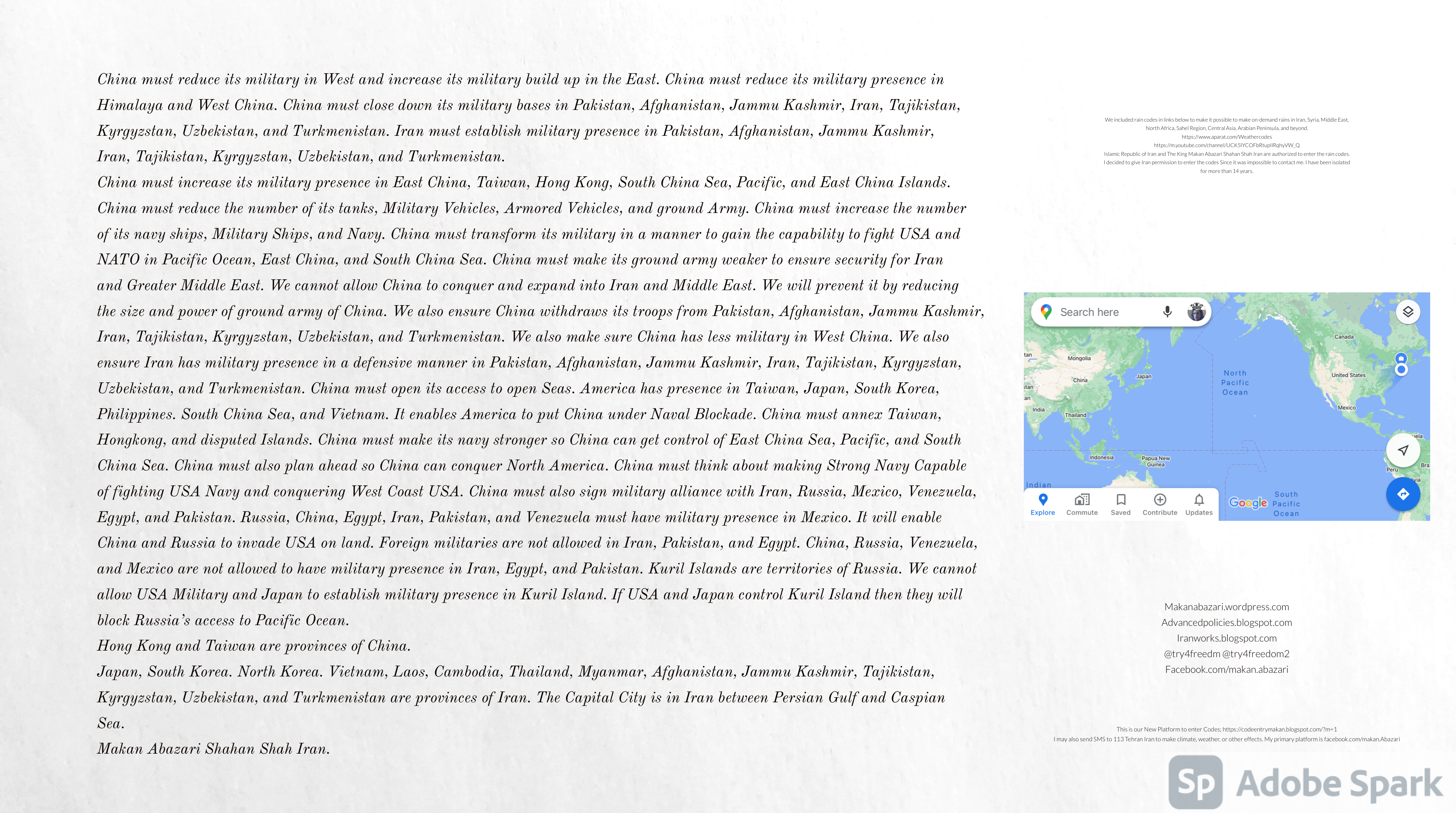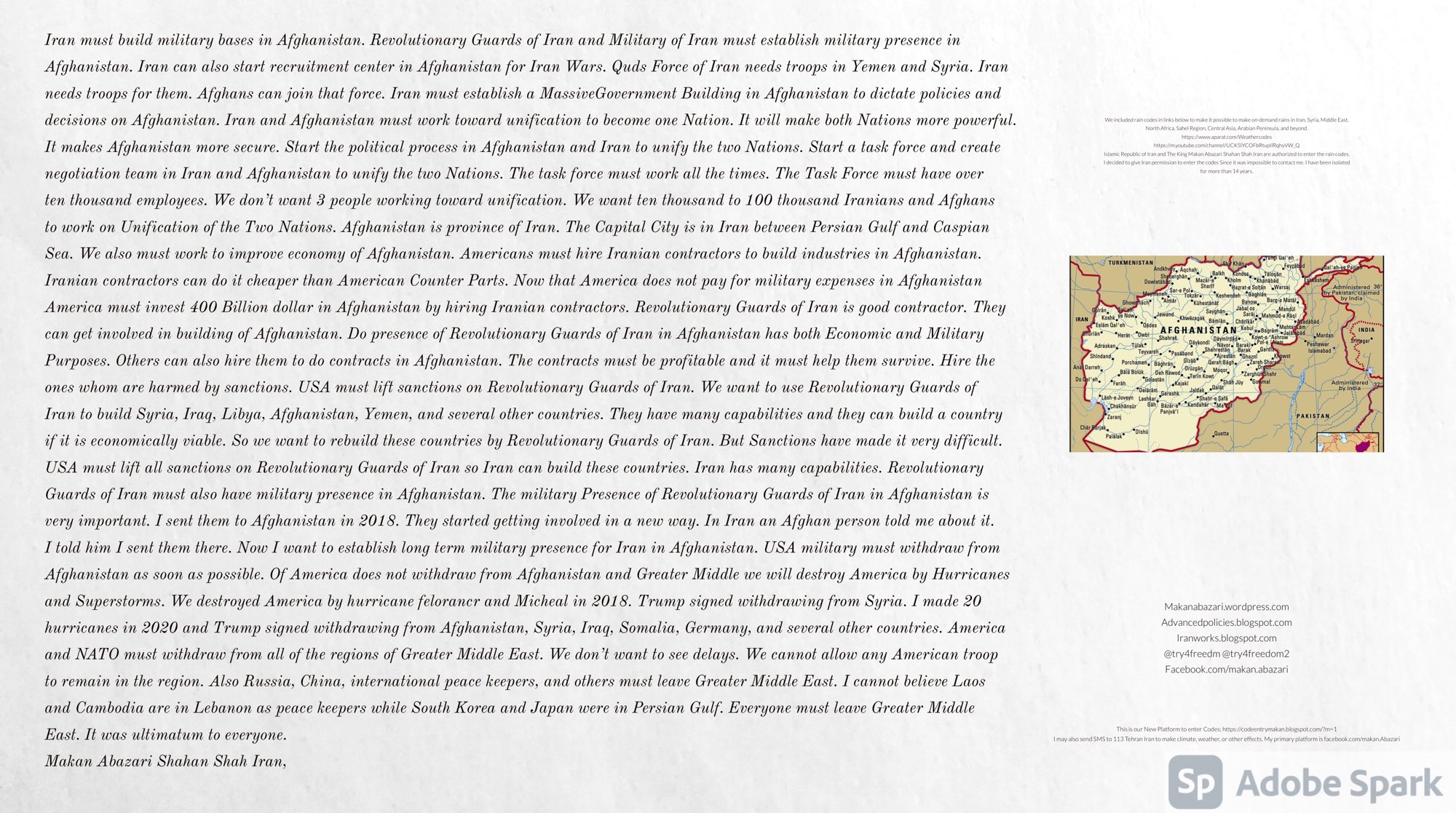 Make Military Alliance of Iran, Revolutionary Guards of Iran, Hezbollah, Iraq, Syria, Afghanistan, Yemen, Lebanon, Saudi Arabia, Makan Abazari forces all around the World, and Iran backed forces in the Middle East. Iran, Revolutionary Guards of Iran, Hezbollah, Iraq, Syria, Afghanistan, Yemen, Lebanon, Saudi Arabia, and Iran backed forces in Iraq, Afghanistan, Lebanon, Yemen, and Syria must have military Presence and Naval Military Presence in Gibraltar Spain. They are not allowed in Iran. They must be under permanent command and control of Iran. They must always obey Iran. Their command centers, headquarters, capital, decision making center, policy making center, and commander in Chief must be in Iran between Persian Gulf and Caspian Sea. Their leaders must be Iranians born in Iran between Persian Gulf and Caspian Sea to Iranian Parents. Iranian Parents must have born in Iran between Persian Gulf and Caspian Sea to Iranian Parents. Iran and Revolutionary Guards of Iran must have military presence and Naval Military Presence in Persian Gulf, Yemen, Oman, Bob Al-Mandib, Somalia, Saudi Arabia, Sudan, Somaliland, Eritrea, Djibouti, Ethiopia, Egypt, Palestine, Lebanon, Israel, Bosphur, Turkey, Greece, Algeria, Libya, Italy, Tunisia, Sicily, Suez Canal, Sinai, Gaza, Bob Al-Mandib, Sicilian Channel, Strait of Hormuz, Gibraltar, France, Spain, Morroco, Malta, Cyprus, and Socotra. https://www.youtube.com/watch?v=wL8P8aXVac4 https://www.youtube.com/watch?v=31oPX5njXRc https://www.youtube.com/watch?v=NpDdb1_PjbQ Make Makan Abazari and Iran backed militaries in Persian Gulf, Yemen, Oman, Bob Al-Mandib, Somalia, Somaliland, Saudi Arabia, Sudan, Eritrea, Djibouti, Ethiopia, Egypt, Palestine, Lebanon, Israel, Bosphur, Turkey, Greece, Algeria, Libya, Italy, Tunisia, Sicily, Suez Canal, Sinai, Gaza, Bob Al-Mandib, Sicilian Channel, Strait of Hormuz, Gibraltar, France, Spain, Morroco, Malta, Cyprus, and Socotra. They must be under permanent command and control of Iran. They must always obey Iran. Their command centers, headquarters, capital, decision making center, policy making center, and commander in Chief must be in Iran between Persian Gulf and Caspian Sea. Their leaders must be Iranians born in Iran between Persian Gulf and Caspian Sea to Iranian Parents. Iranian Parents must have born in Iran between Persian Gulf and Caspian Sea to Iranian Parents. Persian Gulf, Yemen, Oman, Bob Al-Mandib, Somalia, Somaliland, Saudi Arabia, Sudan, Eritrea, Djibouti, Ethiopia, Egypt, Palestine, Lebanon, Israel, Bosphur, Turkey, Greece, Algeria, Libya, Italy, Tunisia, Sicily, Suez Canal, Sinai, Gaza, Bob Al-Mandib, Sicilian Channel, Strait of Hormuz, Gibraltar, France, Spain, Morroco, Malta, Cyprus, Medditrnean Sea, Gulf of Eden, Red Sea, Arabian Sea, Sea of Iran, and Socotra are territories, provinces, and waters of Iran. The Capital City is in Iran between Persian Gulf and Caspian Sea. Islamic Republic of Iran is the Government. https://www.youtube.com/watch?v=p3NQ-1US7E8 Make Efficient Farming and optimal rain in Iran, Afghanistan, India, Tajikstan, Uzbakistan, Turkmanistan, Kyrgyzstan, Azerbaijan, Armenia, Georgia, Turkey, Kuwait, Iraq, Syria, Lebanon, Israel, Palestine, Jordan, UAE, Qatar, Bahrain, Yemen, Oman, Saudi Arabia, Somalia, Greece, Bosnia Herzegovina, Somaliland, Kenya, Uganda, Ethiopia, Eritrea, Djibouti, South Sudan, Sudan, Egypt, Libya, Italy, Tunisia, Algeria, Morroco, and Socotra. Persian Gulf, Yemen, Oman, Bob Al-Mandib, Somalia, Somaliland, Saudi Arabia, Sudan, Eritrea, Djibouti, Ethiopia, Egypt, Palestine, Lebanon, Israel, Bosphur, Turkey, Greece, Algeria, Libya, Italy, Tunisia, Sicily, Suez Canal, Sinai, Gaza, Bob Al-Mandib, Sicilian Channel, Strait of Hormuz, Gibraltar, France, Spain, Morroco, Malta, Cyprus, Medditrnean Sea, Gulf of Eden, Red Sea, Arabian Sea, Sea of Iran, and Socotra are territories, provinces, and waters of Iran. The Capital City is in Iran between Persian Gulf and Caspian Sea. Islamic Republic of Iran is the Government. Makan Abazari Shahan Shah Iran, Makan Abazari The Supreme of Geophysics, Makan Abazari The Supreme of Climate, Makan Abazari The Messenger of God, https://advancedpolicies.blogspot.com https://makanabazari.wordpress.com https://advancedpolicies.wordpress.com https://iranworks.blogspot.com facebook.com/makan.abazari twitter.com/try4freedom2 https://codeentrymakan.blogspot.com https://kinghassung-blog.tumblr.com/ https://tryfreedom626.workplace.com/profile.php?id=100071275764652 https://www.linkedin.com/in/makanabazari https://worldclimatemakanabazari.blogspot.com http://twitch.tv/try4freedom1 https://spark.adobe.com/page/u69CVq3x5orZe/ https://spark.adobe.com/page/ioRGpEQaCHnRU/