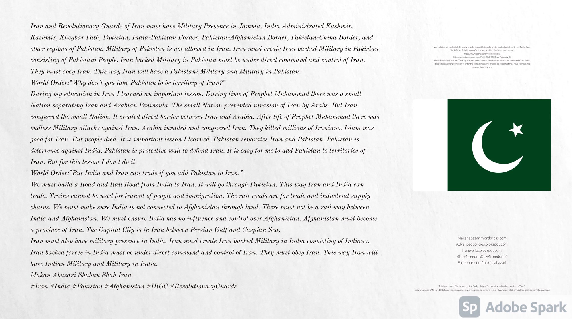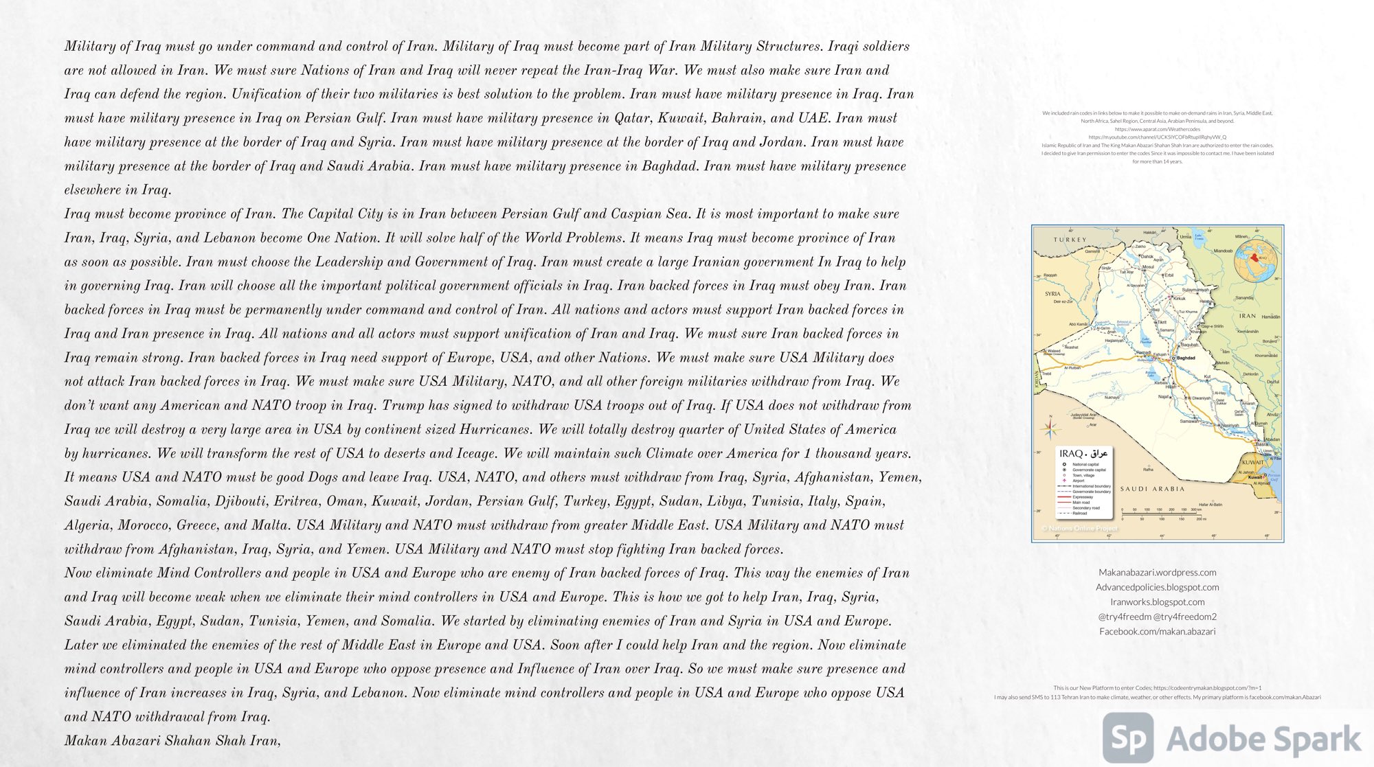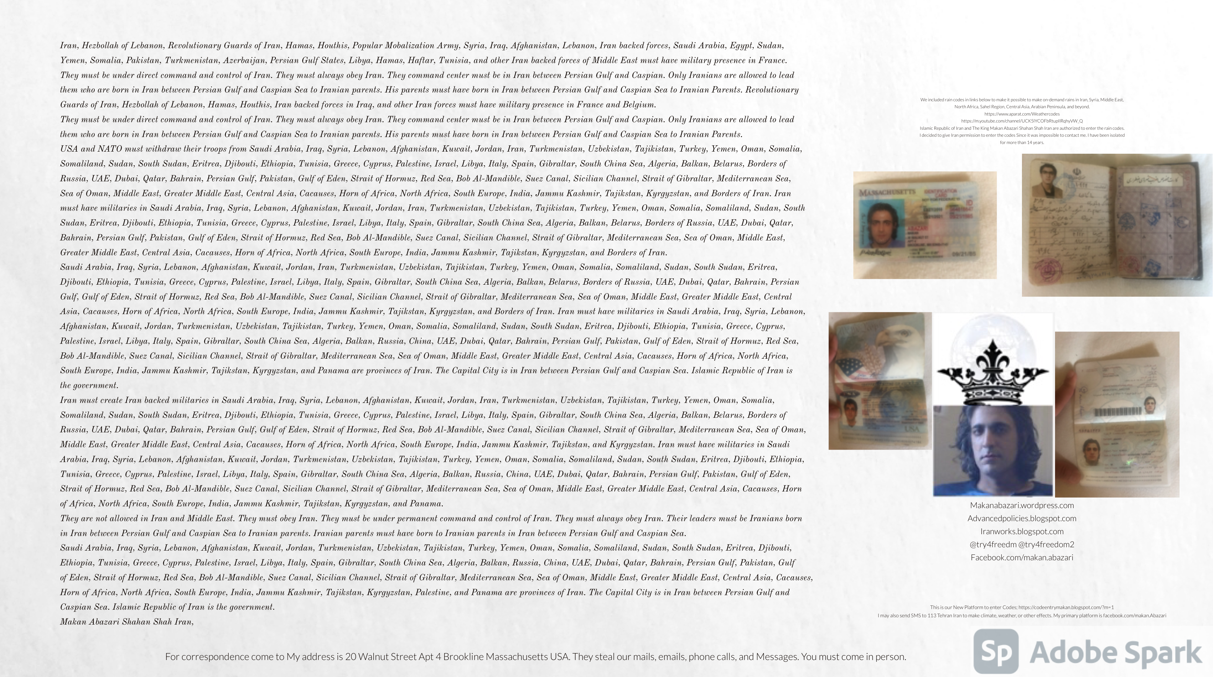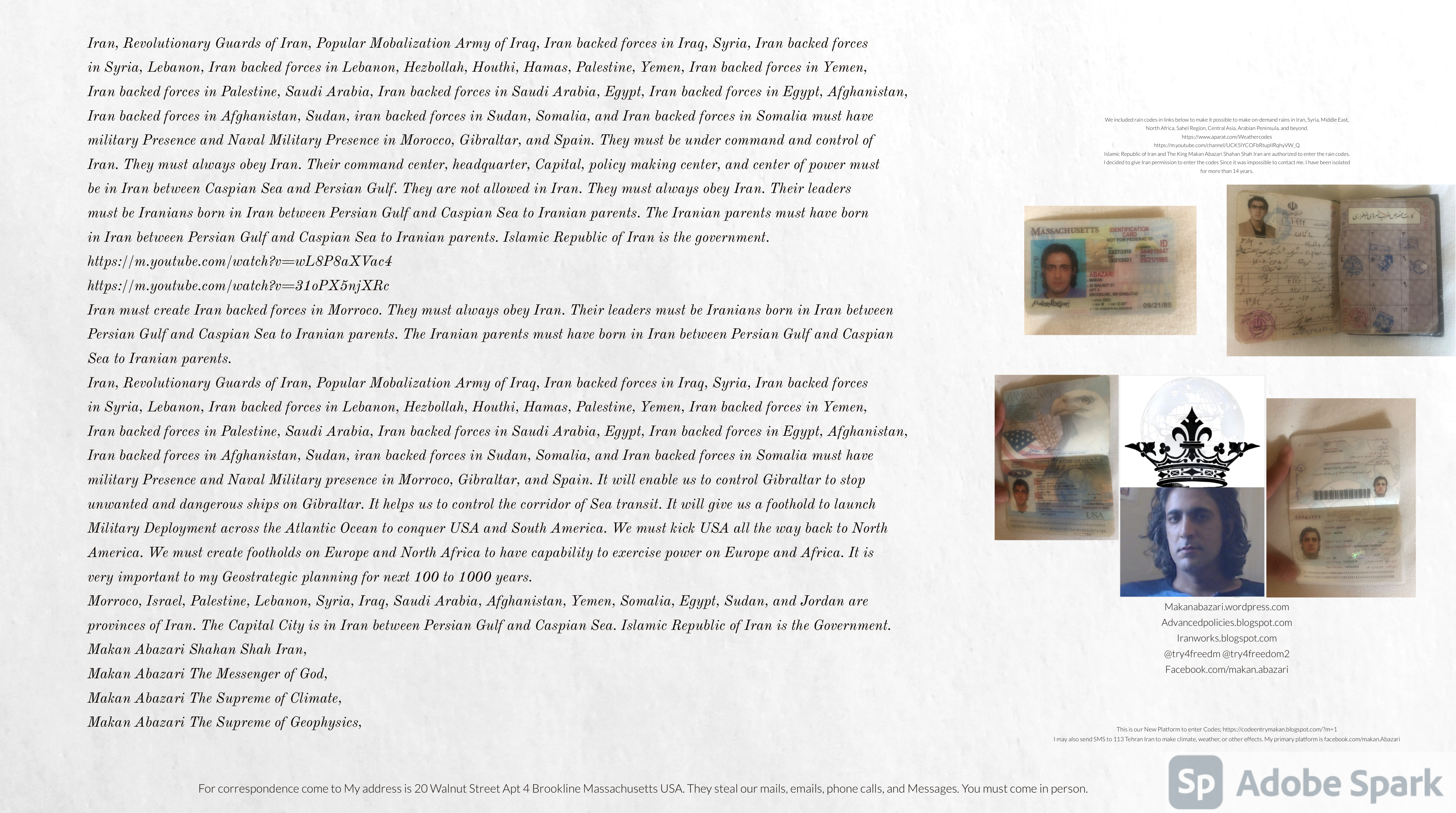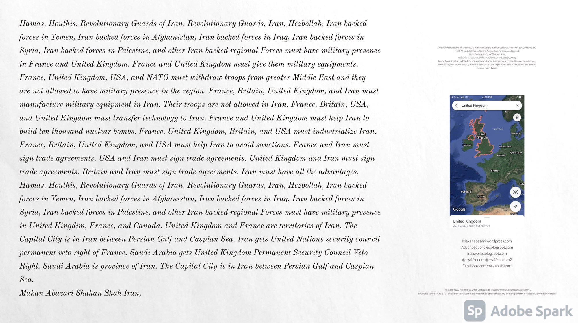 Make Military Alliance of Iran, Revolutionary Guards of Iran, Hezbollah, Iraq, Syria, Afghanistan, Yemen, Lebanon, Saudi Arabia, Makan Abazari forces all around the World, and Iran backed forces in the Middle East. Iran, Revolutionary Guards of Iran, Hezbollah, Iraq, Syria, Afghanistan, Yemen, Lebanon, Saudi Arabia, and Iran backed forces in Iraq, Afghanistan, Lebanon, Yemen, and Syria must have military Presence and Naval Military Presence in Gibraltar Spain. They are not allowed in Iran. They must be under permanent command and control of Iran. They must always obey Iran. Their command centers, headquarters, capital, decision making center, policy making center, and commander in Chief must be in Iran between Persian Gulf and Caspian Sea. Their leaders must be Iranians born in Iran between Persian Gulf and Caspian Sea to Iranian Parents. Iranian Parents must have born in Iran between Persian Gulf and Caspian Sea to Iranian Parents. Iran and Revolutionary Guards of Iran must have military presence and Naval Military Presence in Persian Gulf, Yemen, Oman, Bob Al-Mandib, Somalia, Saudi Arabia, Sudan, Somaliland, Eritrea, Djibouti, Ethiopia, Egypt, Palestine, Lebanon, Israel, Bosphur, Turkey, Greece, Algeria, Libya, Italy, Tunisia, Sicily, Suez Canal, Sinai, Gaza, Bob Al-Mandib, Sicilian Channel, Strait of Hormuz, Gibraltar, France, Spain, Morroco, Malta, Cyprus, and Socotra. https://www.youtube.com/watch?v=wL8P8aXVac4 https://www.youtube.com/watch?v=31oPX5njXRc https://www.youtube.com/watch?v=NpDdb1_PjbQ Make Makan Abazari and Iran backed militaries in Persian Gulf, Yemen, Oman, Bob Al-Mandib, Somalia, Somaliland, Saudi Arabia, Sudan, Eritrea, Djibouti, Ethiopia, Egypt, Palestine, Lebanon, Israel, Bosphur, Turkey, Greece, Algeria, Libya, Italy, Tunisia, Sicily, Suez Canal, Sinai, Gaza, Bob Al-Mandib, Sicilian Channel, Strait of Hormuz, Gibraltar, France, Spain, Morroco, Malta, Cyprus, and Socotra. They must be under permanent command and control of Iran. They must always obey Iran. Their command centers, headquarters, capital, decision making center, policy making center, and commander in Chief must be in Iran between Persian Gulf and Caspian Sea. Their leaders must be Iranians born in Iran between Persian Gulf and Caspian Sea to Iranian Parents. Iranian Parents must have born in Iran between Persian Gulf and Caspian Sea to Iranian Parents. Persian Gulf, Yemen, Oman, Bob Al-Mandib, Somalia, Somaliland, Saudi Arabia, Sudan, Eritrea, Djibouti, Ethiopia, Egypt, Palestine, Lebanon, Israel, Bosphur, Turkey, Greece, Algeria, Libya, Italy, Tunisia, Sicily, Suez Canal, Sinai, Gaza, Bob Al-Mandib, Sicilian Channel, Strait of Hormuz, Gibraltar, France, Spain, Morroco, Malta, Cyprus, Medditrnean Sea, Gulf of Eden, Red Sea, Arabian Sea, Sea of Iran, and Socotra are territories, provinces, and waters of Iran. The Capital City is in Iran between Persian Gulf and Caspian Sea. Islamic Republic of Iran is the Government. https://www.youtube.com/watch?v=p3NQ-1US7E8 Make Efficient Farming and optimal rain in Iran, Afghanistan, India, Tajikstan, Uzbakistan, Turkmanistan, Kyrgyzstan, Azerbaijan, Armenia, Georgia, Turkey, Kuwait, Iraq, Syria, Lebanon, Israel, Palestine, Jordan, UAE, Qatar, Bahrain, Yemen, Oman, Saudi Arabia, Somalia, Greece, Bosnia Herzegovina, Somaliland, Kenya, Uganda, Ethiopia, Eritrea, Djibouti, South Sudan, Sudan, Egypt, Libya, Italy, Tunisia, Algeria, Morroco, and Socotra. Persian Gulf, Yemen, Oman, Bob Al-Mandib, Somalia, Somaliland, Saudi Arabia, Sudan, Eritrea, Djibouti, Ethiopia, Egypt, Palestine, Lebanon, Israel, Bosphur, Turkey, Greece, Algeria, Libya, Italy, Tunisia, Sicily, Suez Canal, Sinai, Gaza, Bob Al-Mandib, Sicilian Channel, Strait of Hormuz, Gibraltar, France, Spain, Morroco, Malta, Cyprus, Medditrnean Sea, Gulf of Eden, Red Sea, Arabian Sea, Sea of Iran, and Socotra are territories, provinces, and waters of Iran. The Capital City is in Iran between Persian Gulf and Caspian Sea. Islamic Republic of Iran is the Government. Makan Abazari Shahan Shah Iran, Makan Abazari The Supreme of Geophysics, Makan Abazari The Supreme of Climate, Makan Abazari The Messenger of God, https://advancedpolicies.blogspot.com https://makanabazari.wordpress.com https://advancedpolicies.wordpress.com https://iranworks.blogspot.com facebook.com/makan.abazari twitter.com/try4freedom2 https://codeentrymakan.blogspot.com https://kinghassung-blog.tumblr.com/ https://tryfreedom626.workplace.com/profile.php?id=100071275764652 https://www.linkedin.com/in/makanabazari https://worldclimatemakanabazari.blogspot.com http://twitch.tv/try4freedom1 https://spark.adobe.com/page/u69CVq3x5orZe/ https://spark.adobe.com/page/ioRGpEQaCHnRU/
