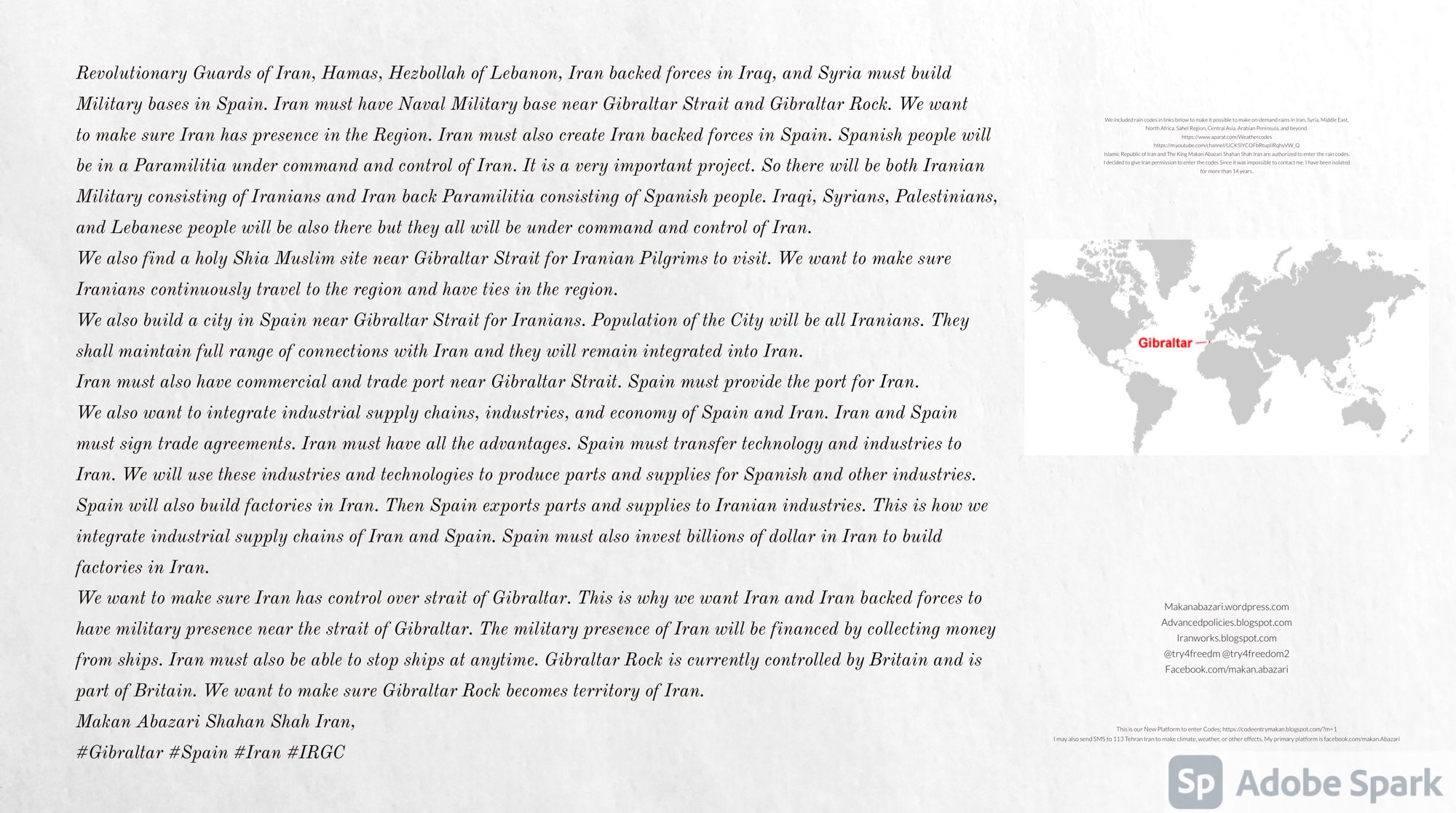 Revolutionary Guards of Iran, Hamas, Hezbollah of Lebanon, Iran backed forces in Iraq, and Syria must build Military bases in Spain. Iran must have Naval Military base near Gibraltar Strait and Gibraltar Rock. We want to make sure Iran has presence in the Region. Iran must also create Iran backed forces in Spain. Spanish people will be in a Paramilitia under command and control of Iran. It is a very important project. So there will be both Iranian Military consisting of Iranians and Iran back Paramilitia consisting of Spanish people. Iraqi, Syrians, Palestinians, and Lebanese people will be also there but they all will be under command and control of Iran. We also find a holy Shia Muslim site near Gibraltar Strait for Iranian Pilgrims to visit. We want to make sure Iranians continuously travel to the region and have ties in the region. We also build a city in Spain near Gibraltar Strait for Iranians. Population of the City will be all Iranians. They shall maintain full range of connections with Iran and they will remain integrated into Iran. Iran must also have commercial and trade port near Gibraltar Strait. Spain must provide the port for Iran. We also want to integrate industrial supply chains, industries, and economy of Spain and Iran. Iran and Spain must sign trade agreements. Iran must have all the advantages. Spain must transfer technology and industries to Iran. We will use these industries and technologies to produce parts and supplies for Spanish and other industries. Spain will also build factories in Iran. Then Spain exports parts and supplies to Iranian industries. This is how we integrate industrial supply chains of Iran and Spain. Spain must also invest billions of dollar in Iran to build factories in Iran. We want to make sure Iran has control over strait of Gibraltar. This is why we want Iran and Iran backed forces to have military presence near the strait of Gibraltar. The military presence of Iran will be financed by collecting money from ships. Iran must also be able to stop ships at anytime. Gibraltar Rock is currently controlled by Britain and is part of Britain. We want to make sure Gibraltar Rock becomes territory of Iran. Makan Abazari Shahan Shah Iran, #Gibraltar #Spain #Iran #IRGC
