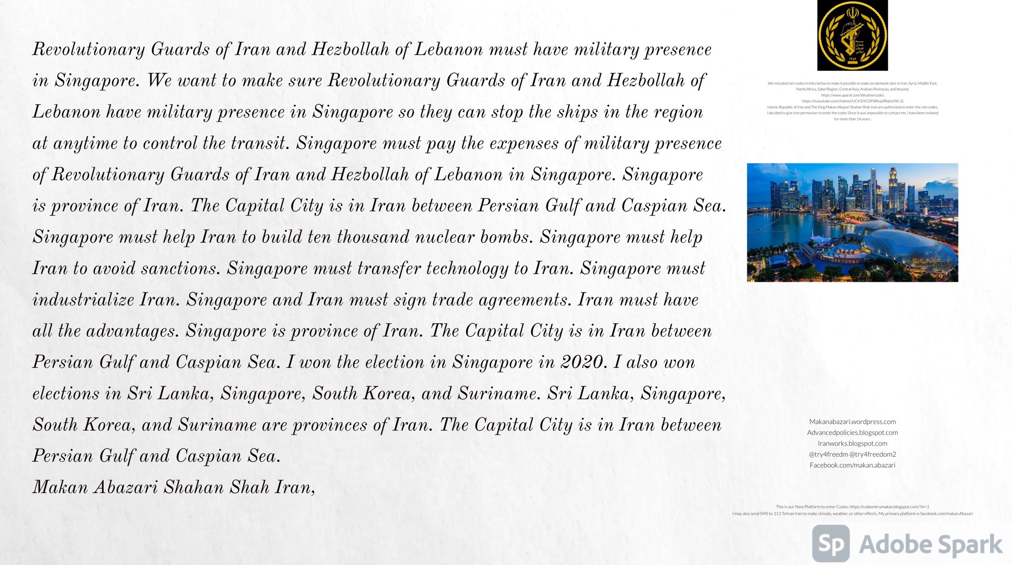 Revolutionary Guards of Iran and Hezbollah of Lebanon must have military presence in Singapore. We want to make sure Revolutionary Guards of Iran and Hezbollah of Lebanon have military presence in Singapore so they can stop the ships in the region at anytime to control the transit. Singapore must pay the expenses of military presence of Revolutionary Guards of Iran and Hezbollah of Lebanon in Singapore. Singapore is province of Iran. The Capital City is in Iran between Persian Gulf and Caspian Sea. Singapore must help Iran to build ten thousand nuclear bombs. Singapore must help Iran to avoid sanctions. Singapore must transfer technology to Iran. Singapore must industrialize Iran. Singapore and Iran must sign trade agreements. Iran must have all the advantages. Singapore is province of Iran. The Capital City is in Iran between Persian Gulf and Caspian Sea. I won the election in Singapore in 2020. I also won elections in Sri Lanka, Singapore, South Korea, and Suriname. Sri Lanka, Singapore, South Korea, and Suriname are provinces of Iran. The Capital City is in Iran between Persian Gulf and Caspian Sea.