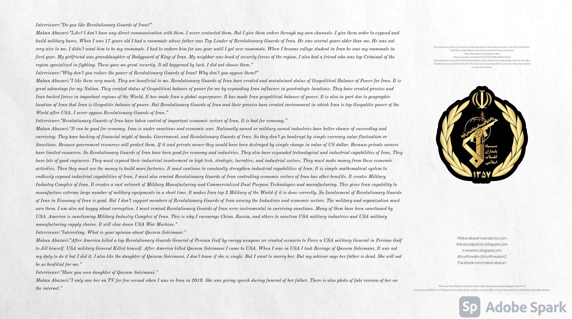 Makan Abazari:”I like them very much. They are beneficial to me. Revolutionary Guards of Iran have created and maintained status of Geopolitical Balance of Power for Iran. It is great advantage for my Nation. They created status of Geopolitical balance of power for me by expanding Iran influence in geostrategic locations. They have created proxies and Iran backed forces in important regions of the World. It has made Iran a global superpower. It has made Iran geopolitical balance of power. It is also in part due to geographic location of Iran that Iran is Geopolitic balance of power. But Revolutionary Guards of Iran and their proxies have created environment in which Iran is top Geopolitic power of the World after USA. I never oppose Revolutionary Guards of Iran.”