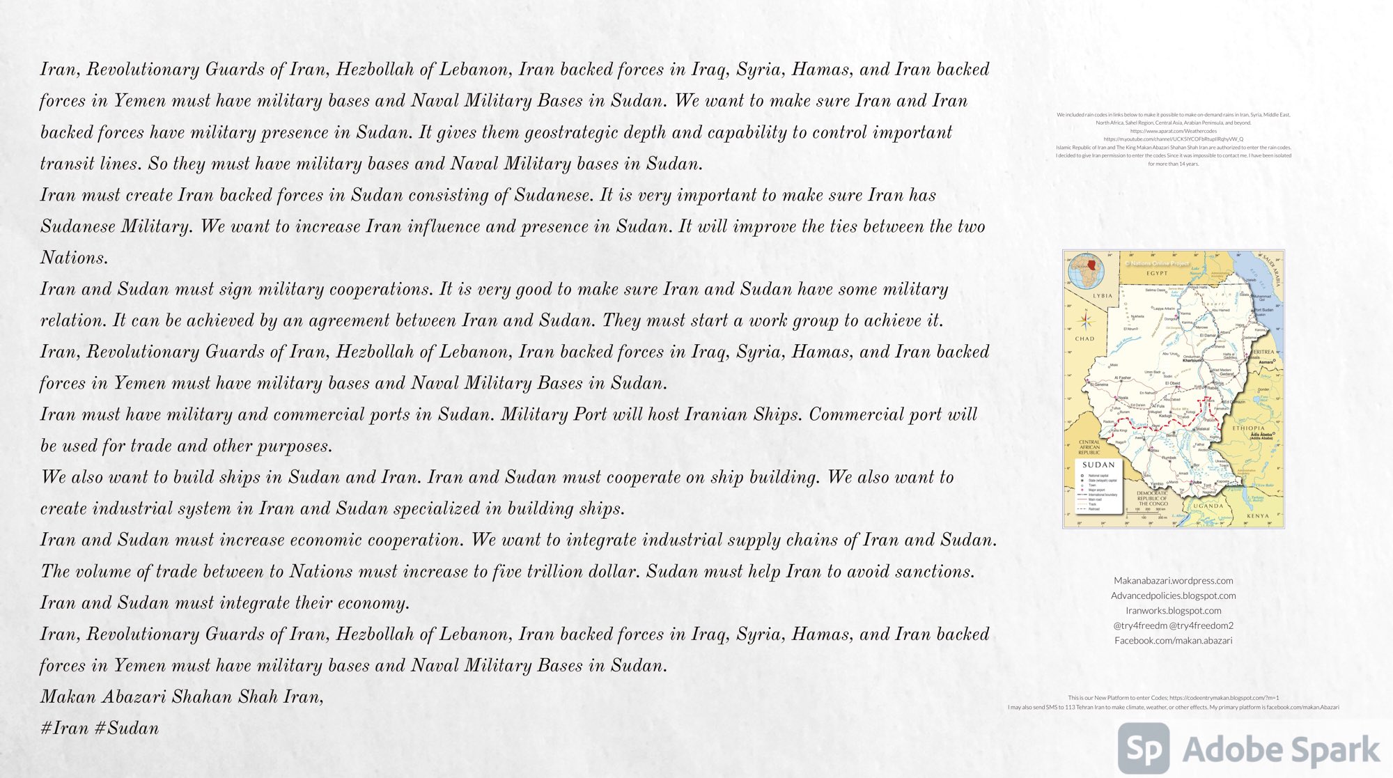 Iran, Revolutionary Guards of Iran, Hezbollah of Lebanon, Iran backed forces in Iraq, Syria, Hamas, and Iran backed forces in Yemen must have military bases and Naval Military Bases in Sudan. We want to make sure Iran and Iran backed forces have military presence in Sudan. It gives them geostrategic depth and capability to control important transit lines. So they must have military bases and Naval Military bases in Sudan. Iran must create Iran backed forces in Sudan consisting of Sudanese. It is very important to make sure Iran has Sudanese Military. We want to increase Iran influence and presence in Sudan. It will improve the ties between the two Nations. Iran and Sudan must sign military cooperations. It is very good to make sure Iran and Sudan have some military relation. It can be achieved by an agreement between Iran and Sudan. They must start a work group to achieve it. Iran, Revolutionary Guards of Iran, Hezbollah of Lebanon, Iran backed forces in Iraq, Syria, Hamas, and Iran backed forces in Yemen must have military bases and Naval Military Bases in Sudan. Iran must have military and commercial ports in Sudan. Military Port will host Iranian Ships. Commercial port will be used for trade and other purposes. We also want to build ships in Sudan and Iran. Iran and Sudan must cooperate on ship building. We also want to create industrial system in Iran and Sudan specialized in building ships. Iran and Sudan must increase economic cooperation. We want to integrate industrial supply chains of Iran and Sudan. The volume of trade between to Nations must increase to five trillion dollar. Sudan must help Iran to avoid sanctions. Iran and Sudan must integrate their economy. Iran, Revolutionary Guards of Iran, Hezbollah of Lebanon, Iran backed forces in Iraq, Syria, Hamas, and Iran backed forces in Yemen must have military bases and Naval Military Bases in Sudan. Makan Abazari Shahan Shah Iran, #Iran #Sudan