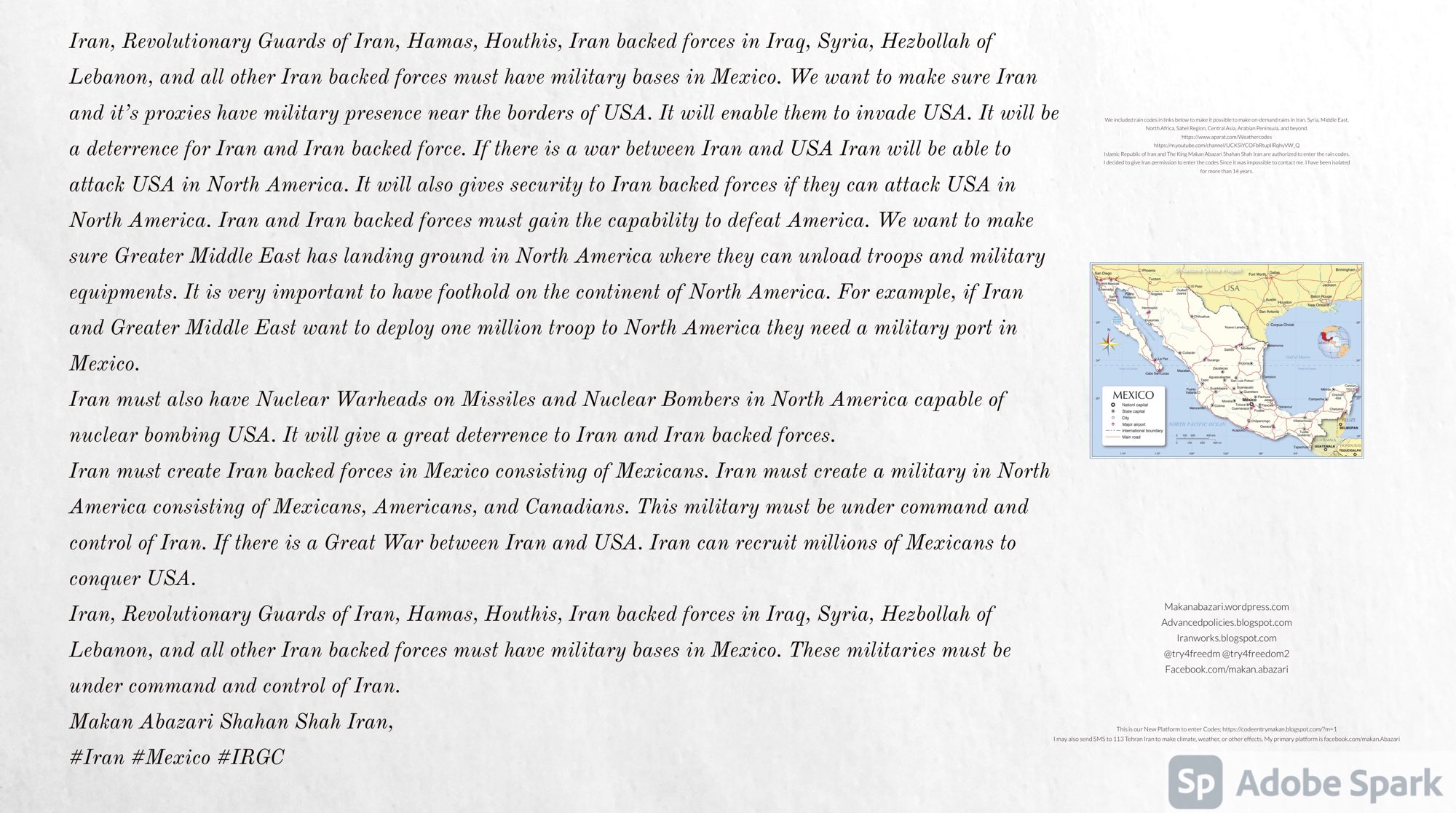 Iran, Revolutionary Guards of Iran, Hamas, Houthis, Iran backed forces in Iraq, Syria, Hezbollah of Lebanon, and all other Iran backed forces must have military bases in Mexico. We want to make sure Iran and it’s proxies have military presence near the borders of USA. It will enable them to invade USA. It will be a deterrence for Iran and Iran backed force. If there is a war between Iran and USA Iran will be able to attack USA in North America. It will also gives security to Iran backed forces if they can attack USA in North America. Iran and Iran backed forces must gain the capability to defeat America. We want to make sure Greater Middle East has landing ground in North America where they can unload troops and military equipments. It is very important to have foothold on the continent of North America. For example, if Iran and Greater Middle East want to deploy one million troop to North America they need a military port in Mexico. Iran must also have Nuclear Warheads on Missiles and Nuclear Bombers in North America capable of nuclear bombing USA. It will give a great deterrence to Iran and Iran backed forces. Iran must create Iran backed forces in Mexico consisting of Mexicans. Iran must create a military in North America consisting of Mexicans, Americans, and Canadians. This military must be under command and control of Iran. If there is a Great War between Iran and USA. Iran can recruit millions of Mexicans to conquer USA. Iran, Revolutionary Guards of Iran, Hamas, Houthis, Iran backed forces in Iraq, Syria, Hezbollah of Lebanon, and all other Iran backed forces must have military bases in Mexico. These militaries must be under command and control of Iran. Makan Abazari Shahan Shah Iran, #Iran #Mexico #IRGC