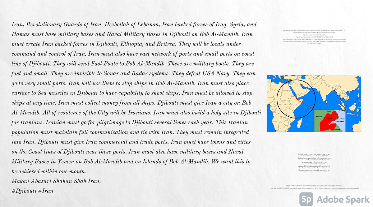Iran, Revolutionary Guards of Iran, Hezbollah of Lebanon, Iran backed forces of Iraq, Syria, and Hamas must have military bases and Naval Military Bases in Djibouti on Bob Al-Mandib. Iran must create Iran backed forces in Djibouti, Ethiopia, and Eritrea. They will be locals under command and control of Iran. Iran must also have vast network of ports and small ports on coast line of Djibouti. They will send Fast Boats to Bob Al-Mandib. These are military boats. They are fast and small. They are invisible to Sonar and Radar systems. They defeat USA Navy. They can go to very small ports. Iran will use them to stop ships in Bob Al-Mandib. Iran must also place surface to Sea missiles in Djibouti to have capability to shoot ships. Iran must be allowed to stop ships at any time. Iran must collect money from all ships. Djibouti must give Iran a city on Bob Al-Mandib. All of residence of the City will be Iranians. Iran must also build a holy site in Djibouti for Iranians. Iranian must go for pilgrimage to Djibouti several times each year. This Iranian population must maintain full communication and tie with Iran. They must remain integrated into Iran. Djibouti must give Iran commercial and trade ports. Iran must have towns and cities on the Coast lines of Djibouti near these ports. Iran must also have military bases and Naval Military Bases in Yemen on Bob Al-Mandib and on Islands of Bob Al-Mandib. We want this to be achieved within one month. Makan Abazari Shahan Shah Iran, #Djibouti #Iran