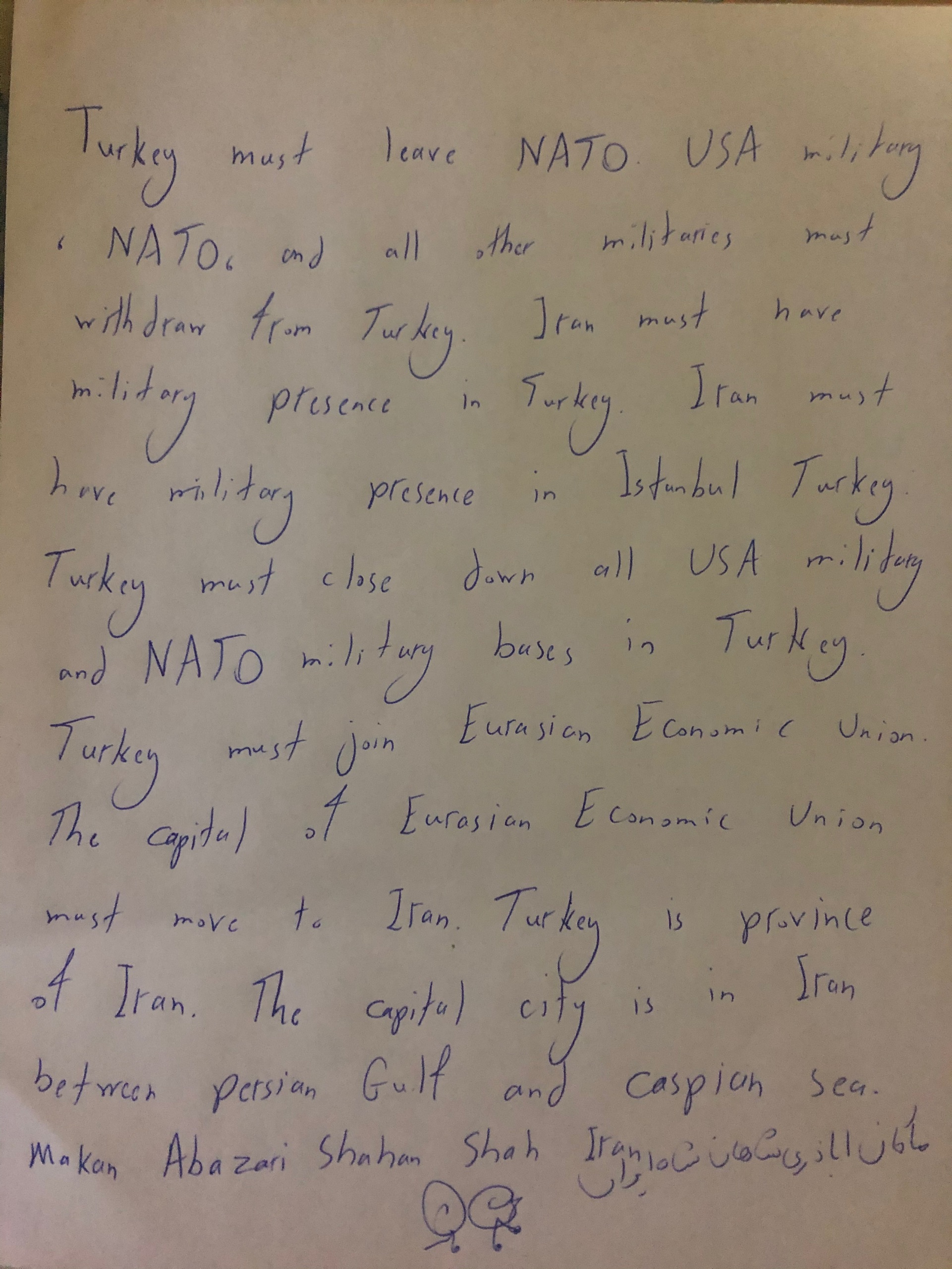 Iran and Turkey must cooperate in field of Military. Iran, Iraq, Afghanistan, Syria, Lebanon, Saudi Arabia, Yemen, Oman, Somalia, Somaliland, Sudan, Egypt, Libya, Tunisia, and Turkey must sign Military Alliance. Iran must lead them. Their command and control and their headquarters must be in Iran between Persian Gulf and Caspian Sea. Iran chooses their policies, their geoplitics, diplomacy, politic, and other things. They must always obey Iran. They must be under permanent command and control of Iran. Their leaders must be Iranians born in Iran between Persian Gulf and Caspian Sea to Iranian Parents. Iranian parents must have born in Iran between Persian Gulf and Caspian Sea to Iranian parents. They are not allowed in Iran. Iran must have military presence in Turkey, Iraq, Syria, Jordan, Palestine, Israel, Yemen, Somalia, Somaliland, Eritrea. Djibouti, Ethiopia, Sudan, Egypt, Tunisia, azerbaijan, armenia, georgia, afghanistan, Turkmanistan, Palestine, and Israel. NATO, USA, and all other militaries must leave Iran, Middle East, Horn of Africa, and Greater Middle East. Turkey must leave NATO. Turkey must join Eurasian Economic Union. Iran must become permanent member of Eurasian Economic Union. The Capital and Headquarters of Eurasian Union must permanently relocated to Iran. Iran and Turkey must hold military exercise in Balkan and East Europe. Iran and Turkey must have military bases in East Europe, Balkan, Spain, and Washington DC. Iran and Turkey must sigh a military alliance for mutual defense. Iran and Turkey must not go into war. Wars in Middle East must be prevented. Iran and Turkey must be ready to defend Middle East against Invaders.