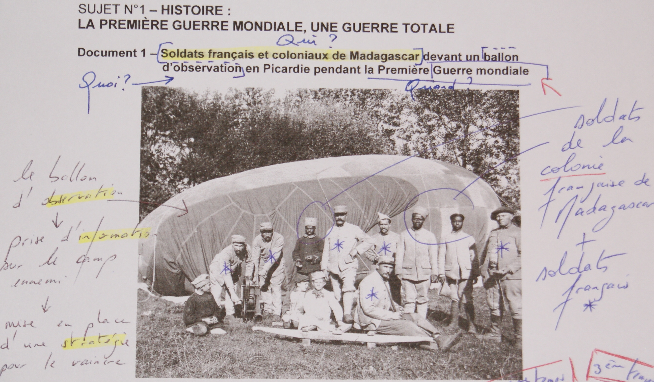 Exemple de réponse : "D’après ce document, l’armée française recourt aux soldats de métropole et des colonies (ici des Malgaches). Le ballon d’observation permet de prendre des informations sur le camp ennemi afin d’élaborer une stratégie pour le vaincre."