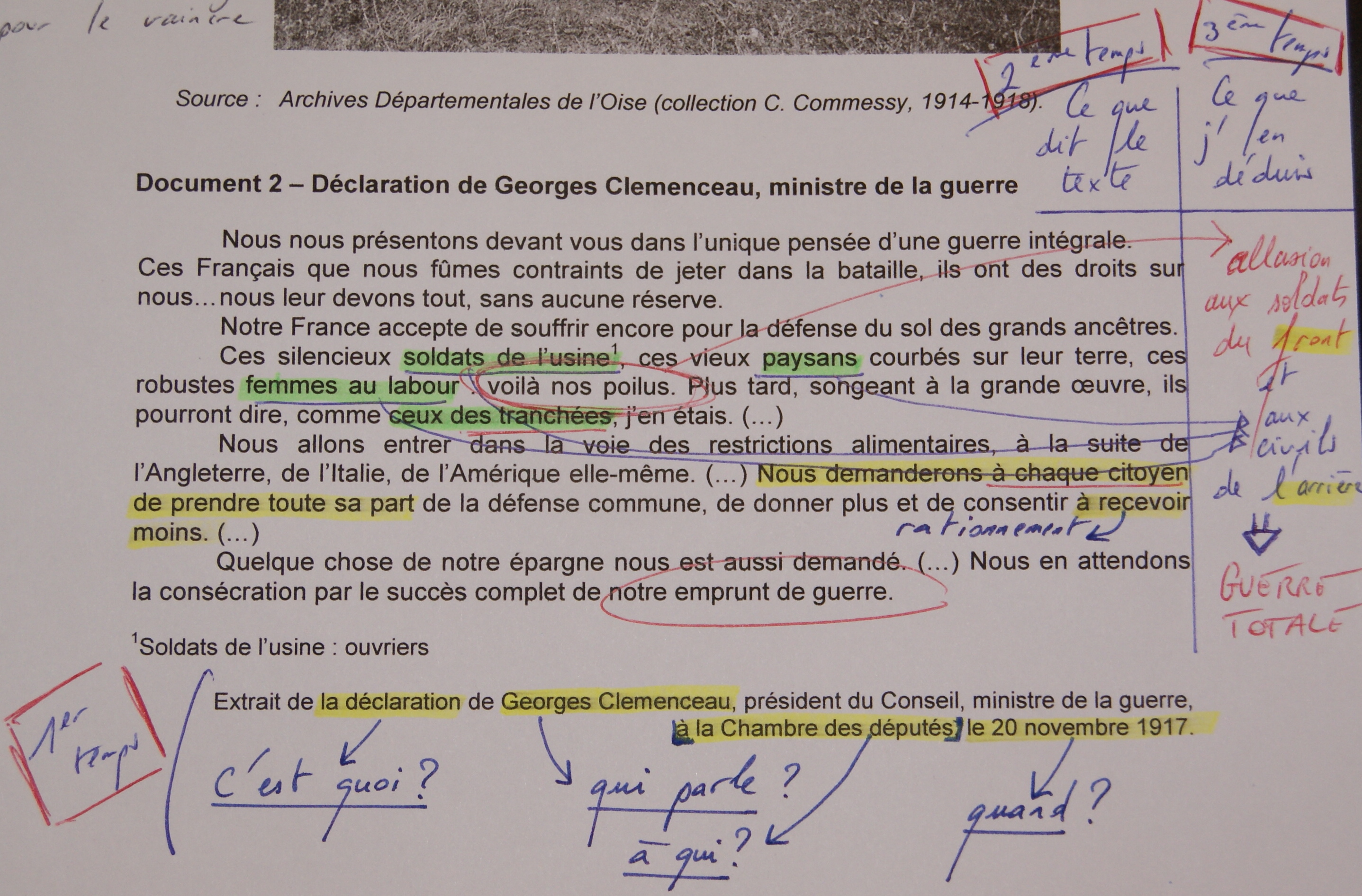 Pour étudier un texte, il faut d’abord s’intéresser au titre et à la source pour pouvoir répondre à ces questions. C’est quoi ? Un discours, une lettre, une loi, … Qui est l’auteur ? A qui s’adresse t-il ? Quand ? Pourquoi ? En lisant le texte, je souligne, entoure ce qui est important (je pars d’abord du document pour répondre) et je reporte mes commentaires en marge (mes connaissances personnelles apportent un plus à ma réponse).