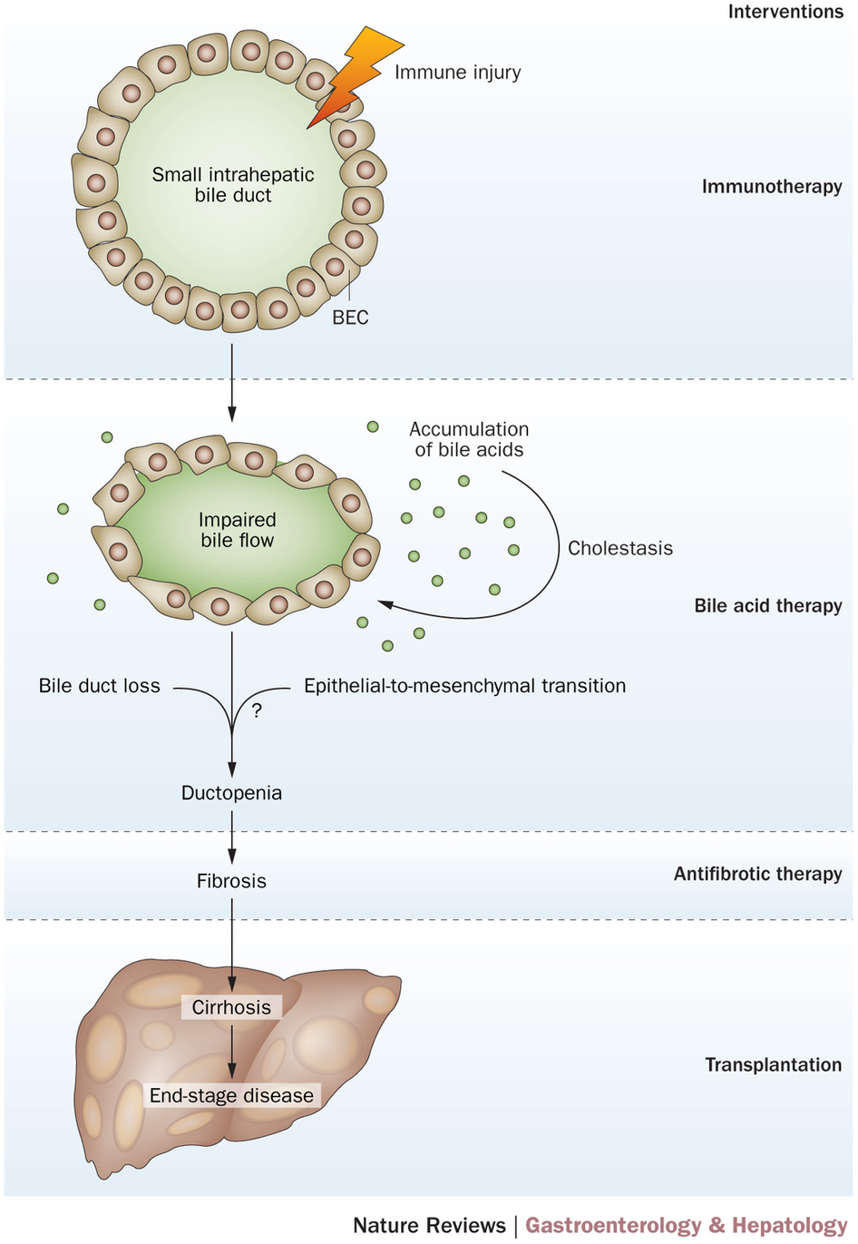 The inflammation of primary biliary cirrhosis begins when T lymphocytes (T cells) start accumulating in your liver. Normally, T cells recognize and help defend against harmful invaders, such as bacteria. But in primary biliary cirrhosis, the T cells invade and destroy the cells lining the small bile ducts in your liver. Inflammation in the smallest ducts spreads, in time, and destroys nearby liver cells. As these cells are destroyed, they're replaced by scar tissue (fibrosis) that can contribute to cirrhosis. Cirrhosis is scarring of liver tissue that makes it difficult for your liver to carry out essential functions. (Mayo Clinic)