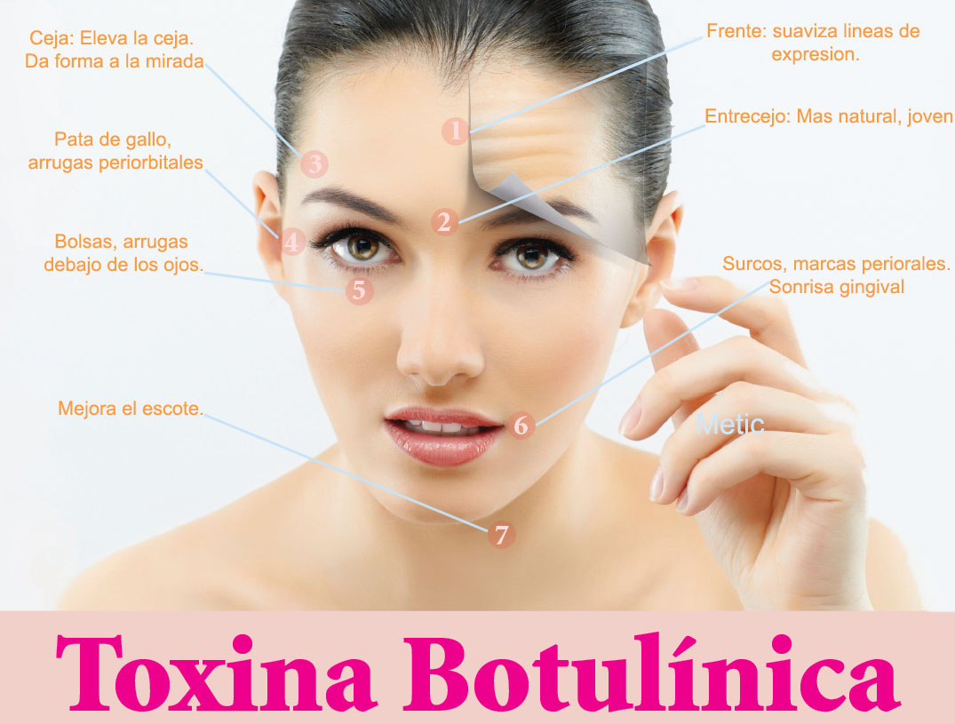 La toxina botulínica está indicado para las líneas de expresión del tercio superior del rostro (pata de gallo, entrecejo y frente), para cuello, escote y también se aplica para modelar las cejas caídas (devolviéndole vida a la mirada).
