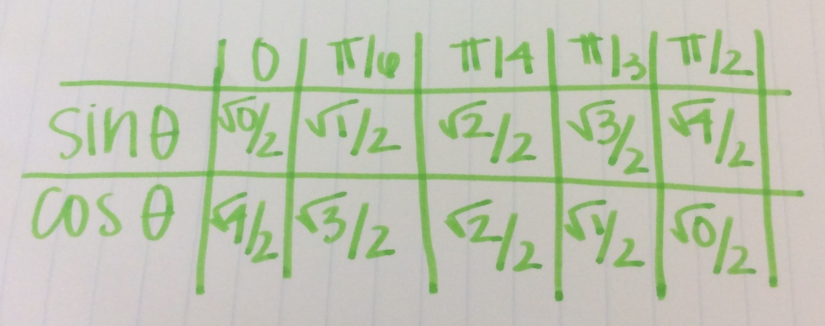 One of the coolest things about the unit circle, is that once you learn all the angle, you can easily find the value of that angle. This is the mnemonic device for the unit circle. Pretty cool how math works sometimes! Hope these tips helped :)