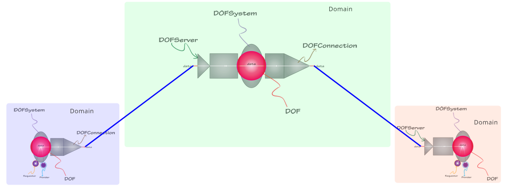 Taking what we've learned, let's start putting it into perspective. We will use a simplified illustration (above) to begin showing you the possibilities. In the Blue domain, our DOFConnection is establishing a connection with the Green domain, and Green is passing Blue's data on to the Orange domain.