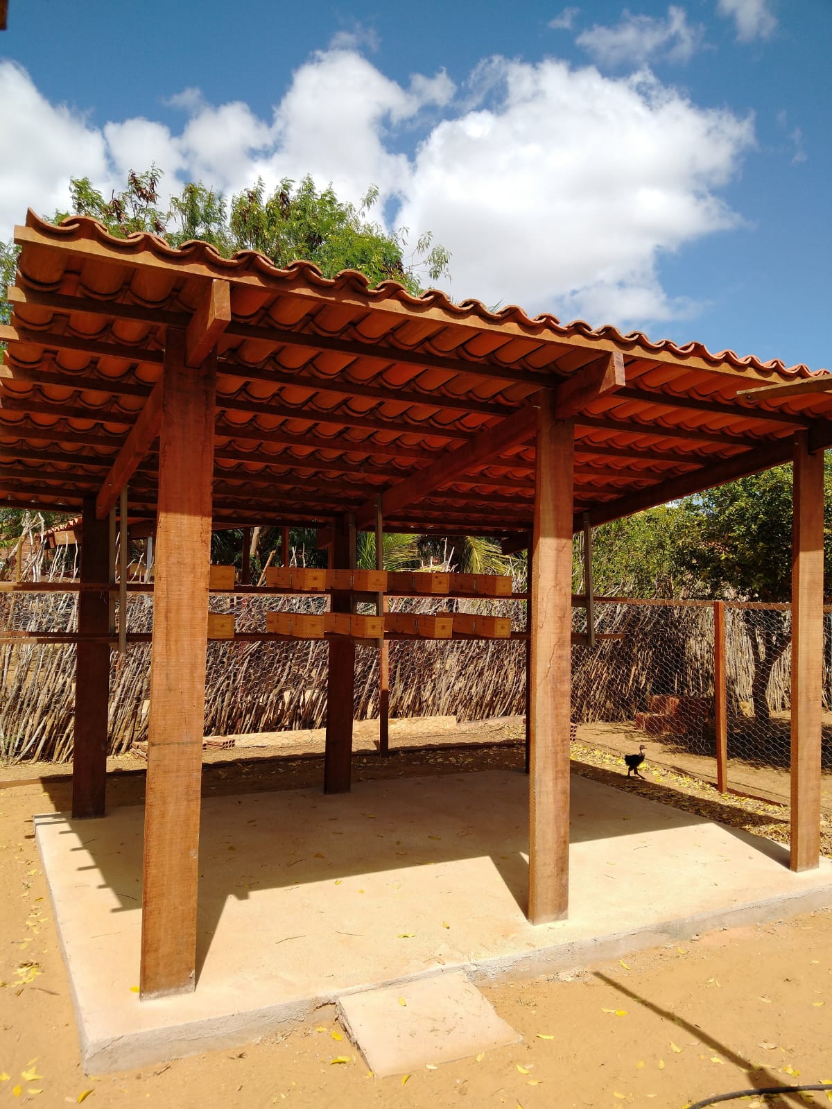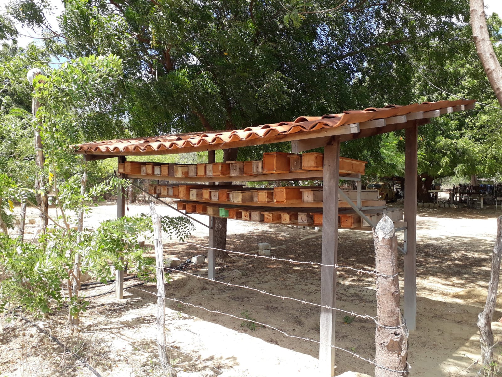 Embaixo do telhado, dezenas de caixas de madeira abrigam as abelhas nativas, que têm garantia de sombra e conforto térmico. No mesmo jardim existe o Cisternão, uma cisterna que armazena água da chuva pra depois ser distribuída ao sistema de irrigação da Caatinga na época de seca.
