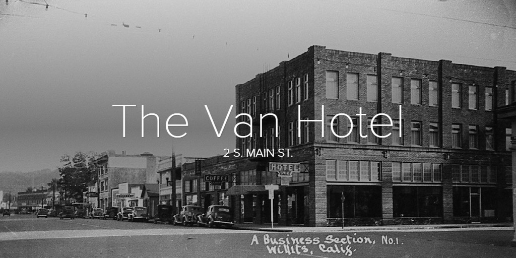 Gordon Wagenet, who moved to Willits in 1946, could still call the Van Hotel “Willits’s finest, situated across from the weather-beaten old Willits Hotel.” However, he added, “it, too, was slowly sliding into oblivion. Our room cost $4 per night. A bare 40-watt light bulb hung over the bed and one chair completed the furnishings. The bathroom was down the hall.” ( 2. )
