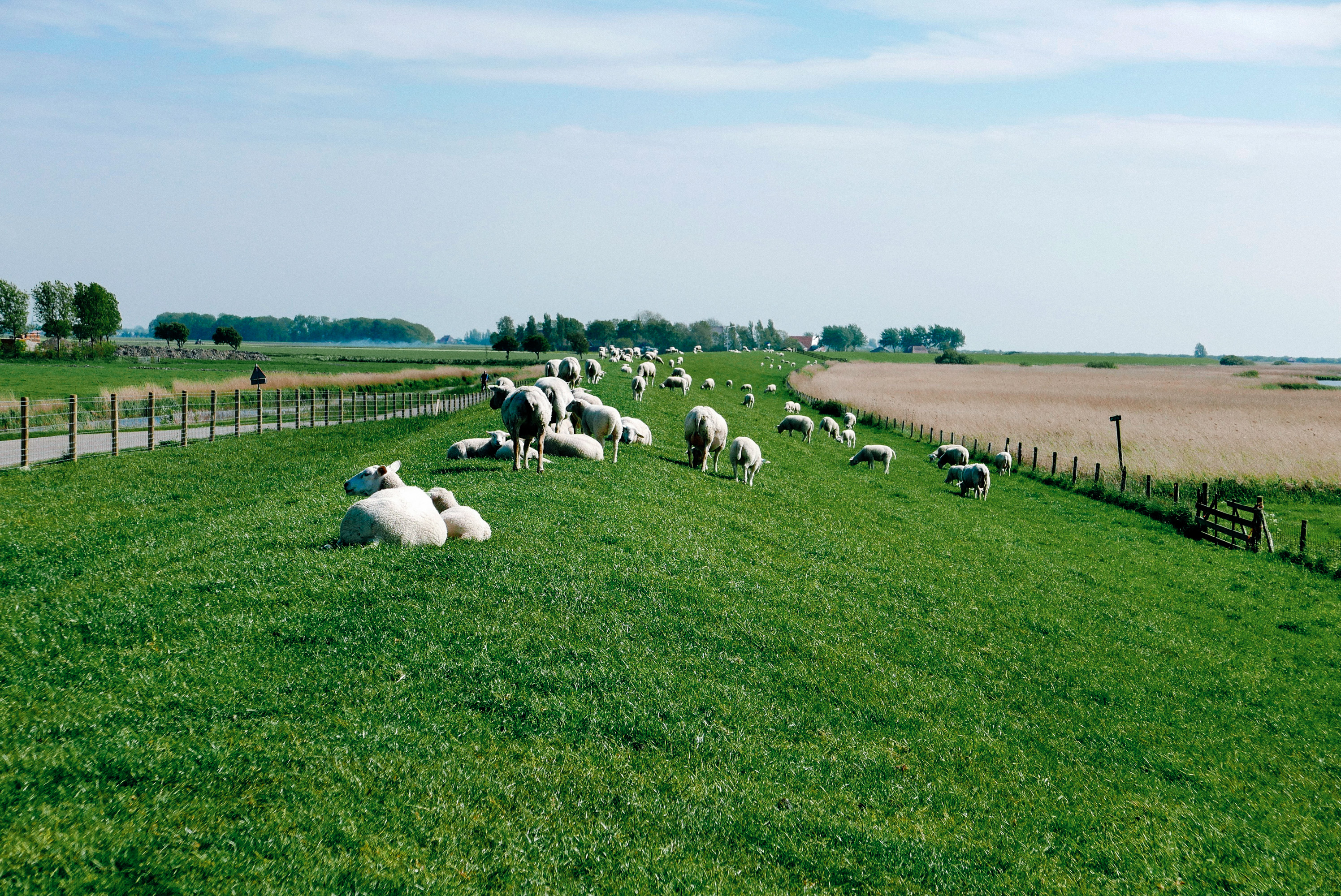 물이 넘어오는 것을 맊기 위해 흙으로 쌓아 놓은 둑은 양들이 한가히 풀을 뜯는 휴식처이다