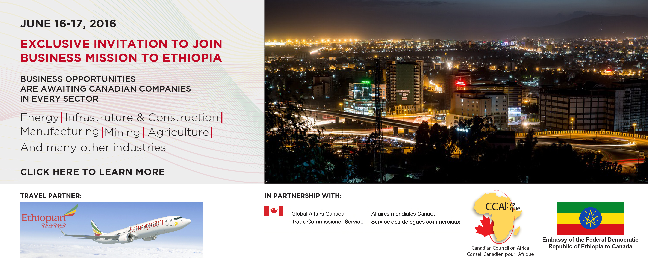 The Canadian Council on Africa is pleased to announce the upcoming Business Trade Mission to Ethiopia, June 15-17, 2016.