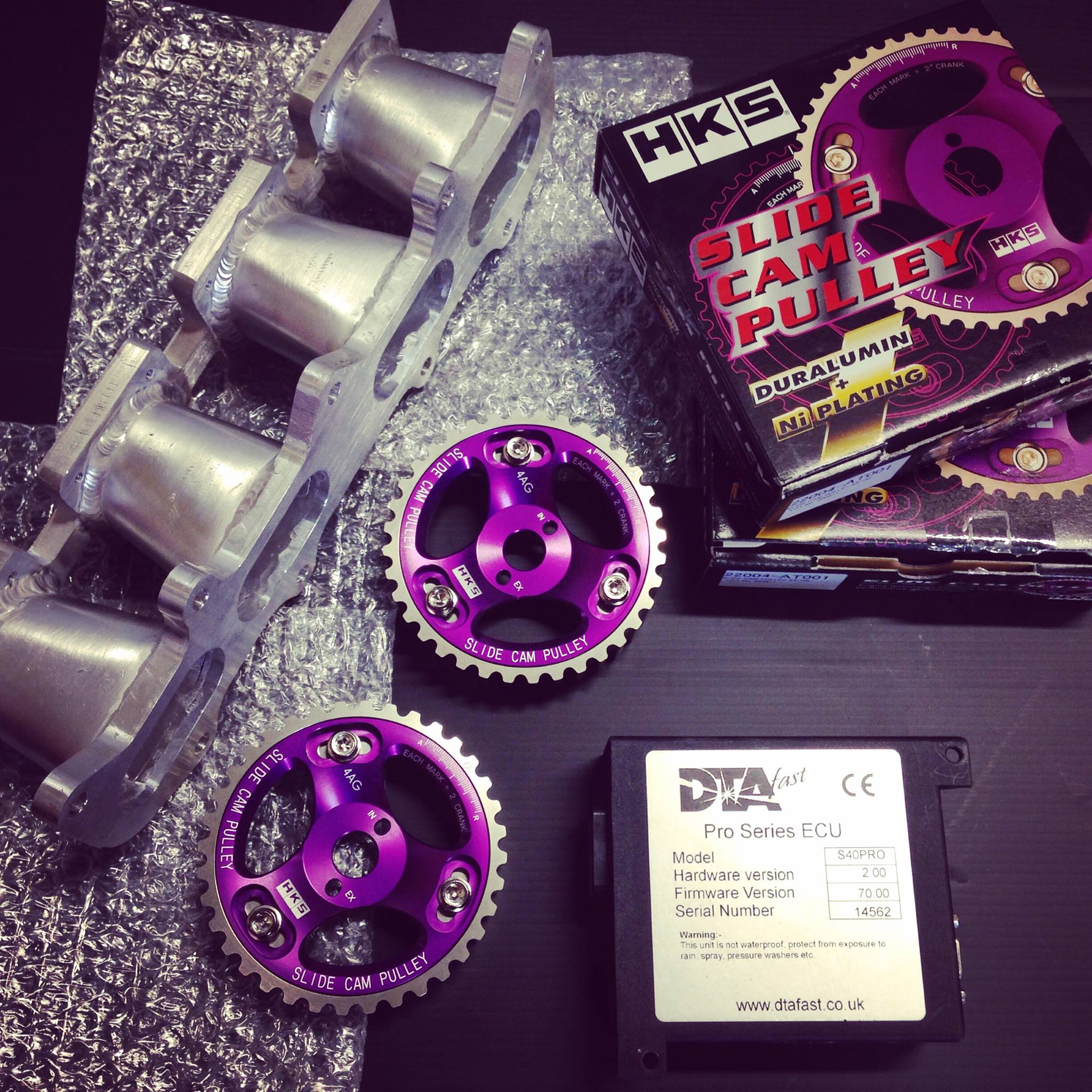 Honestly the thing I have enjoyed most about doing this 86 has been learning and understanding my car better. I'm an avid lover of the 16v 4age so decided to stick running the one I took out of the car and "improve" it slightly. As I said earlier I have picked up a lot from Garys Rally car build. His B16 runs Jenvey ITB's and well, whats good for the goose is good for the gander! I toyed around with the idea of Carbs for a while and was tempted by the common 20v ITB conversion but pushed a little bit further and went for Tapered Jenvey 45's with custom manifold. This will be ran with a DTA ecu and custom engine loom. Iv picked up a few HKS goodies along the way too (thanks Gary) I as write I am still undecided about cams.....