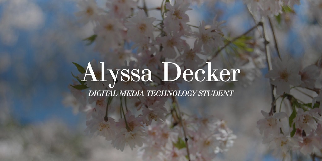 My name is Alyssa Decker and I am currently studying Digital Media Technology and Graphic Design at Eastern Illinois University. I am passionate about a variety of media, but most enjoy graphic design and photography. I hope to graduate in December of 2023 with my degree so that I may pursue a career in graphic design. Included in this portfolio page are examples of my work form class and personal projects.