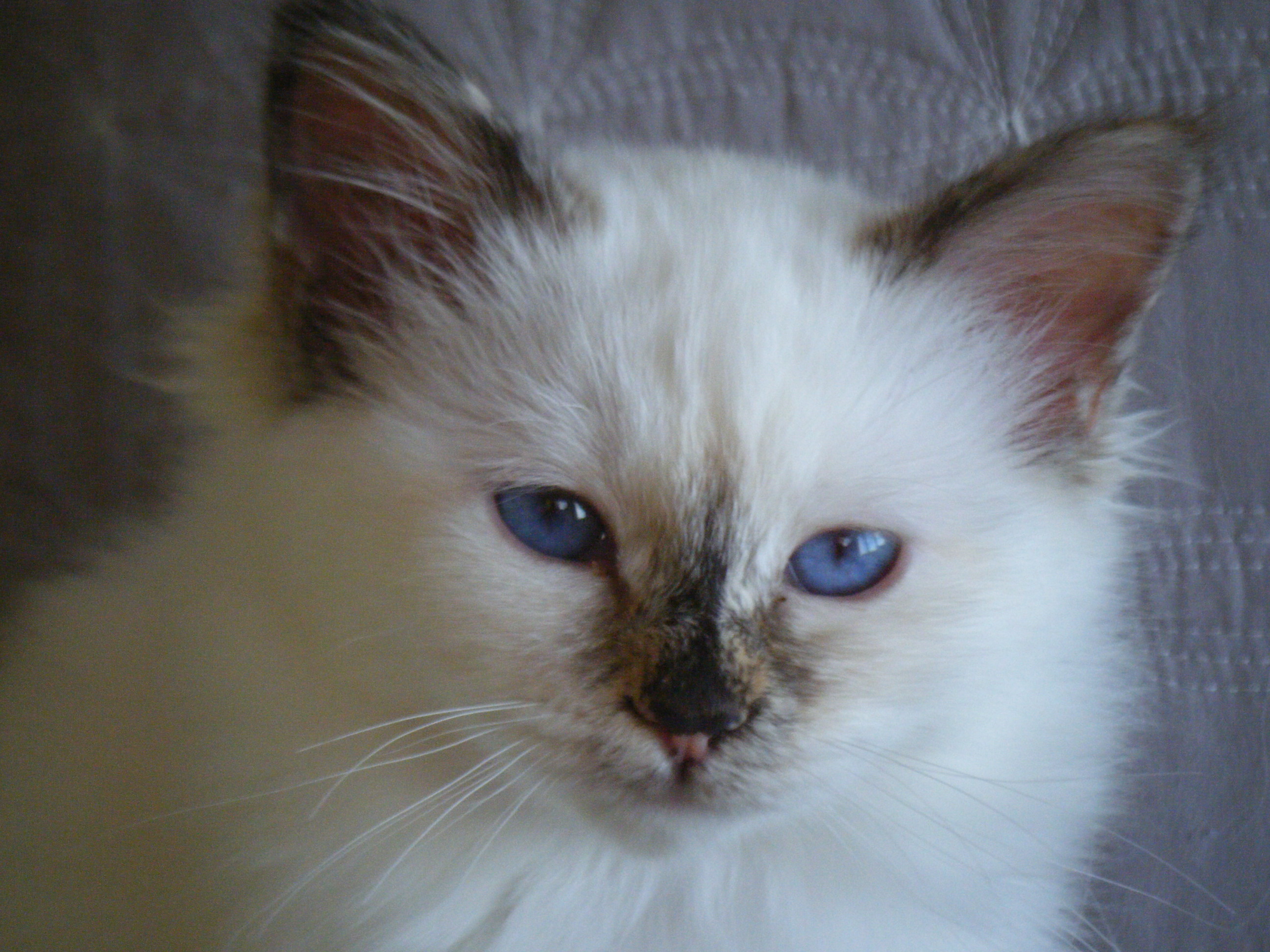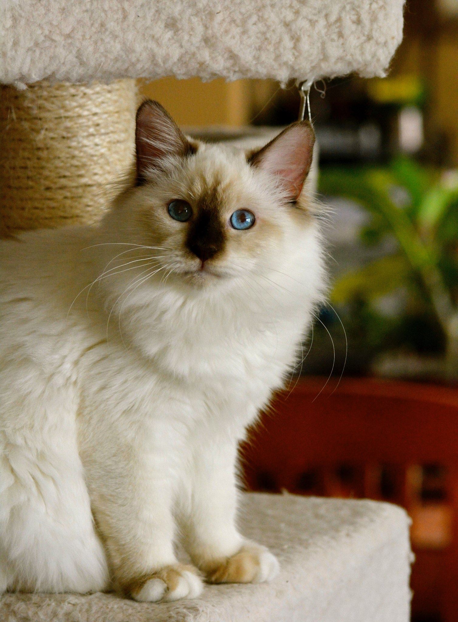 Birmans are middle-hair cats with a silky coat that doesn't mate (unfortunately, surging from Persian lines that didn't respect the siamese rule incorporation, some lines have more Persian-like hair). Birmans have a white bleaching of the body, except at the warm extremities (points) which preserve the original color. Birmans have blue eyes, a fluffy tail and white gloves on their paws. They are generally alpha cats with some exceptions. Intelligent & elegant cats, playful & human-oriented, communicative, they follow you in the house and always try to get your attention. They make wonderful companion and need sensitive human companions.