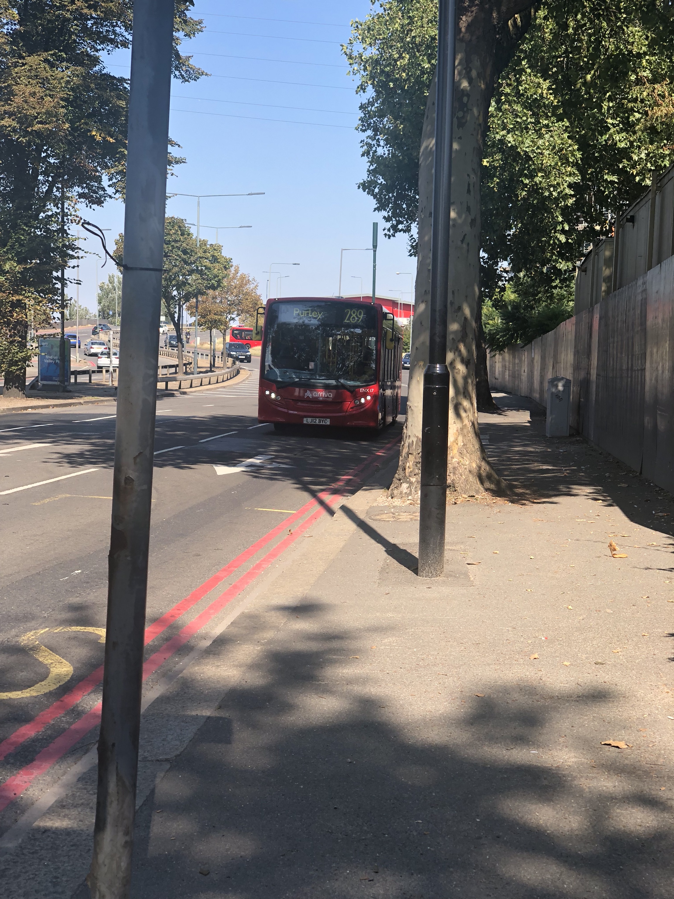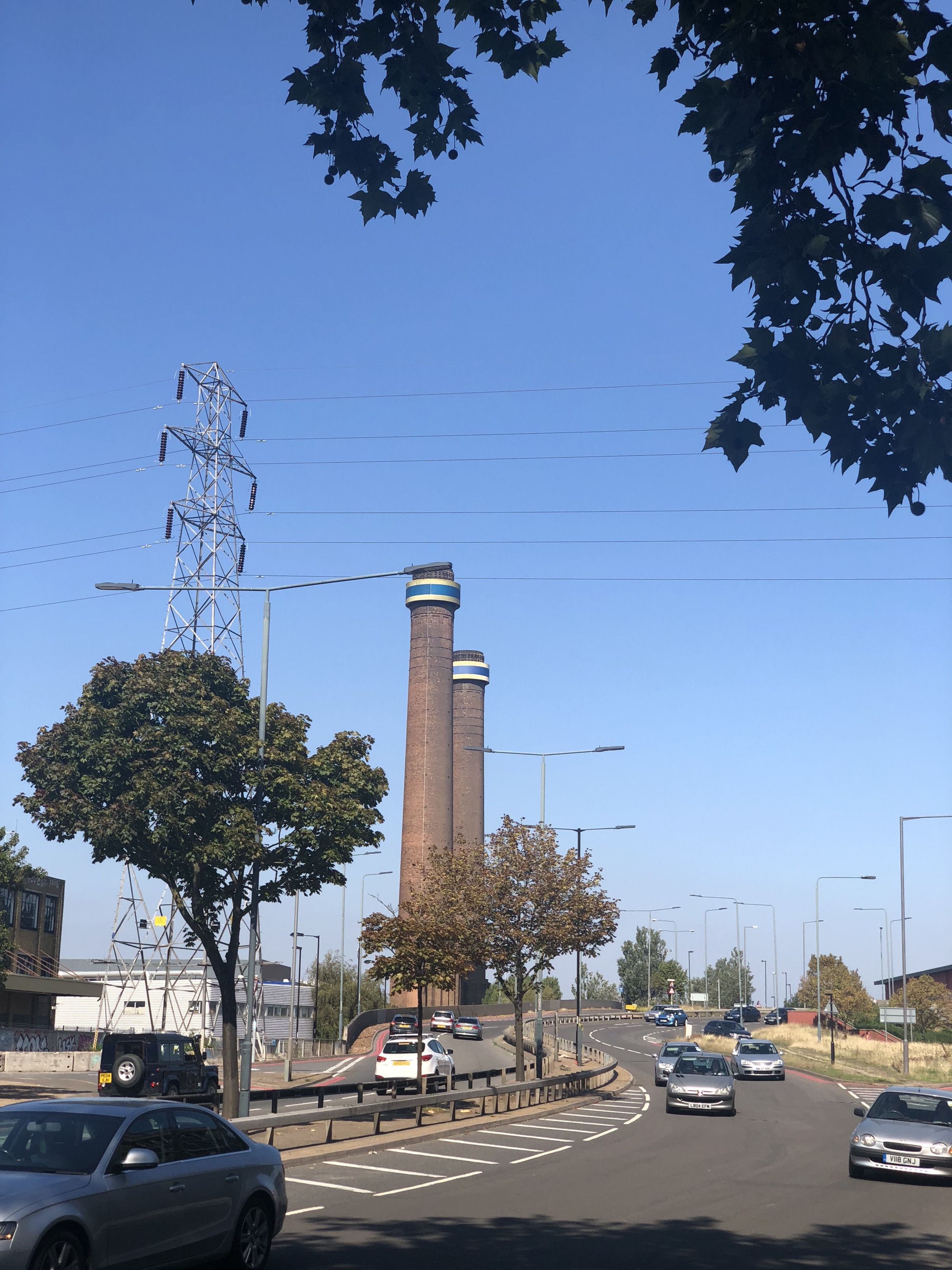Half an hour or so later, Helen is still glued to her phone staring at a range of small greenhouses and planters made from wood while I'm full of "oi! We're in Croydon! Start judging!" enthusiasm. We're here at Waddon Marsh, next to a fairly miserable retail park and a bus stop that's no longer in use. Oh. Well, up and on the Purley Way there's another bus stop, with the glory of Croydon B's Ikea-branded chimneys staring down at us.
